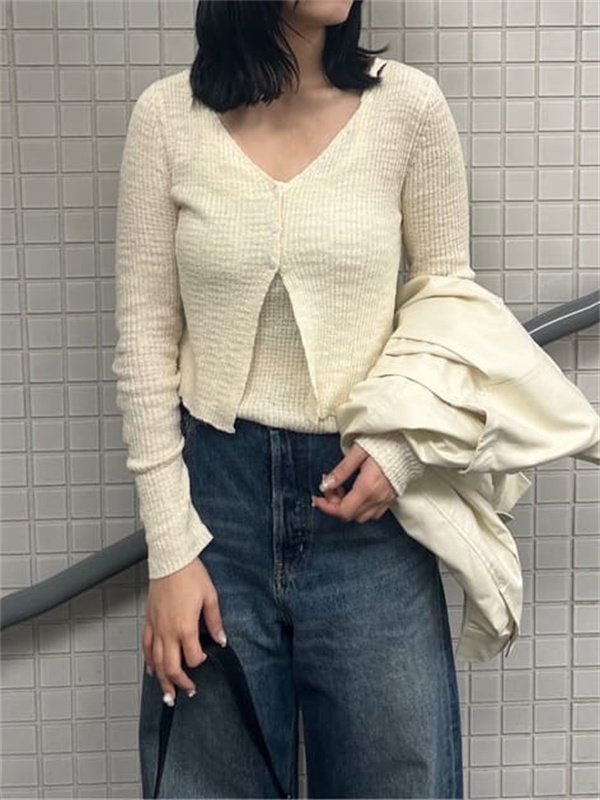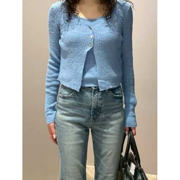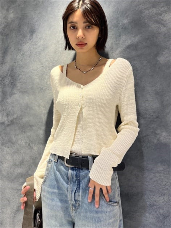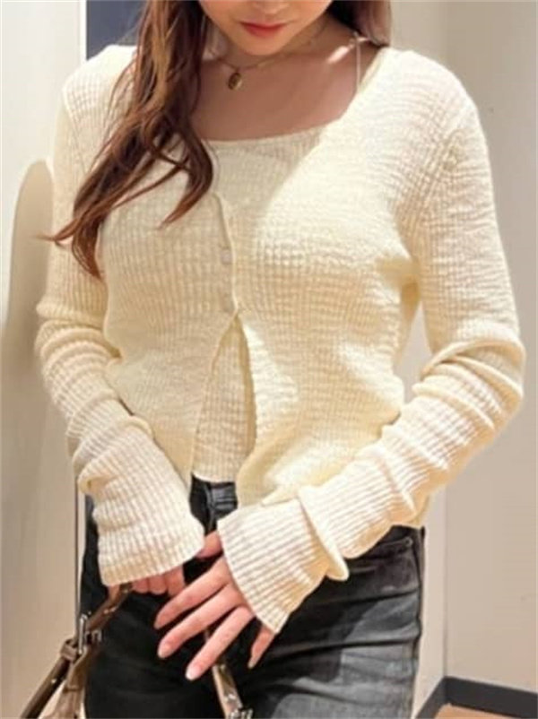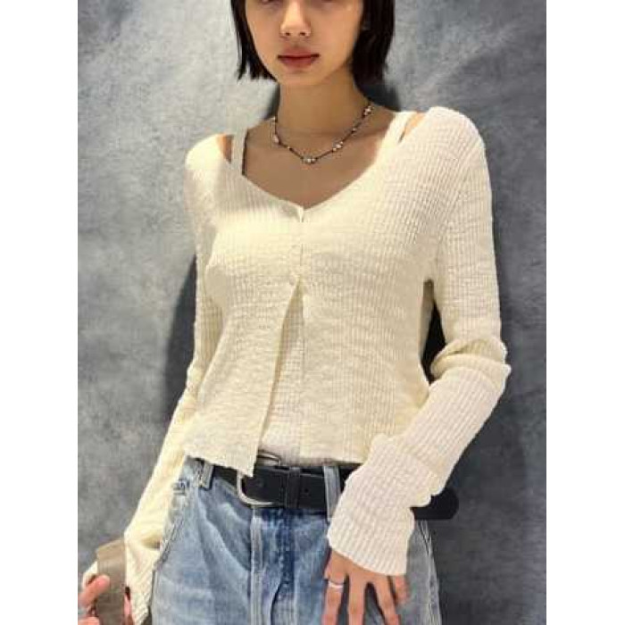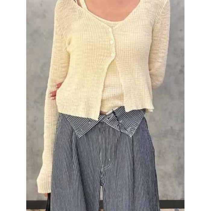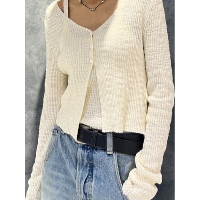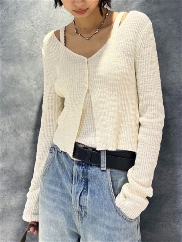 M家時尚百搭修身顯瘦V領長袖針織開衫+吊帶兩件套