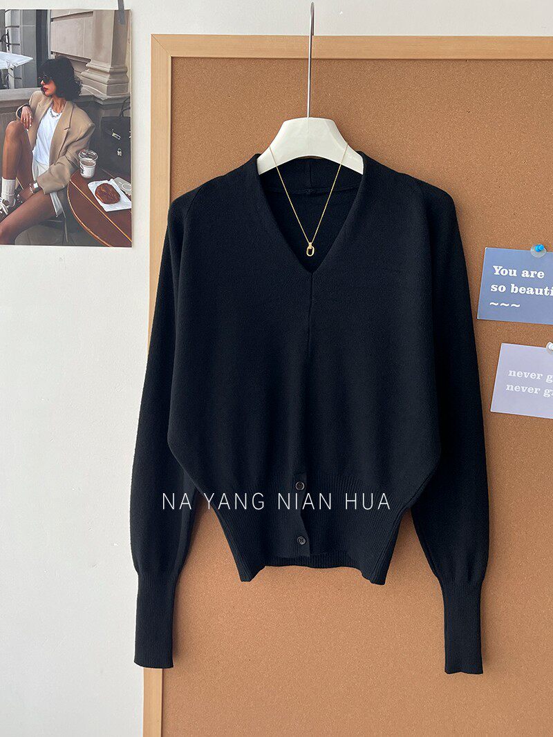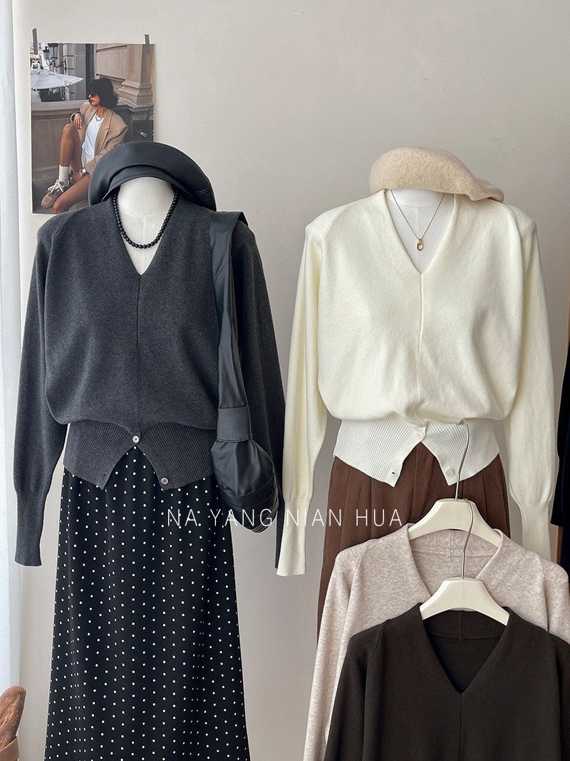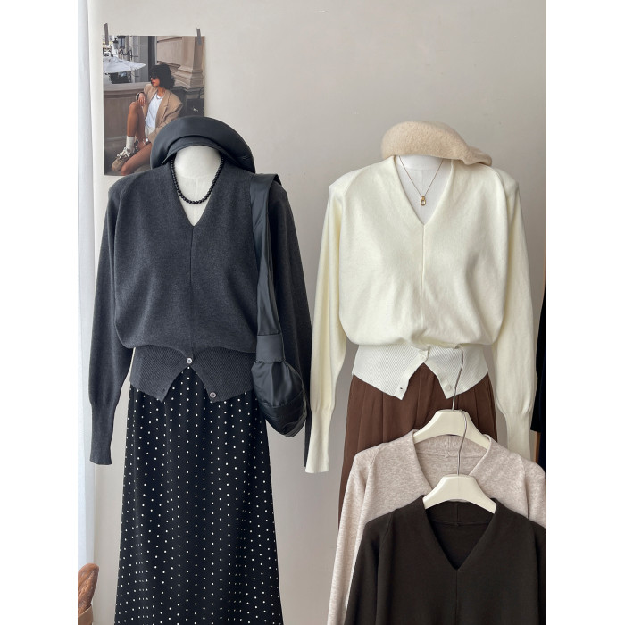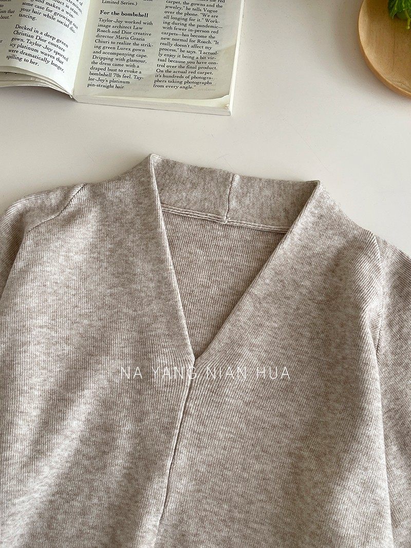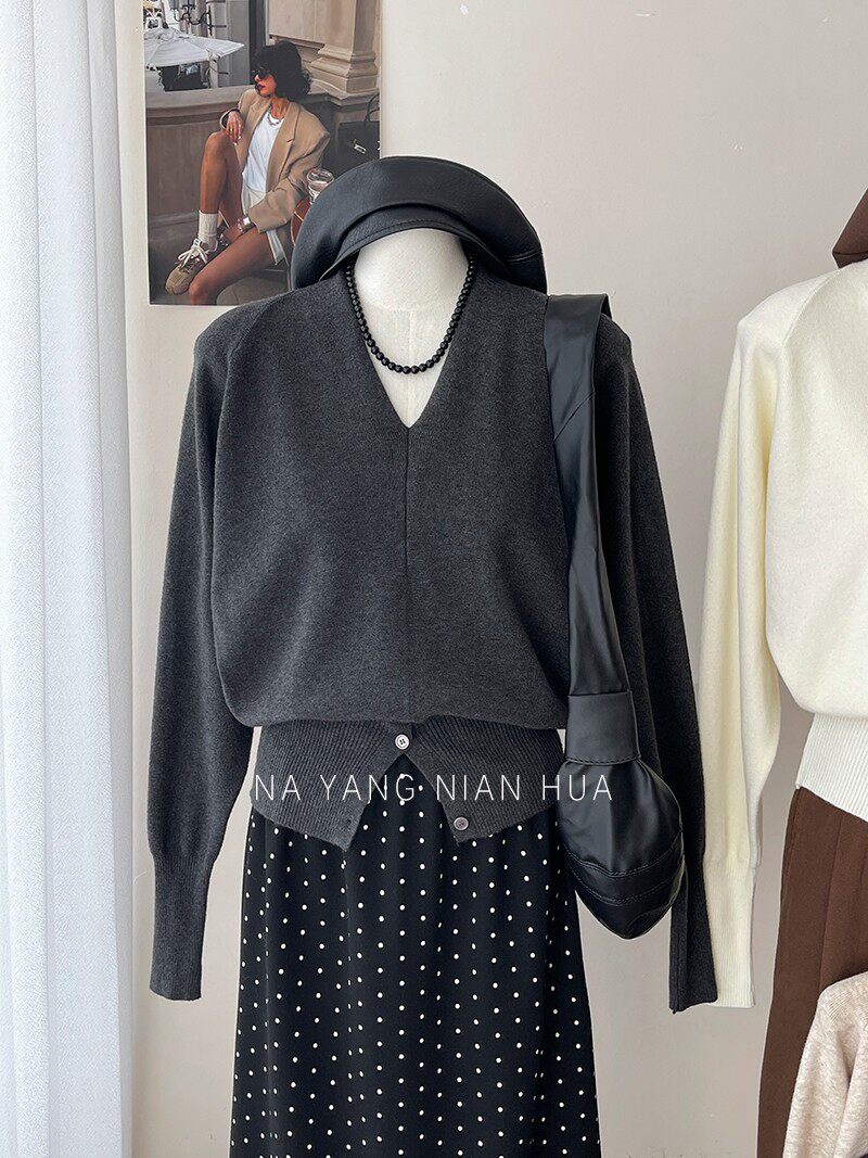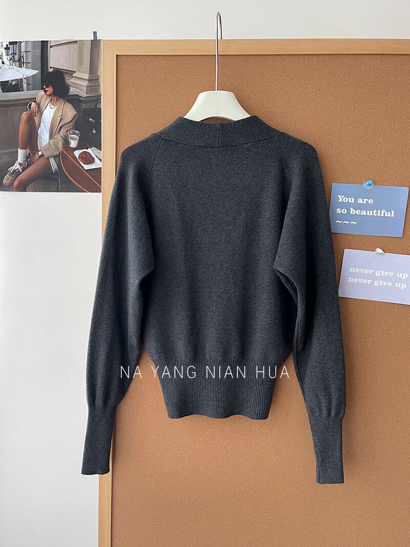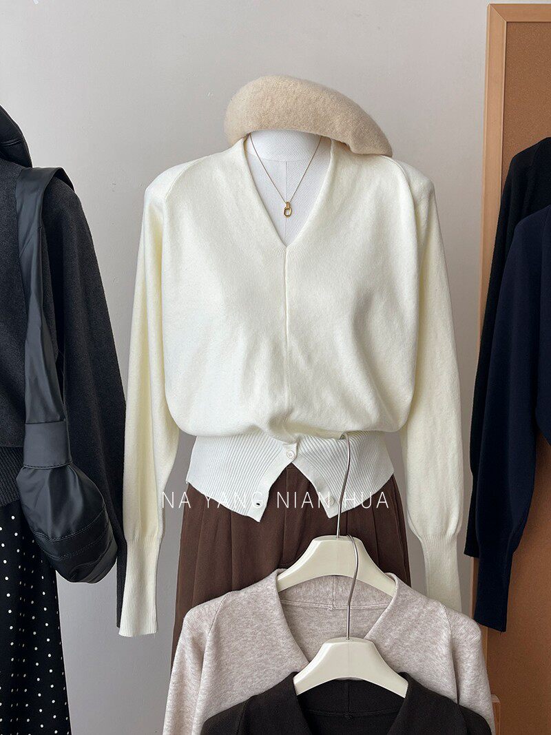 法式老錢風收腰開叉軟糯V領針織衫女秋冬復古百搭洋氣質打底上衣