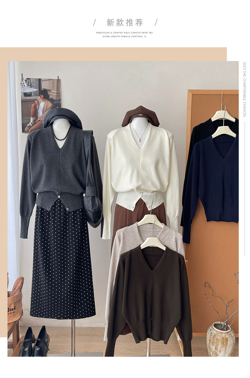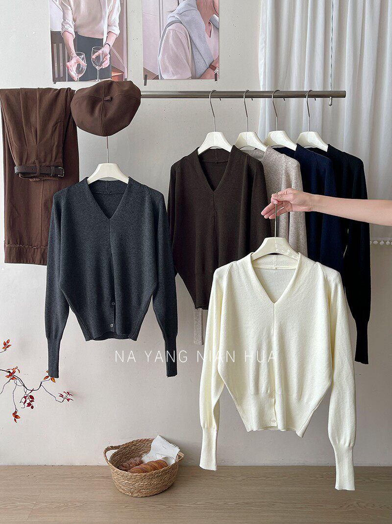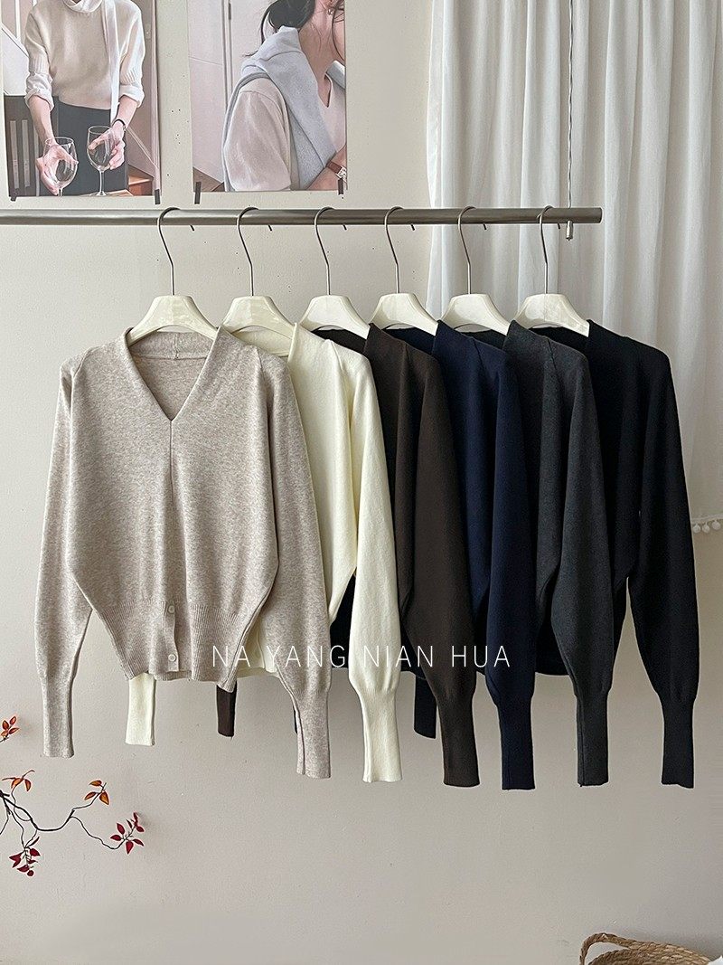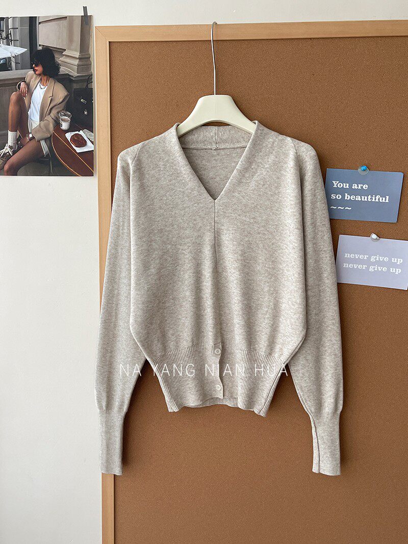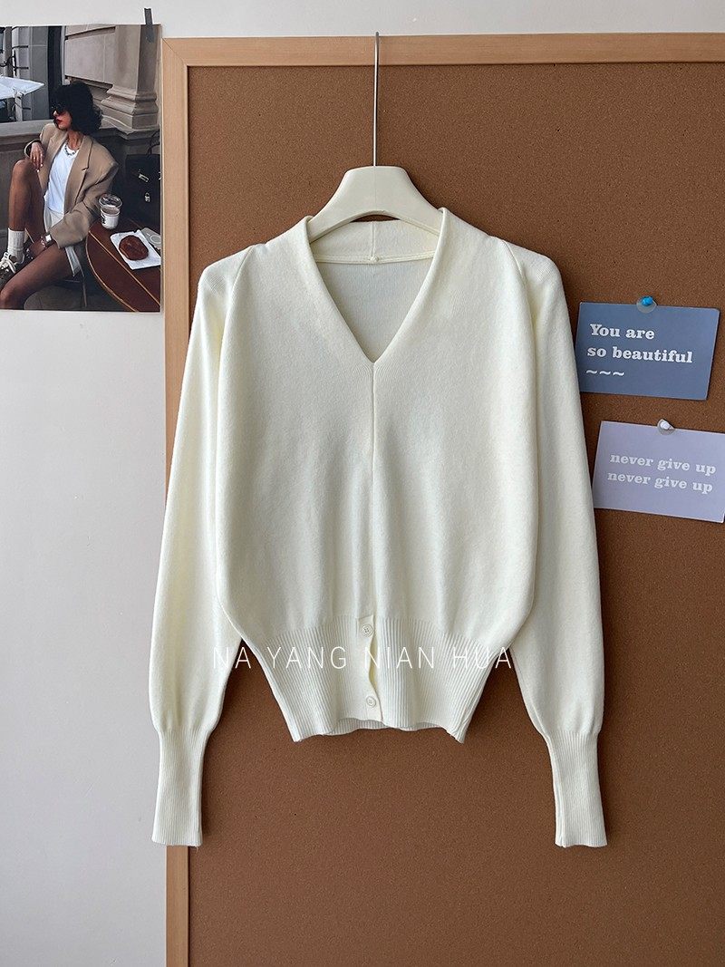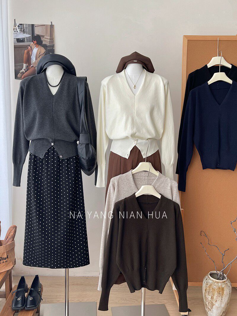 法式老錢風收腰開叉軟糯V領針織衫女秋冬復古百搭洋氣質打底上衣