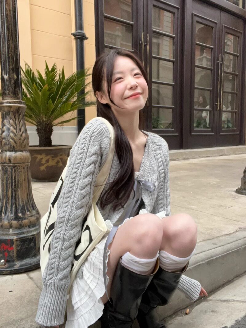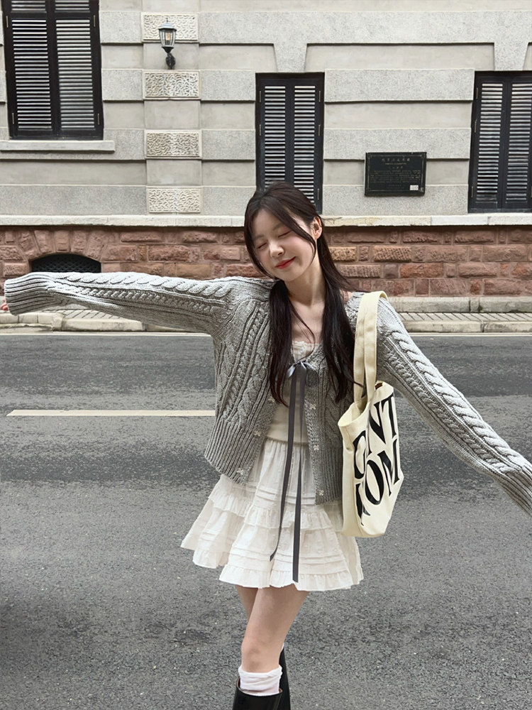 蝴蝶結灰色v領麻花毛衣開衫女早秋溫柔慵懶寬松外搭短款針織外套
