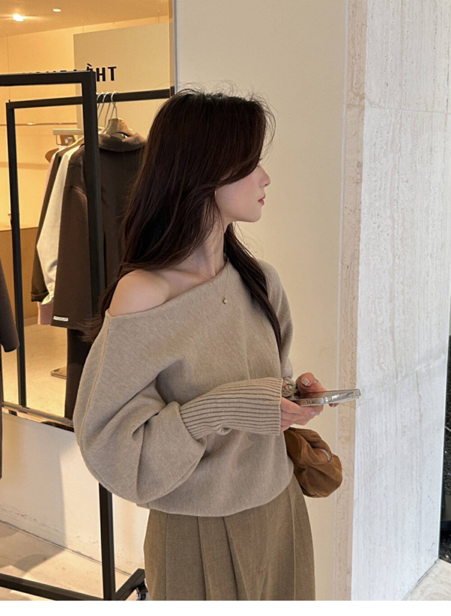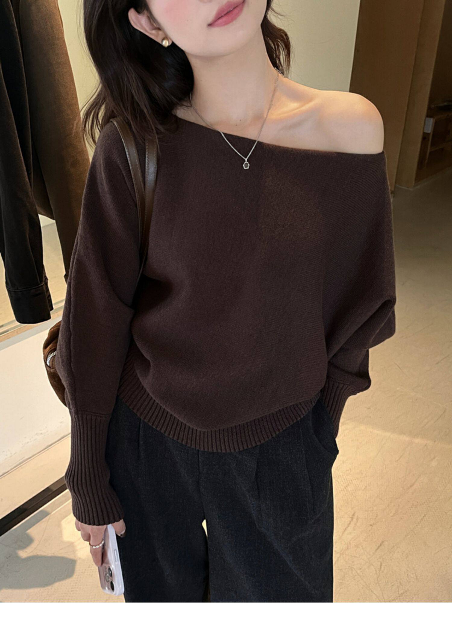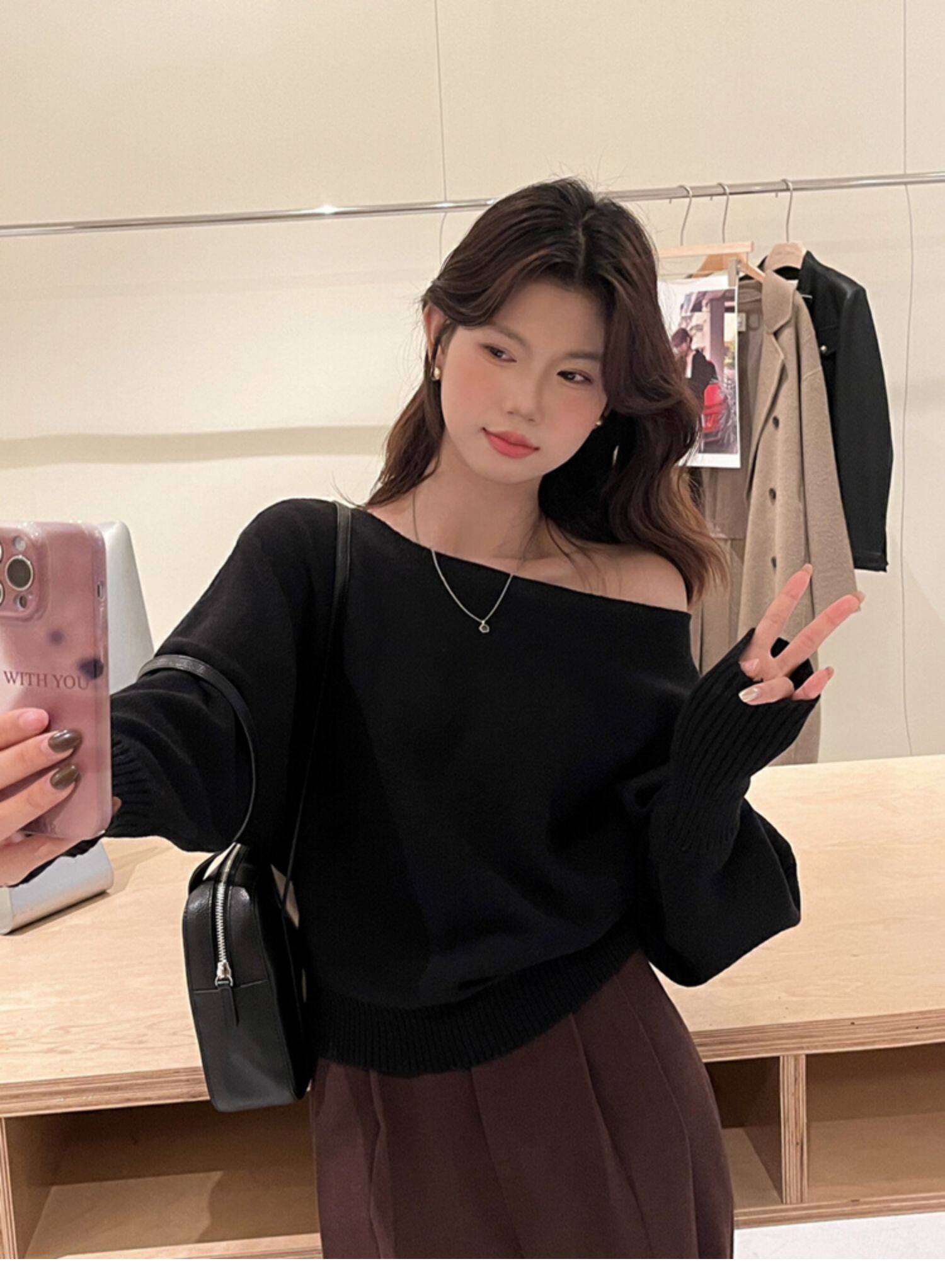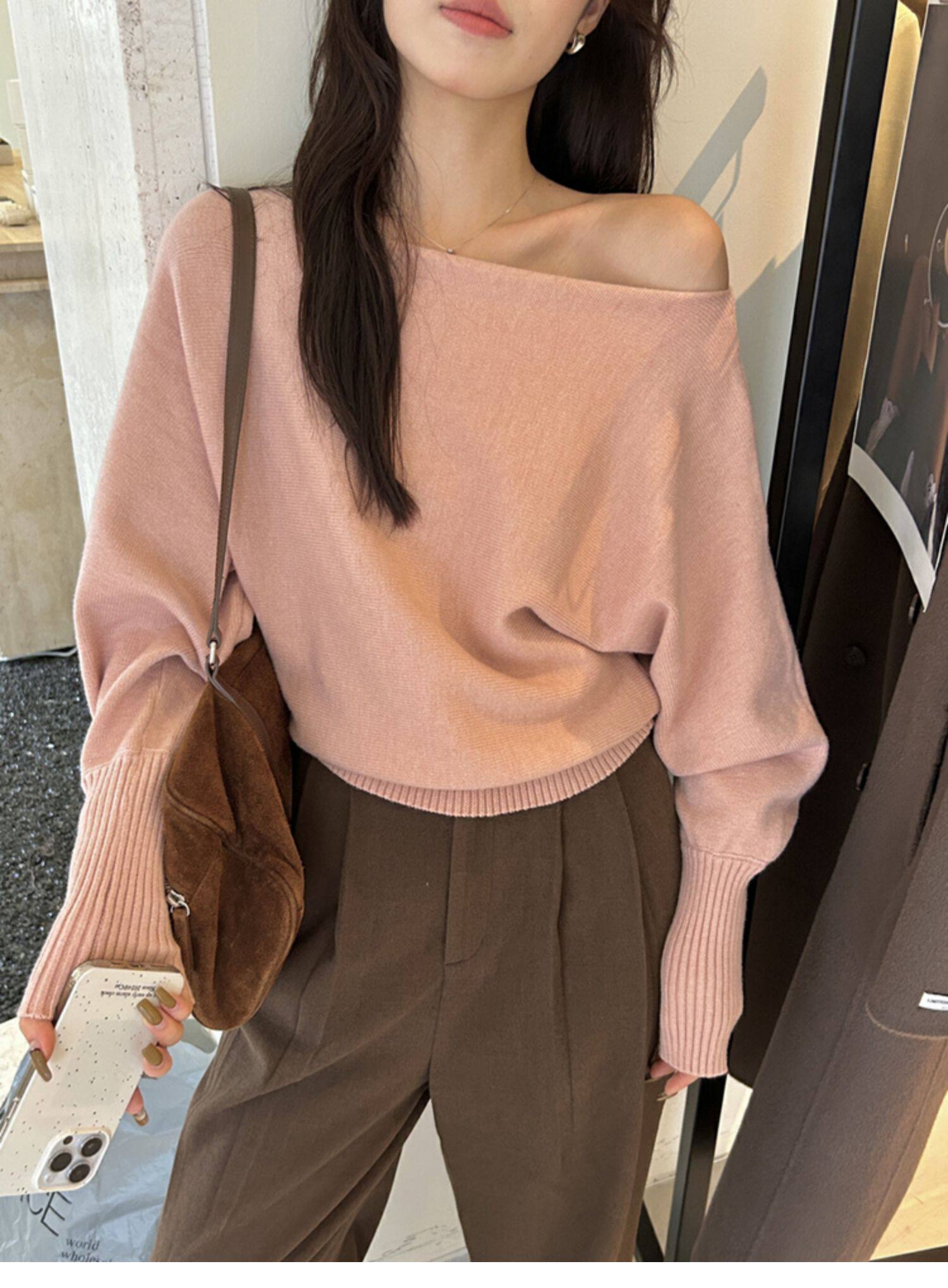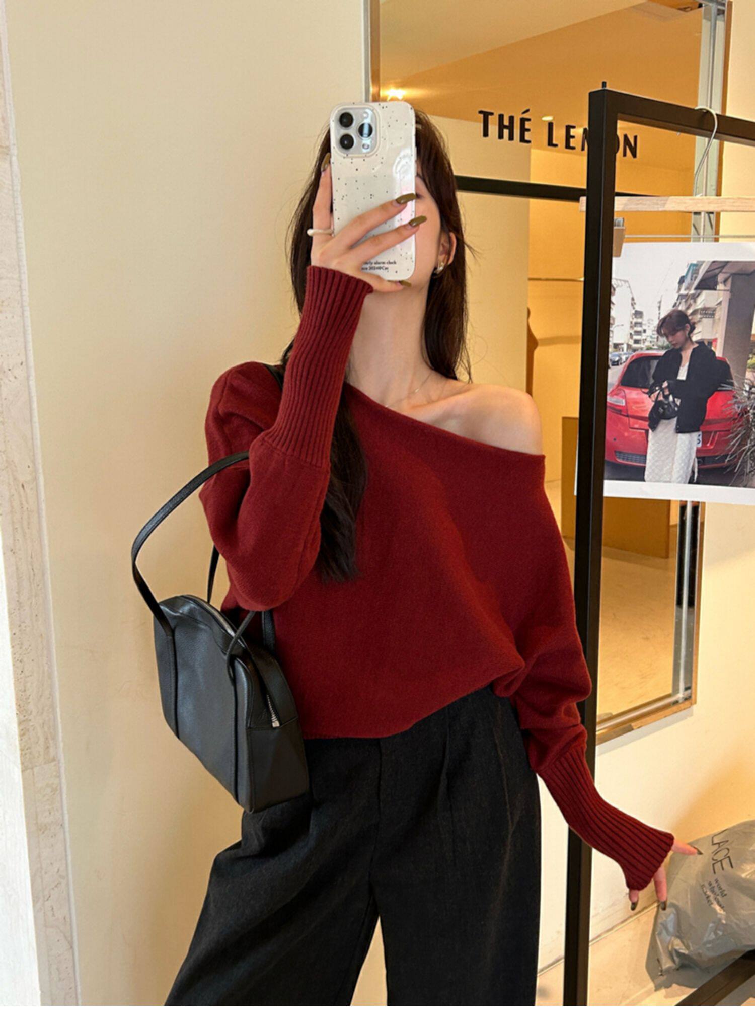 法式輕熟風一字領斜肩針織毛衣春秋冬季松弛感純欲上衣女打底衫潮