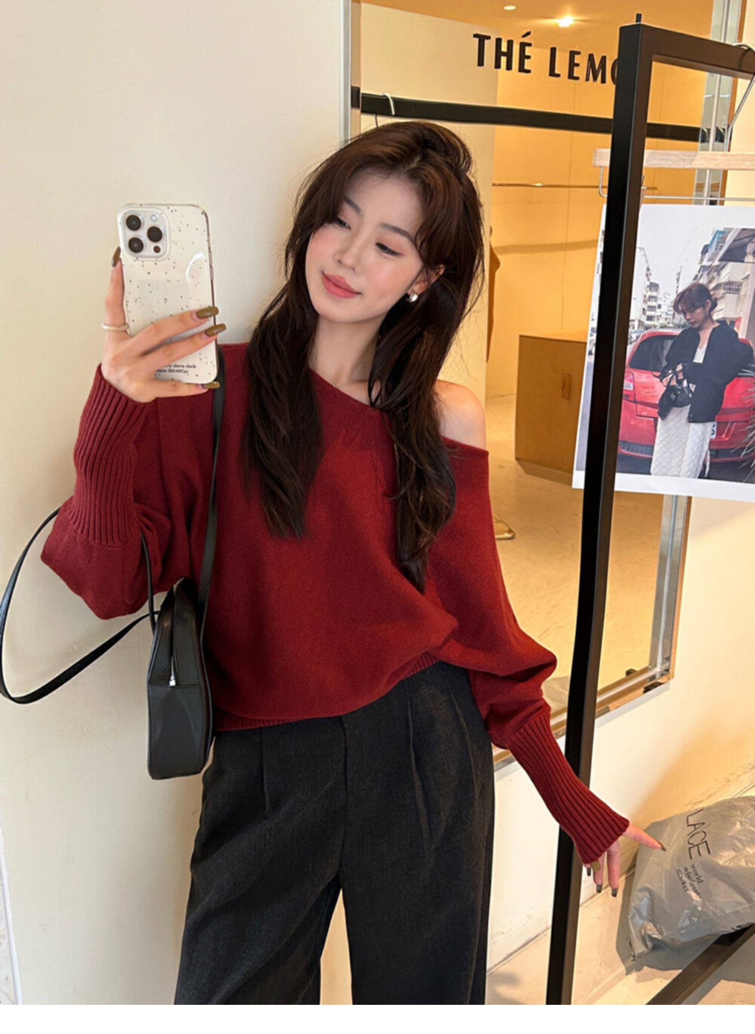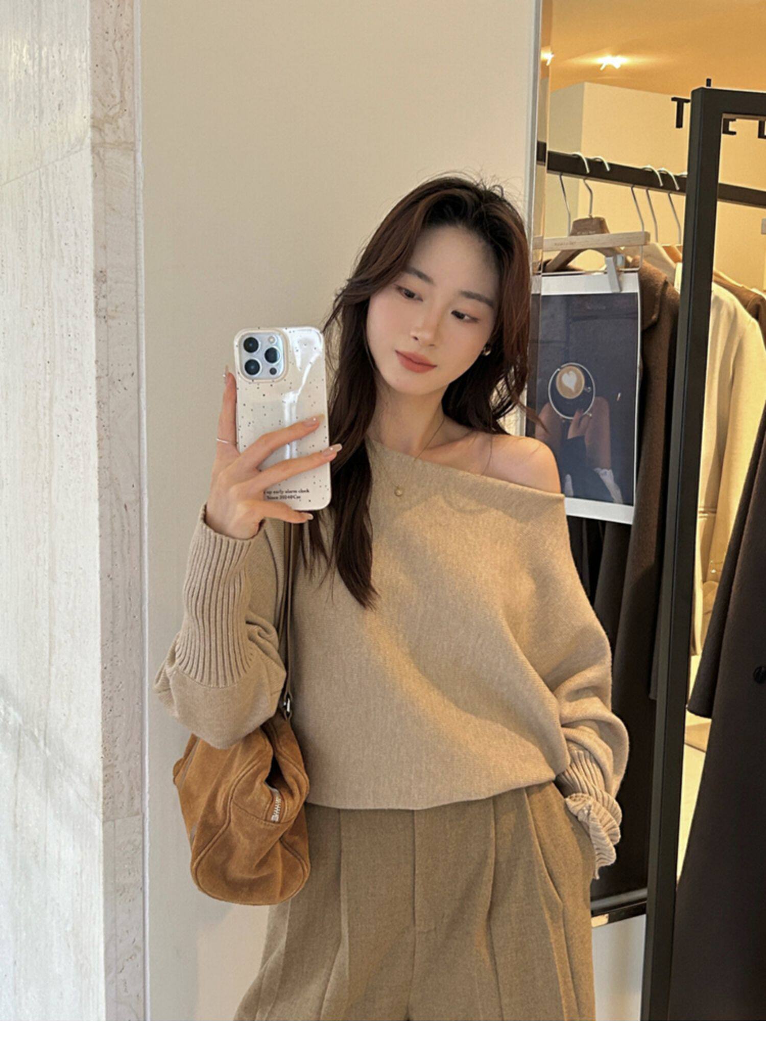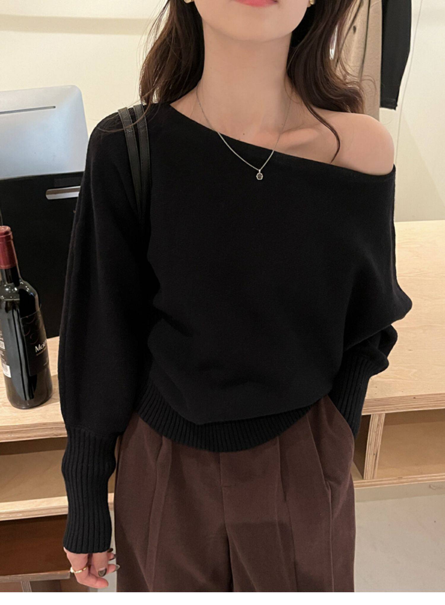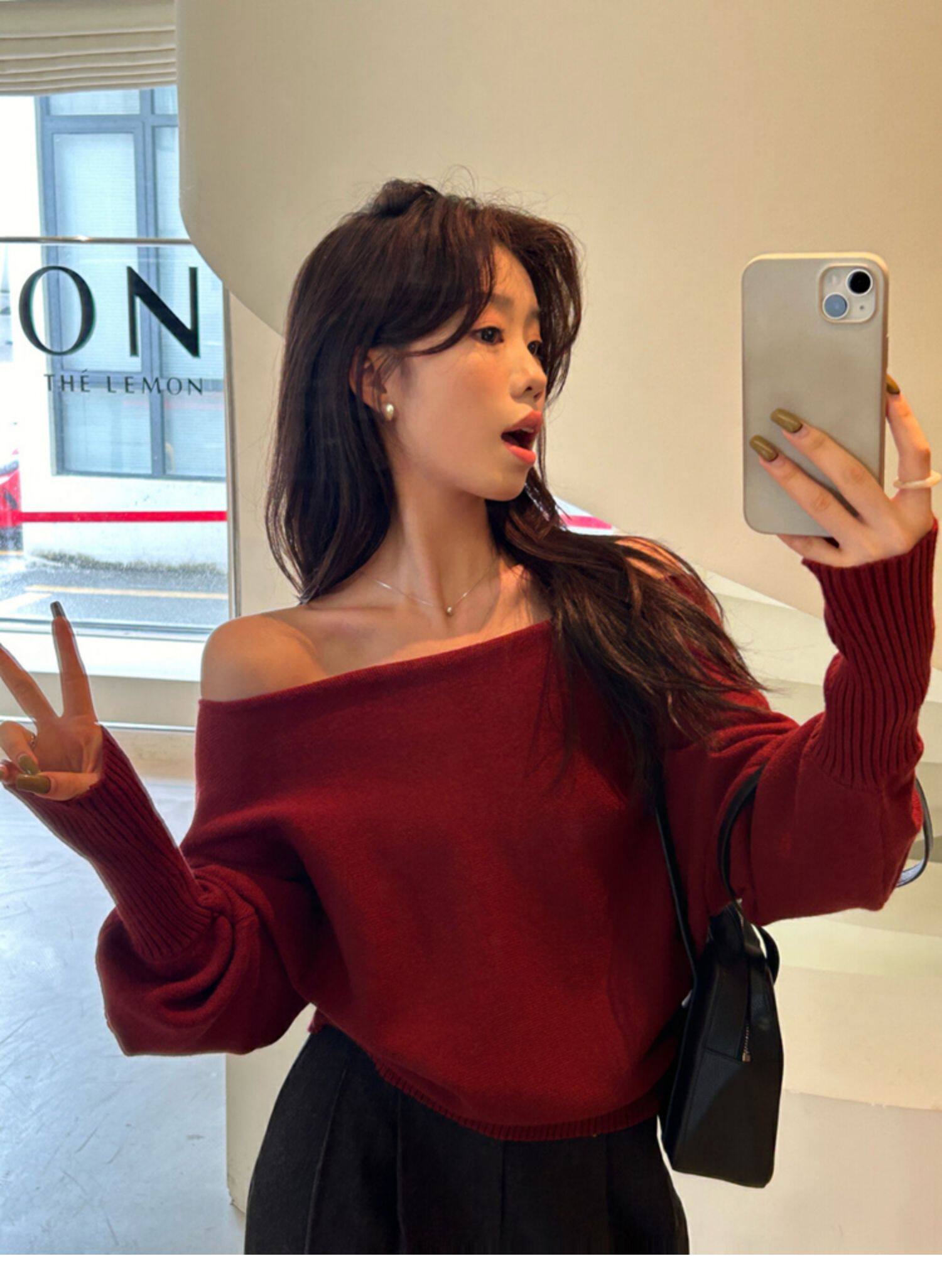 法式輕熟風一字領斜肩針織毛衣春秋冬季松弛感純欲上衣女打底衫潮