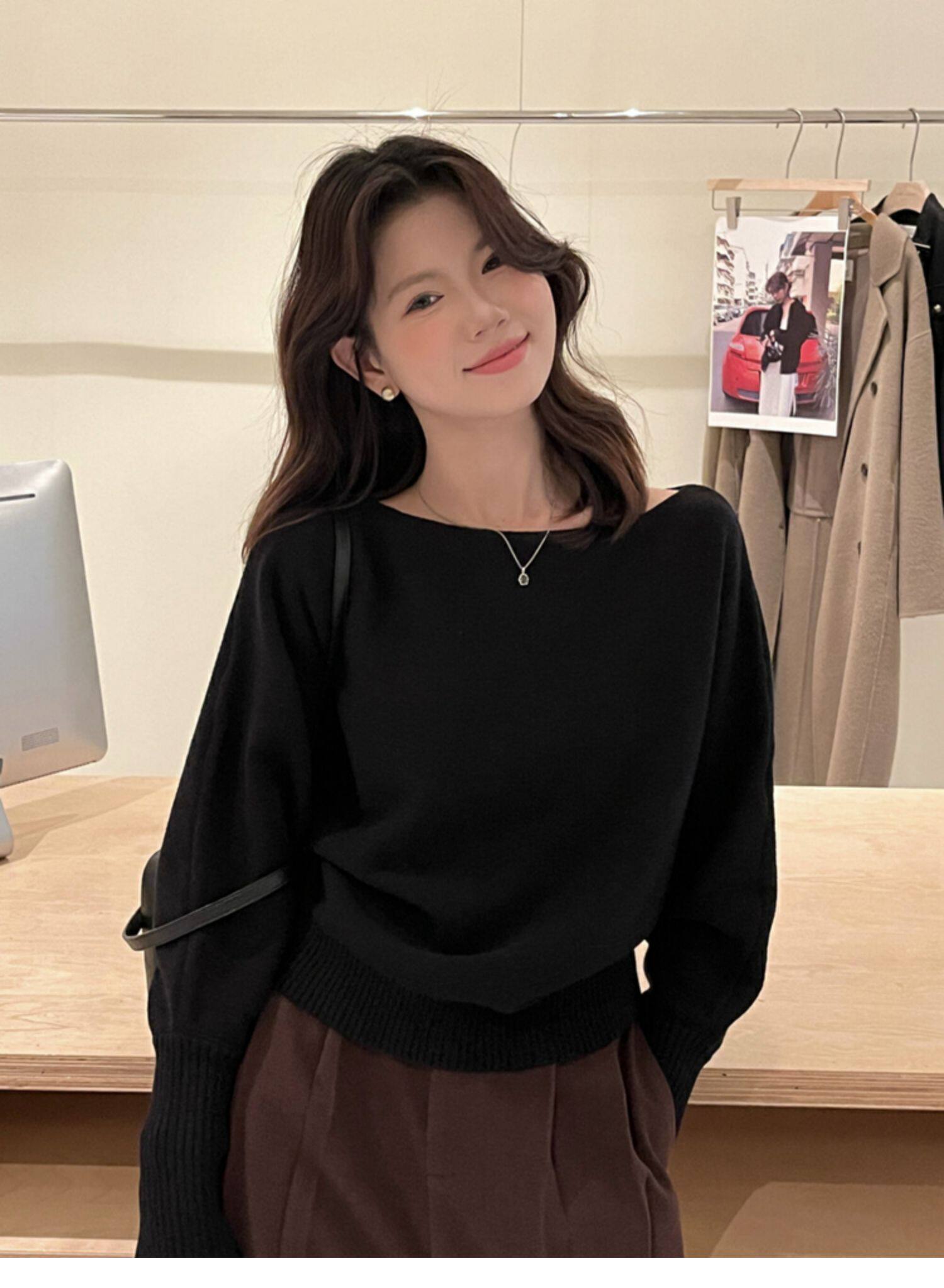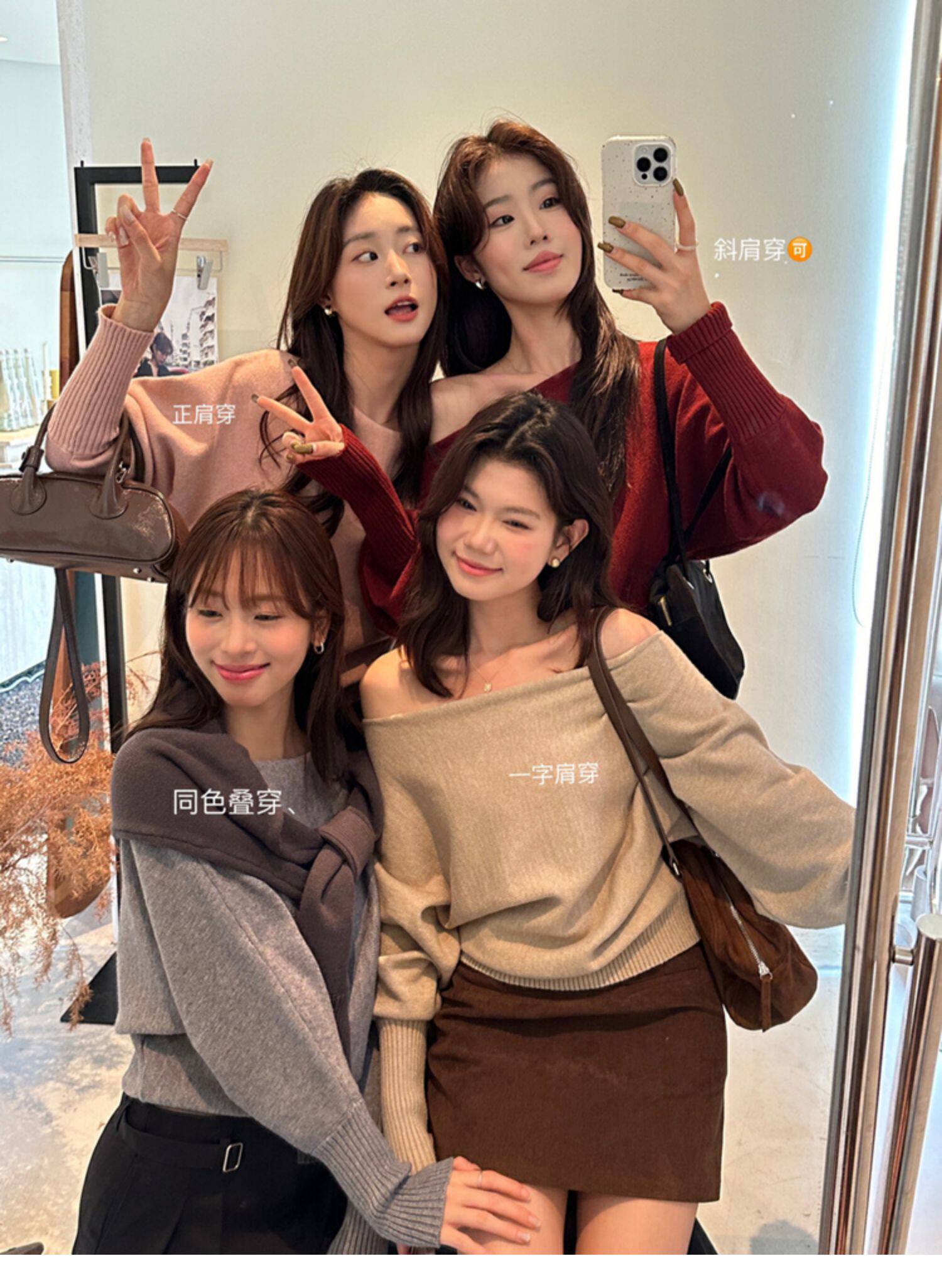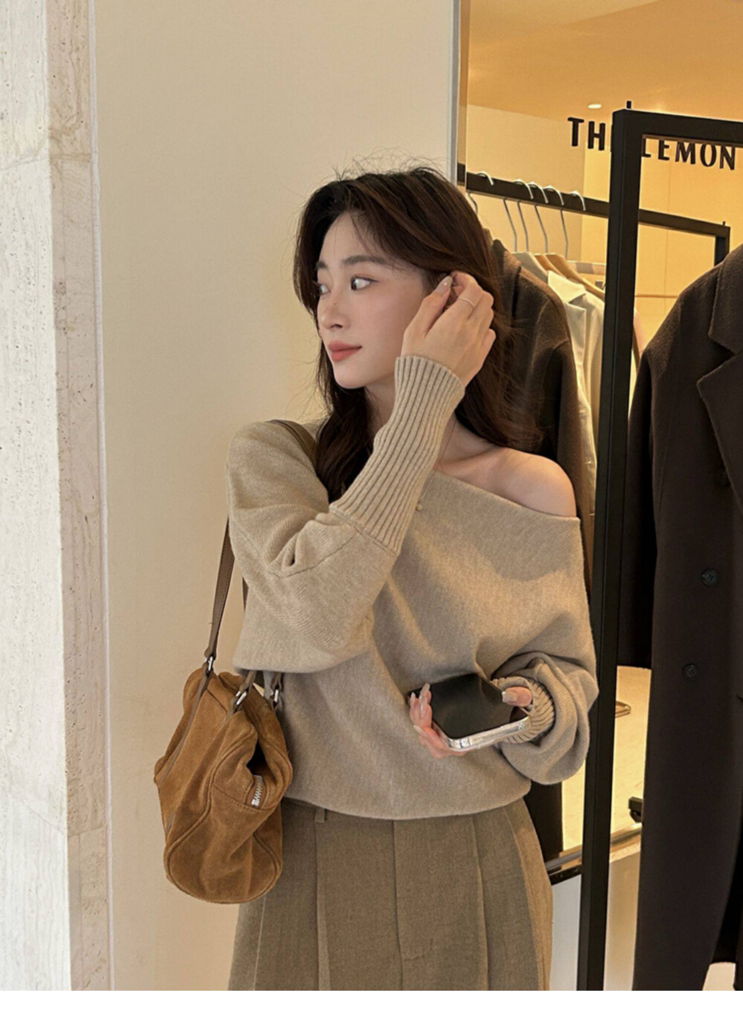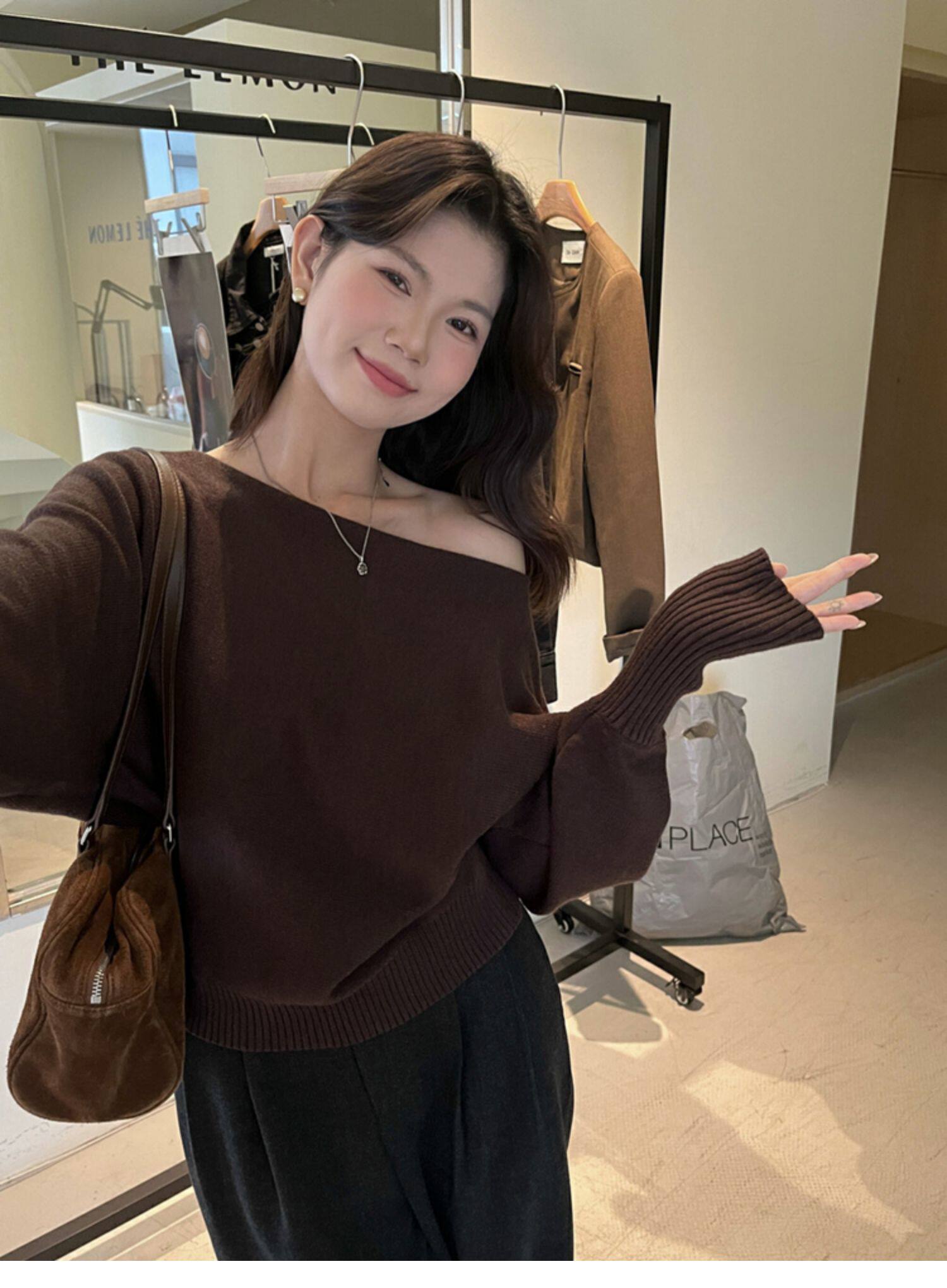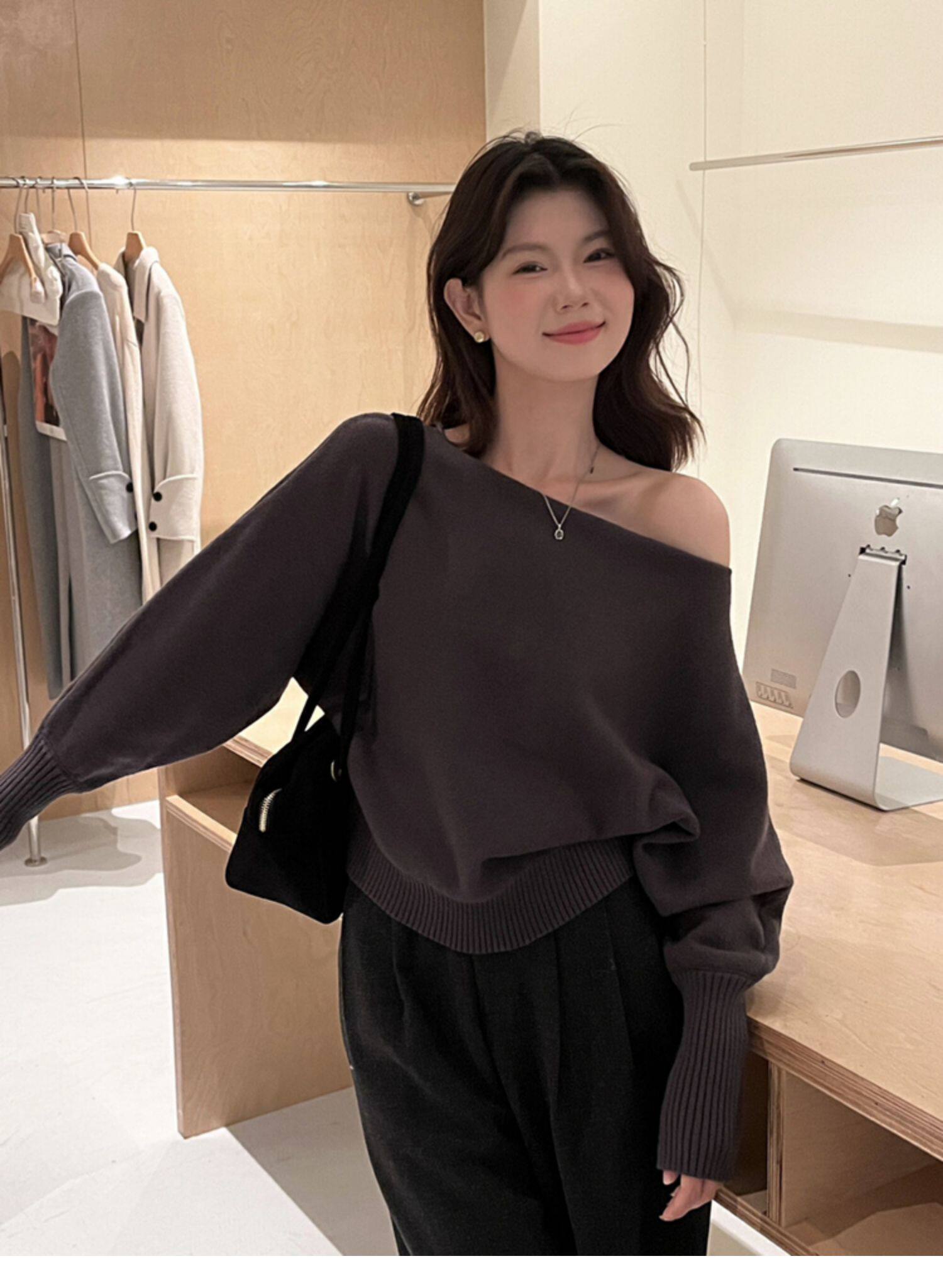 法式輕熟風一字領斜肩針織毛衣春秋冬季松弛感純欲上衣女打底衫潮