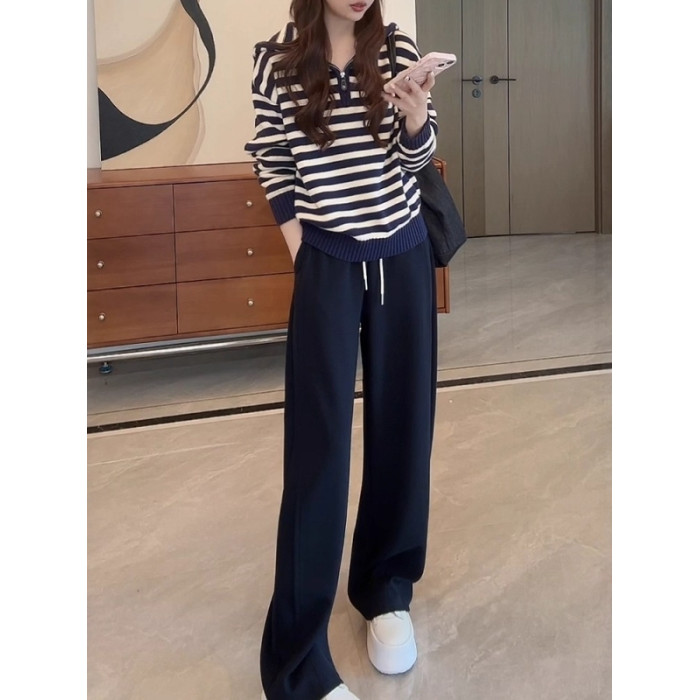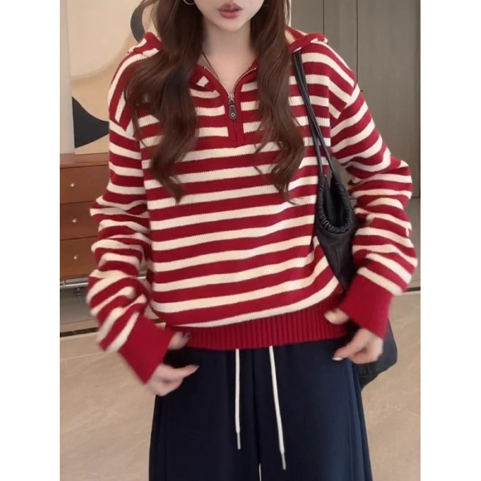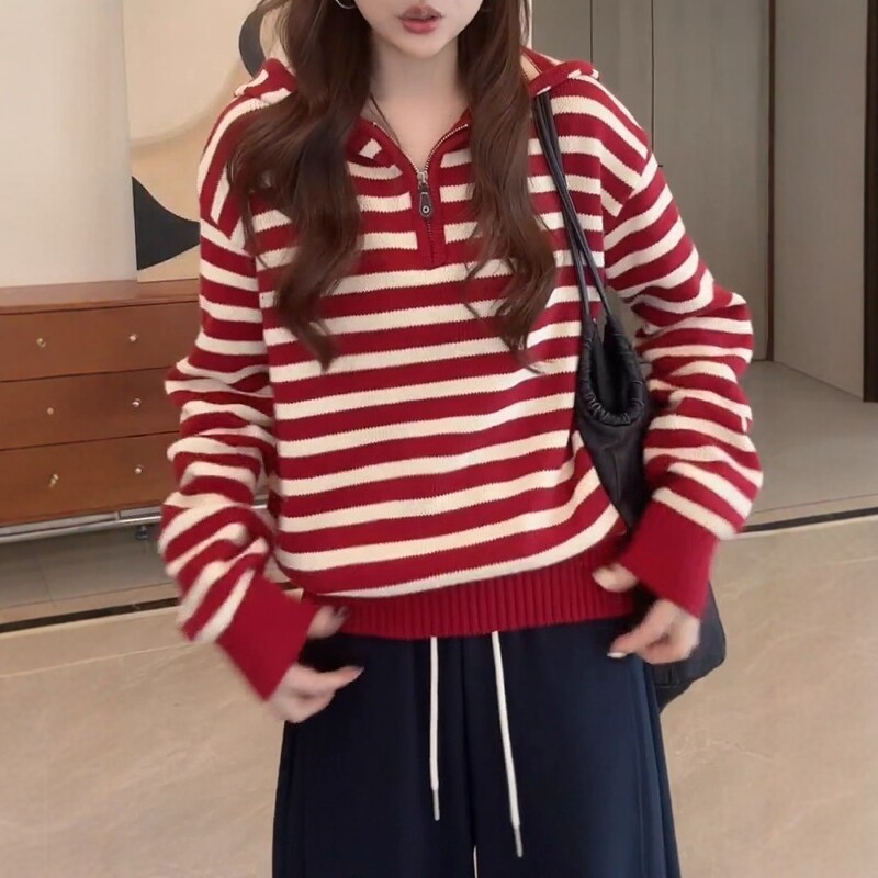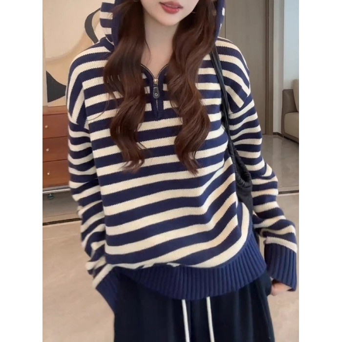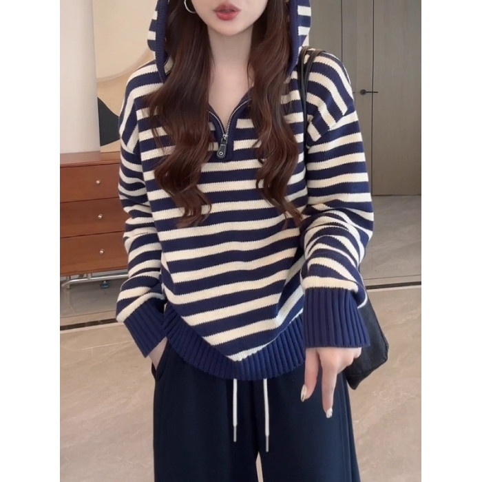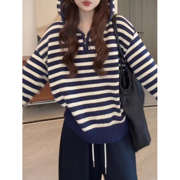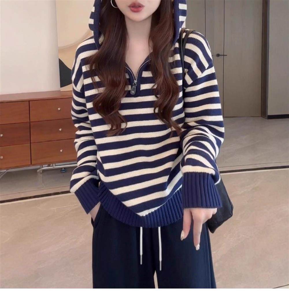 條紋連帽長袖針織衫女裝2025秋季大碼胖MM半拉鍊毛衣帽衫顯瘦上衣