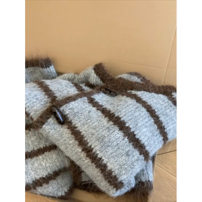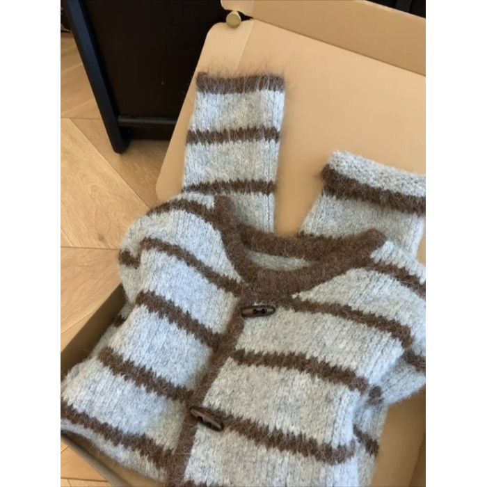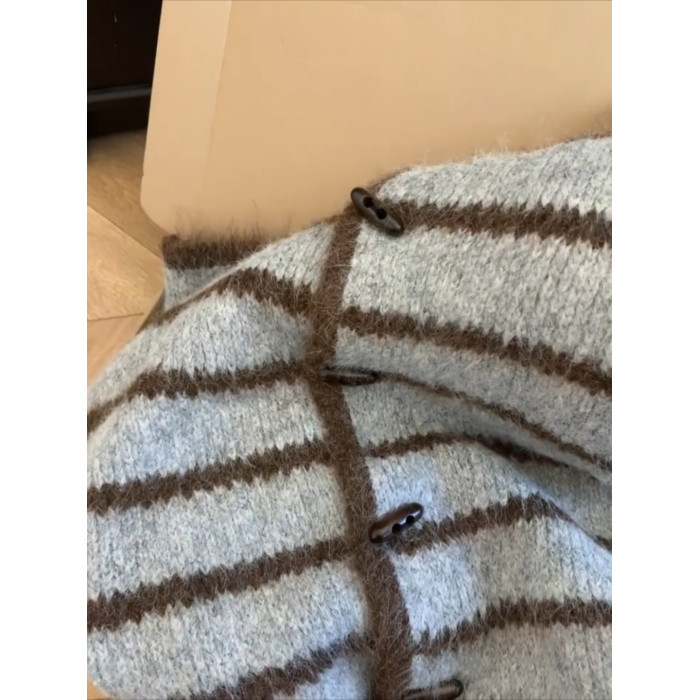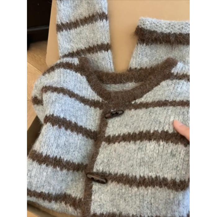 miu系穿搭慵懶風復古條紋牛角釦毛衣小個子秋新款高級感針織開衫