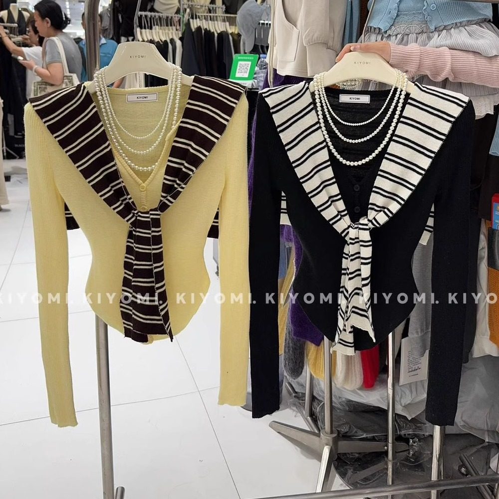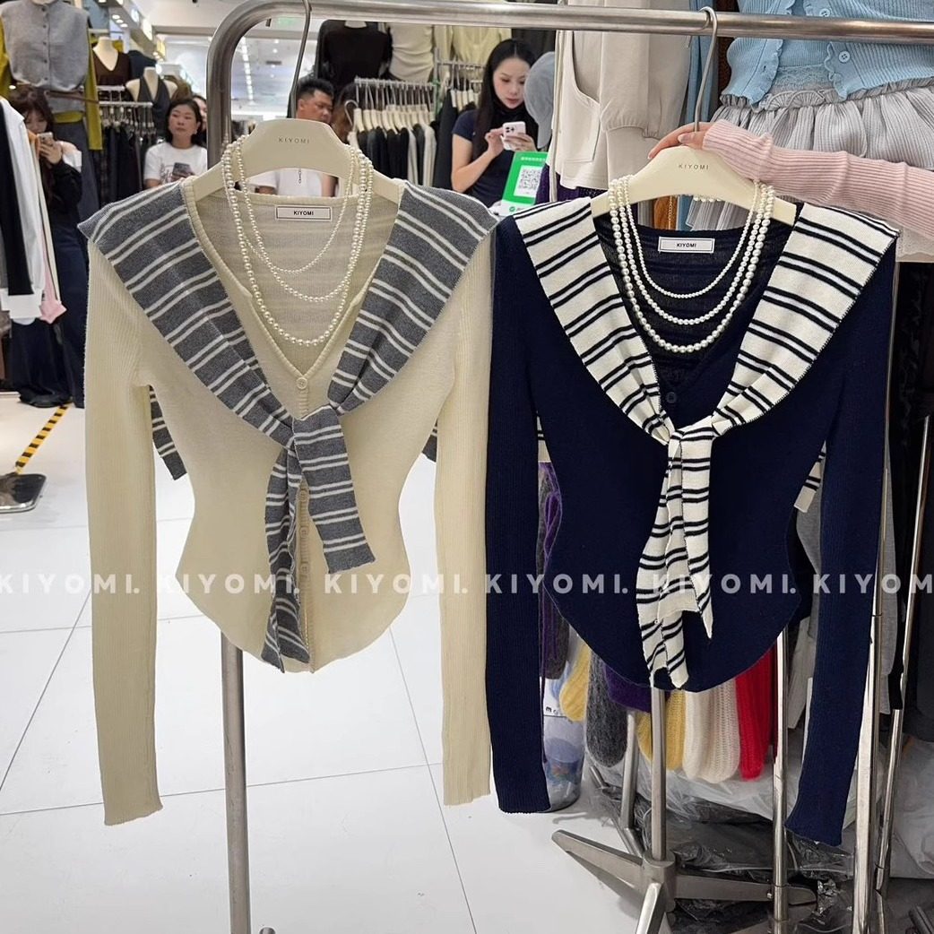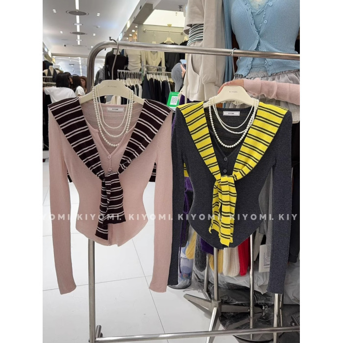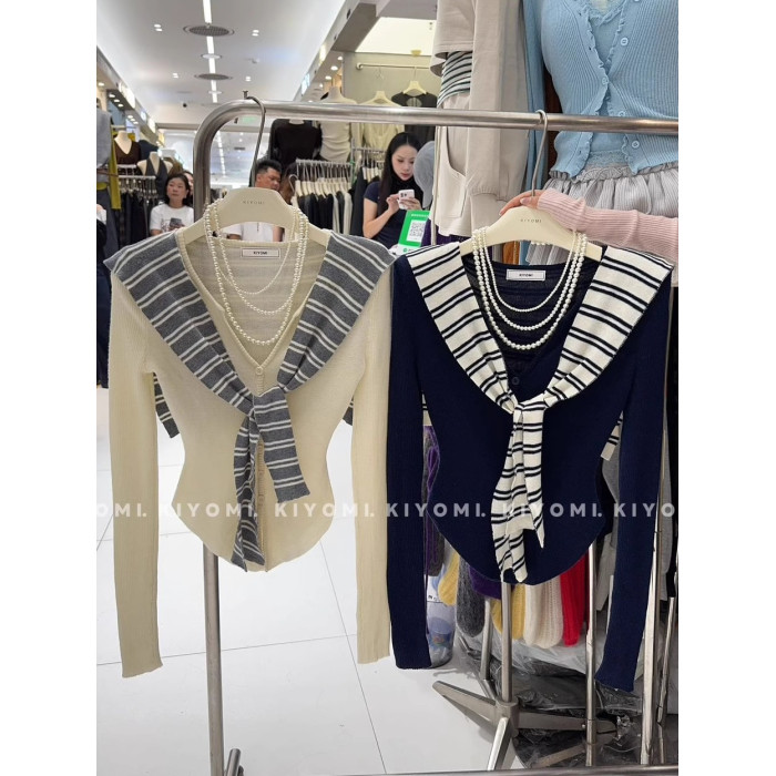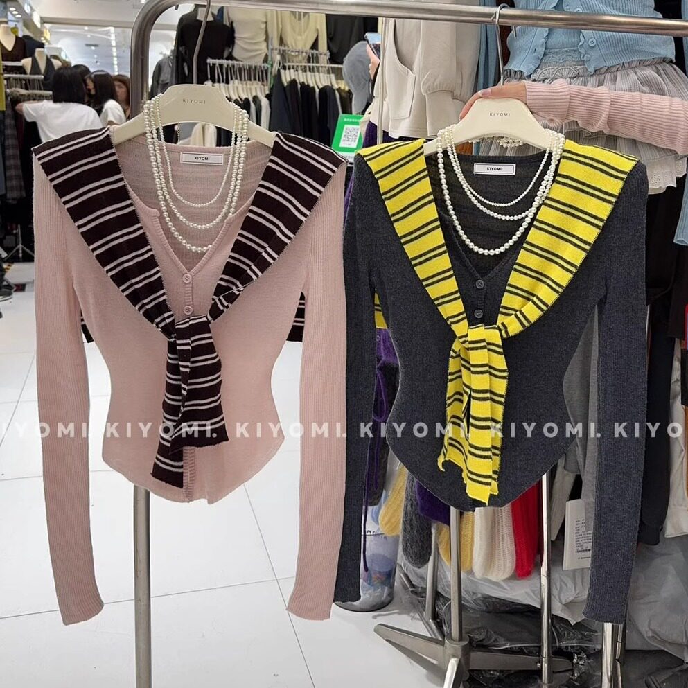 ~KIYOMI實拍秋冬韓版純欲辣妹撞色條紋披肩V領針織衫假兩件