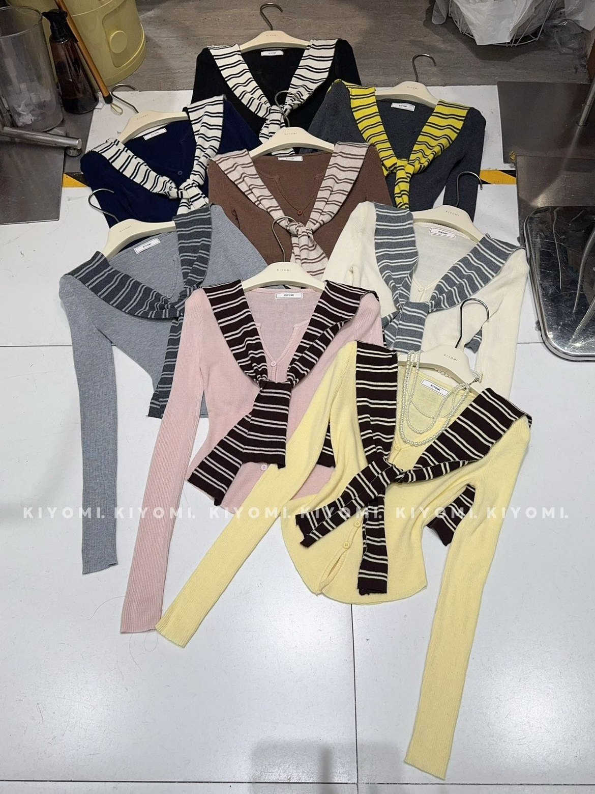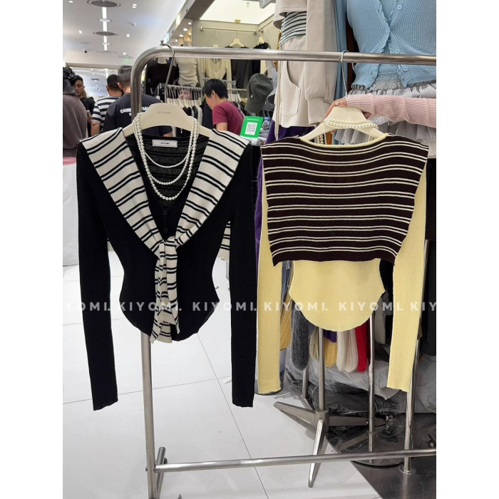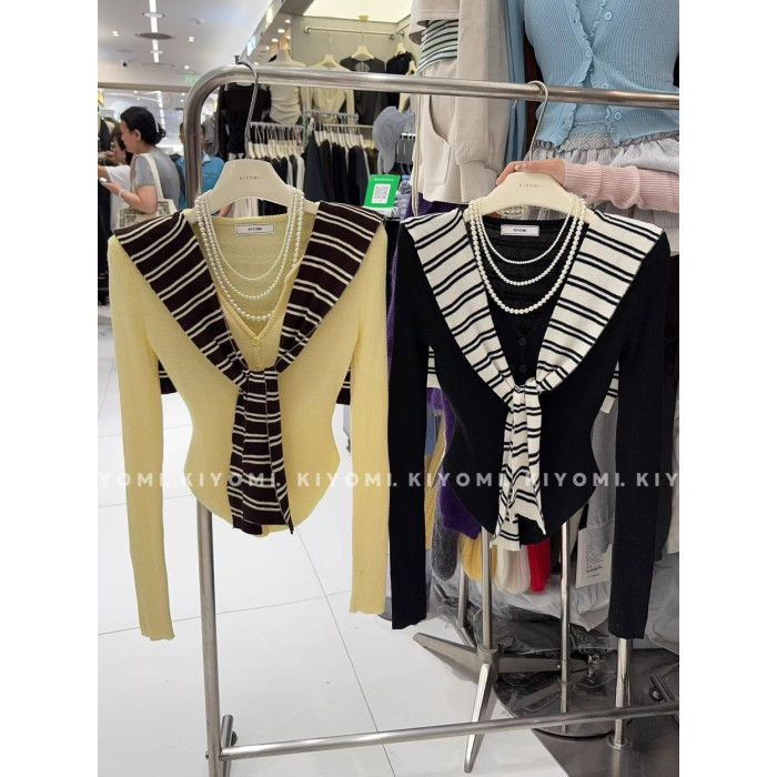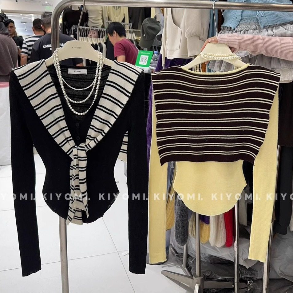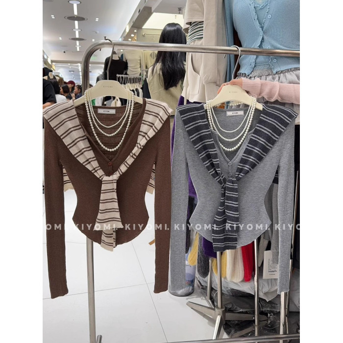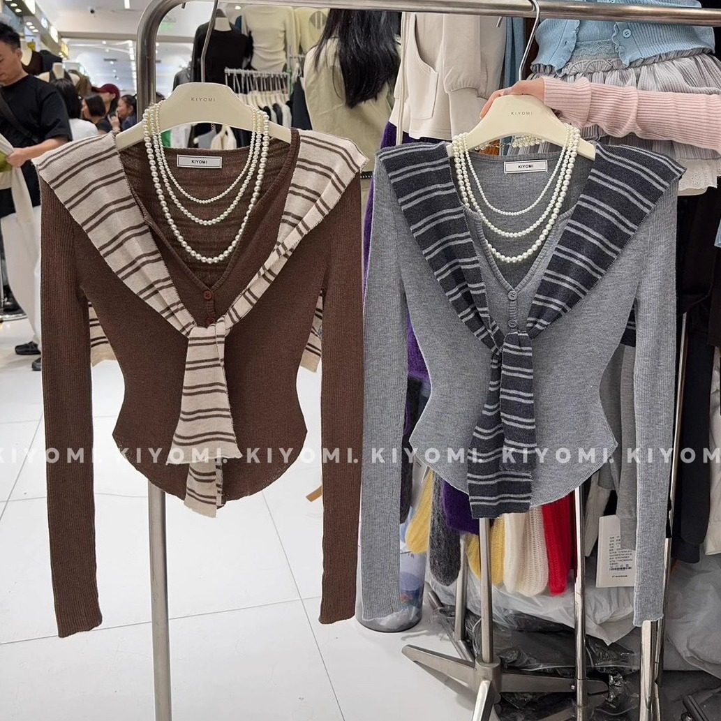 ~KIYOMI實拍秋冬韓版純欲辣妹撞色條紋披肩V領針織衫假兩件