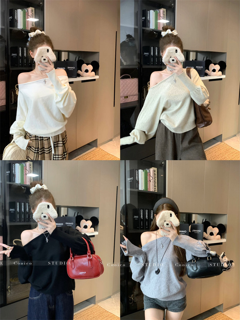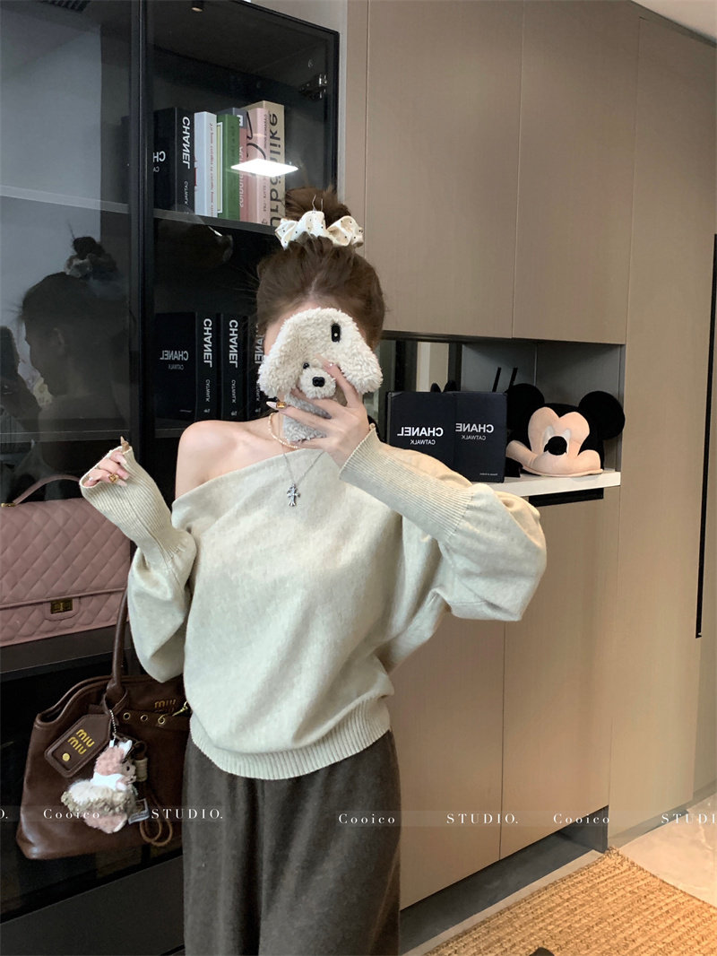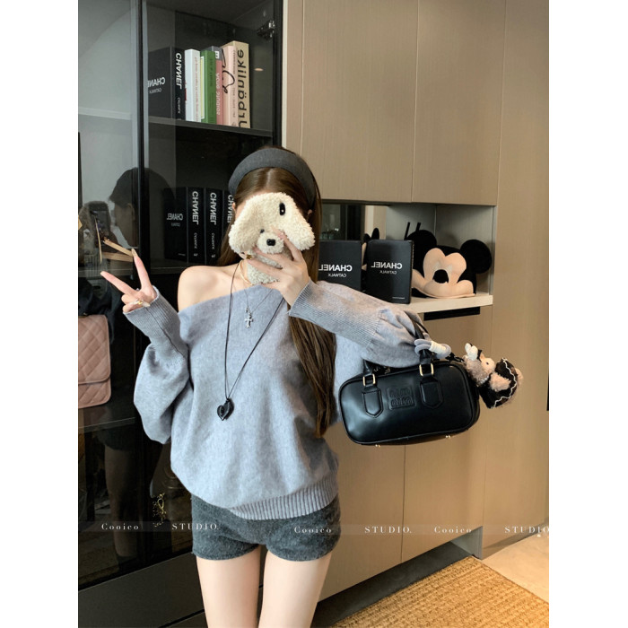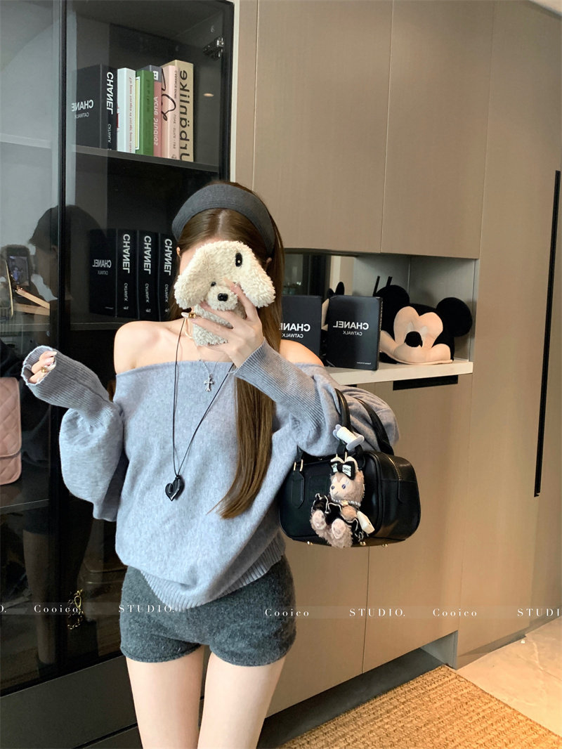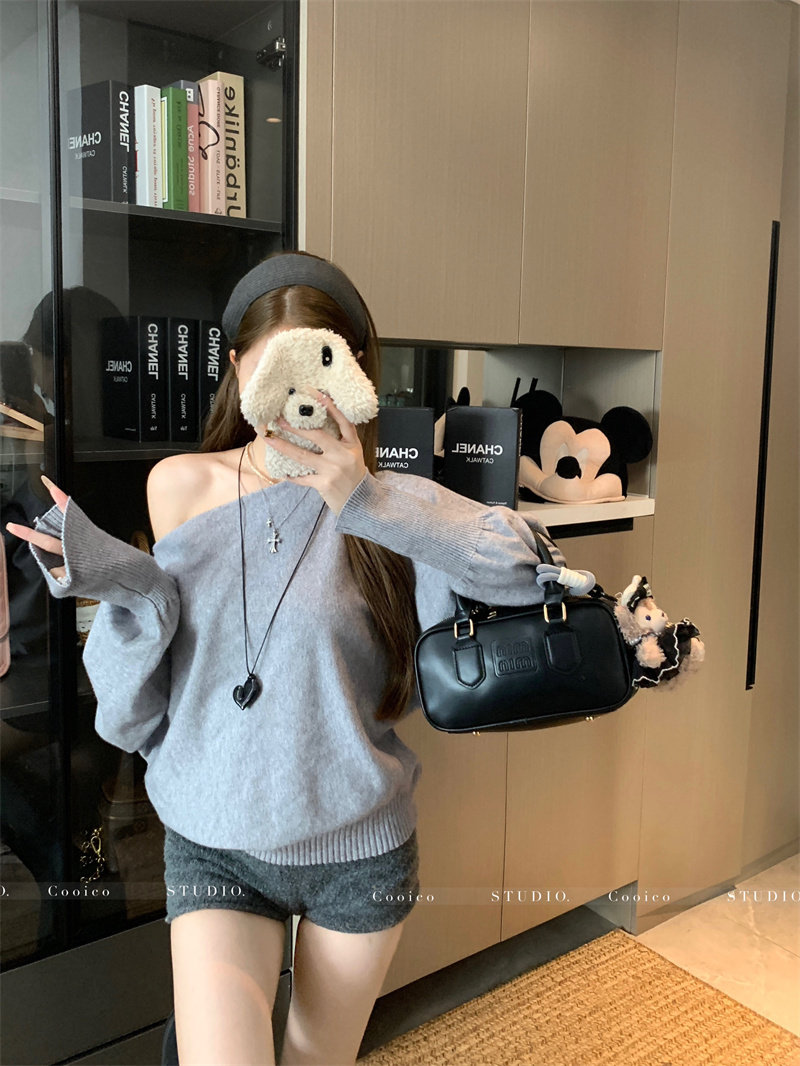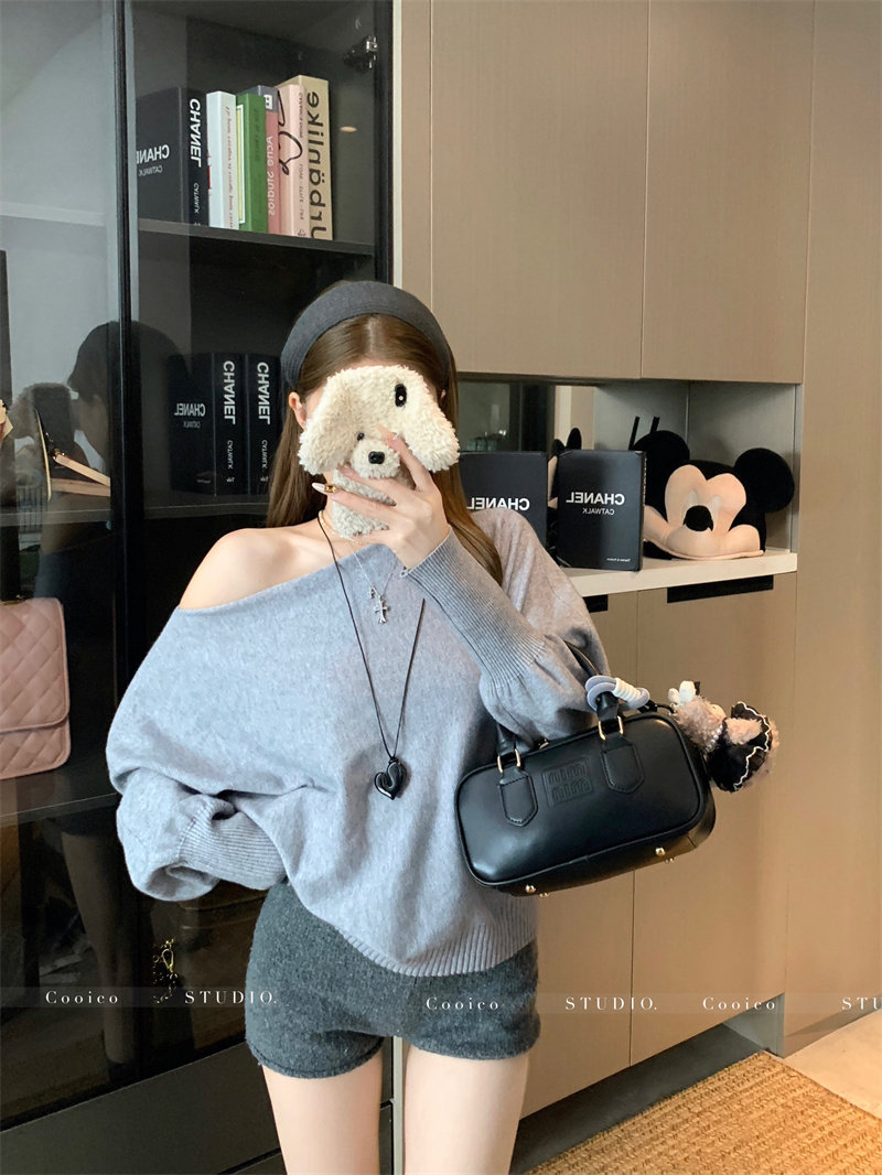 kumikumi設計感灰色斜肩長袖針織衫女裝秋季氣質復古百搭露肩上衣