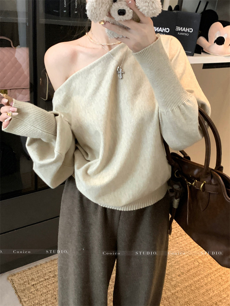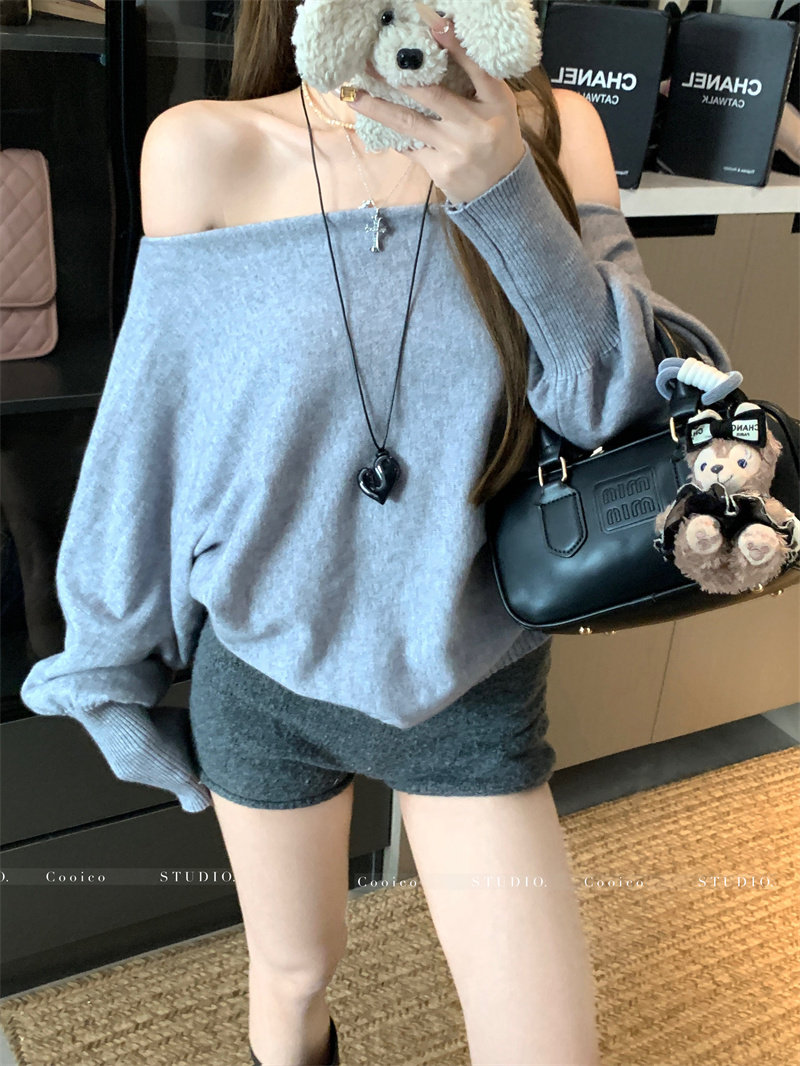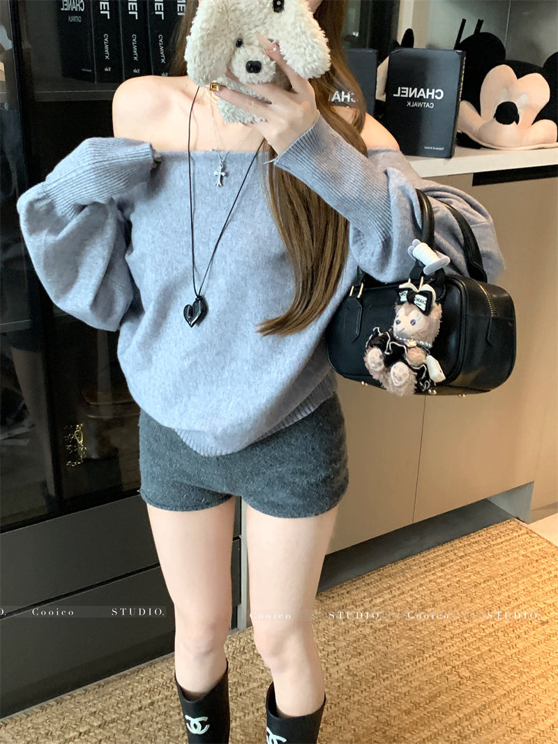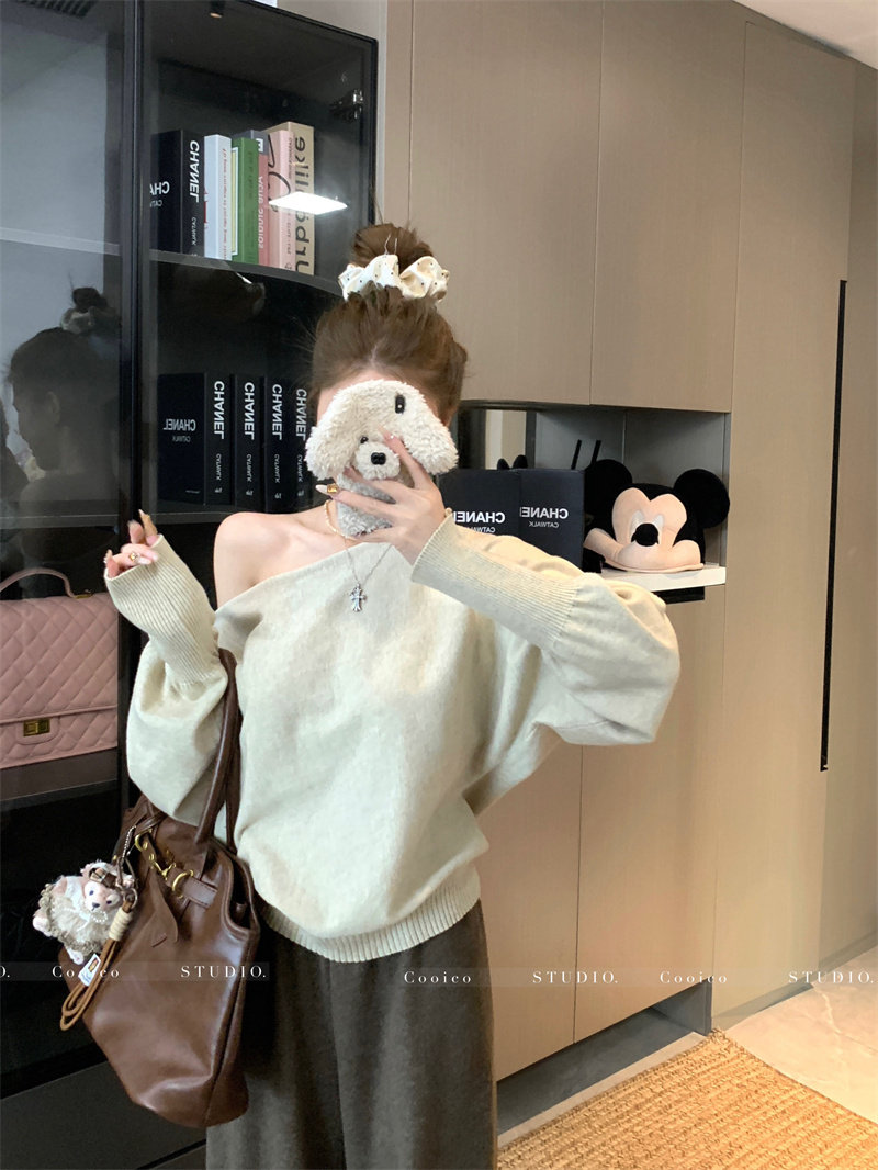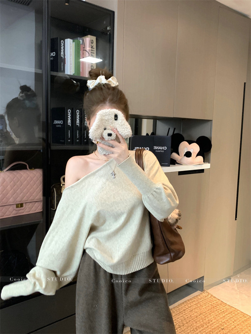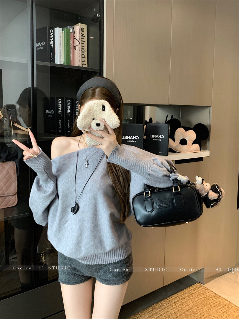 kumikumi設計感灰色斜肩長袖針織衫女裝秋季氣質復古百搭露肩上衣
