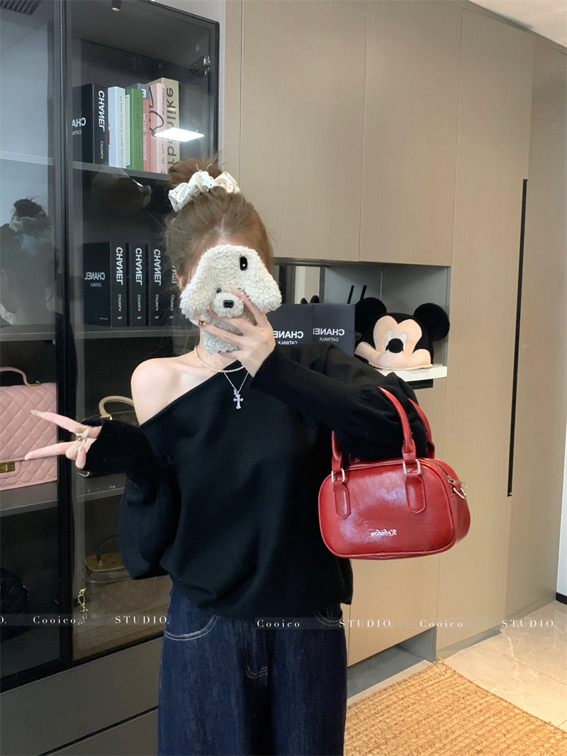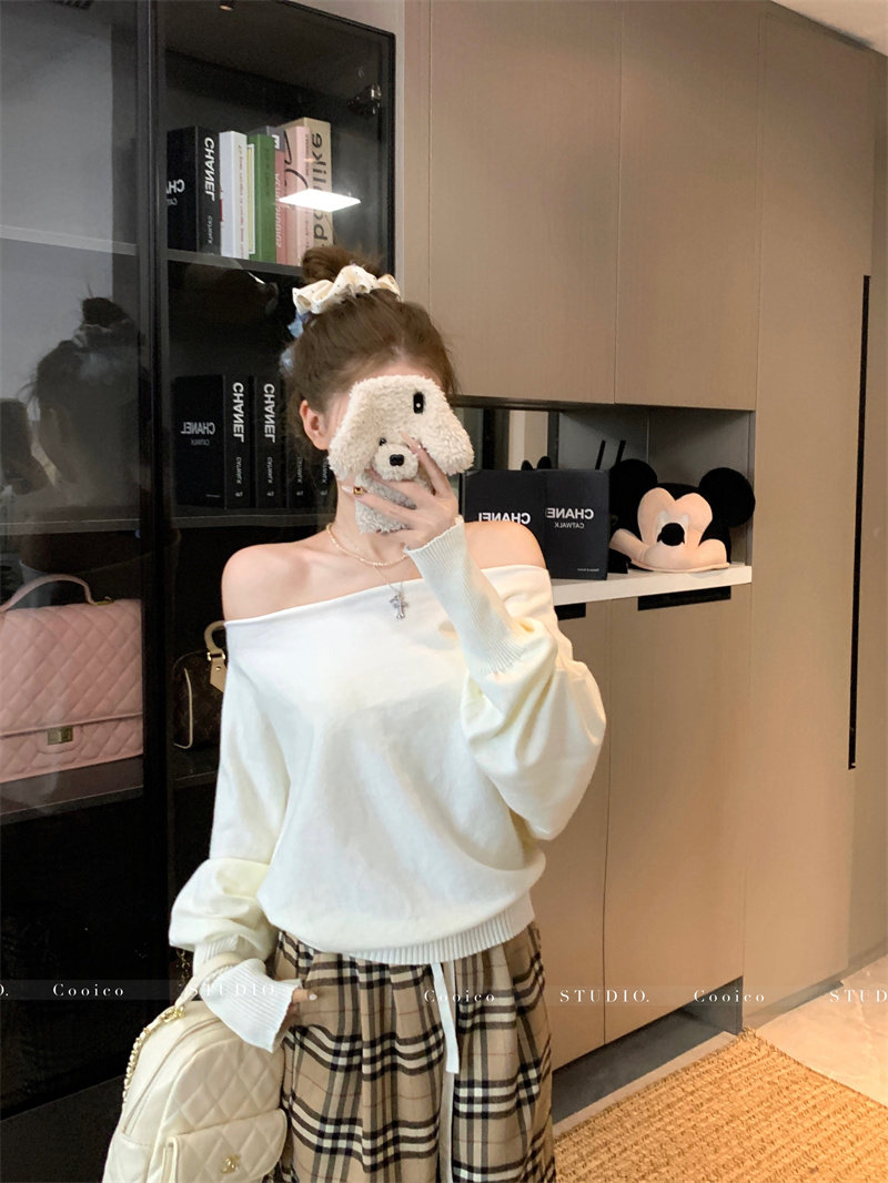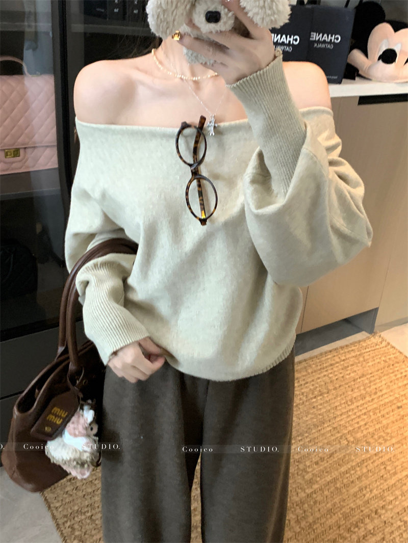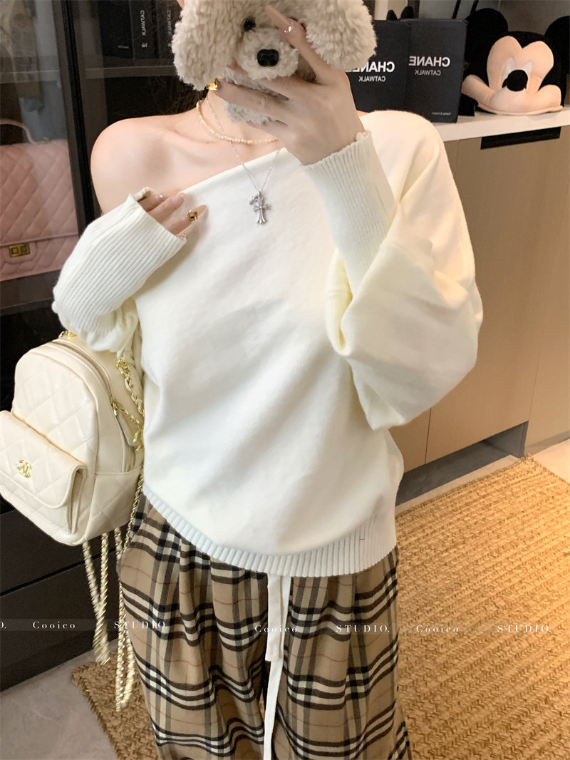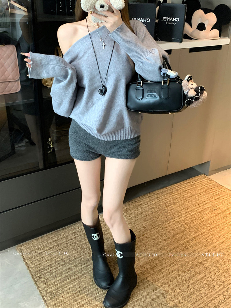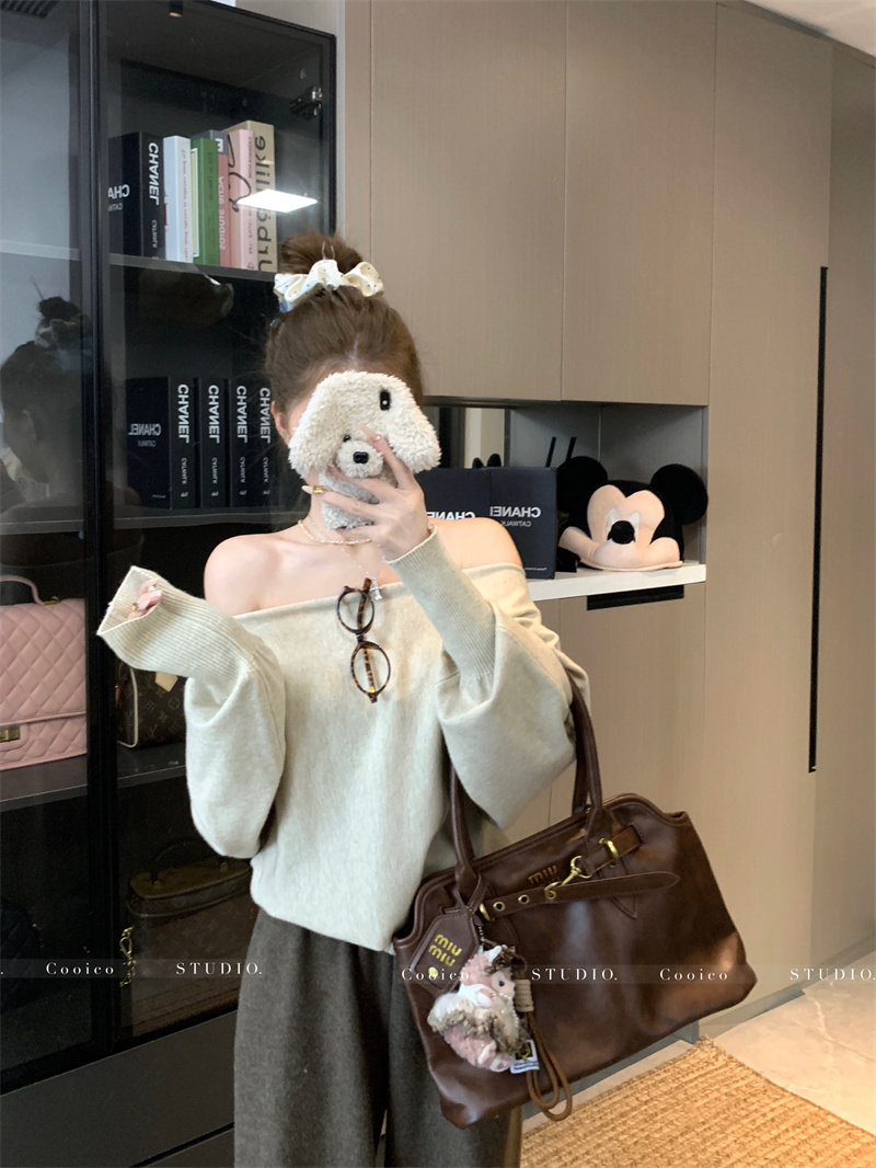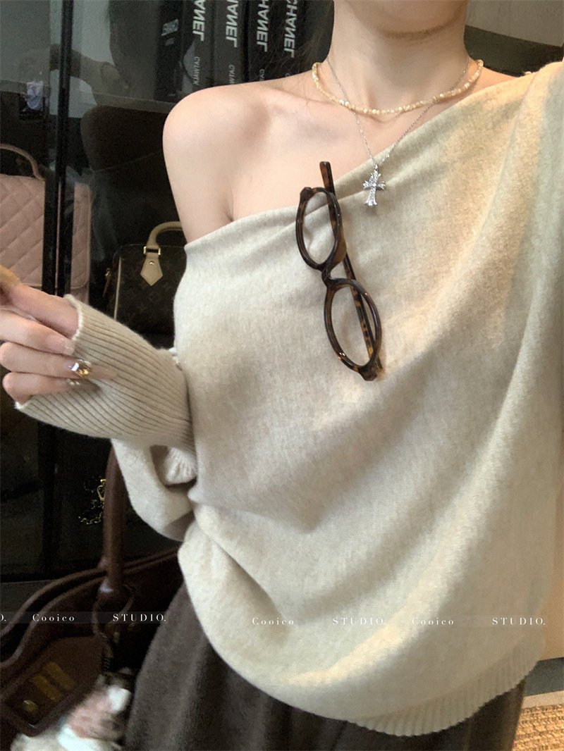 kumikumi設計感灰色斜肩長袖針織衫女裝秋季氣質復古百搭露肩上衣