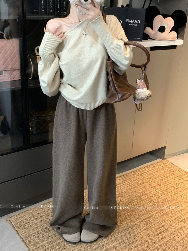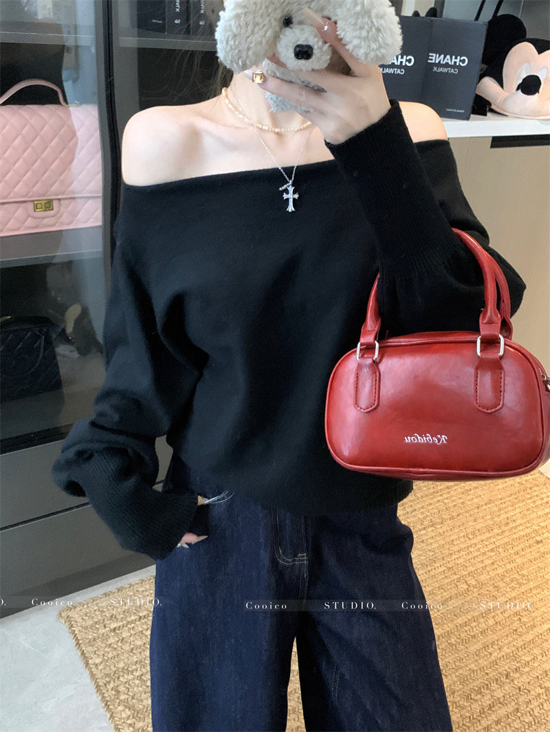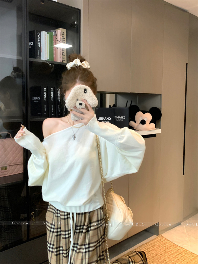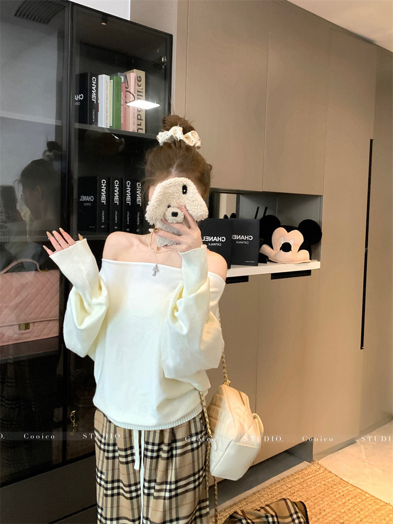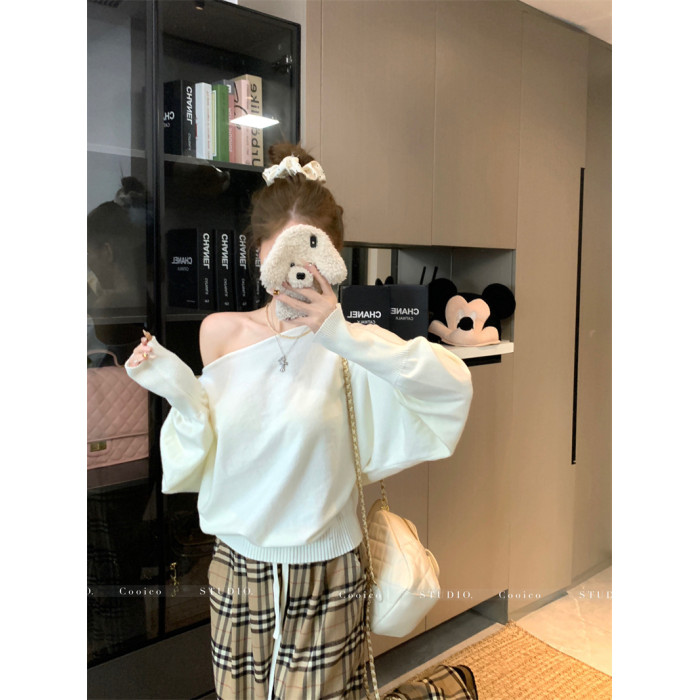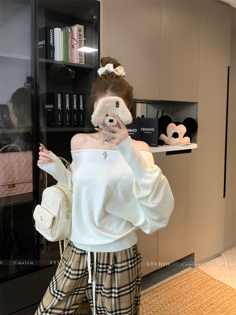 kumikumi設計感灰色斜肩長袖針織衫女裝秋季氣質復古百搭露肩上衣