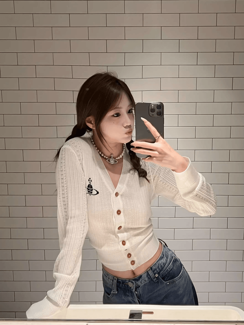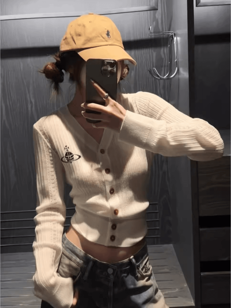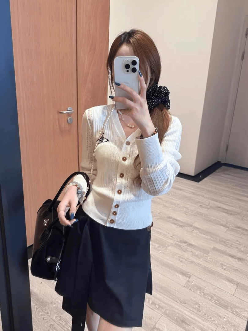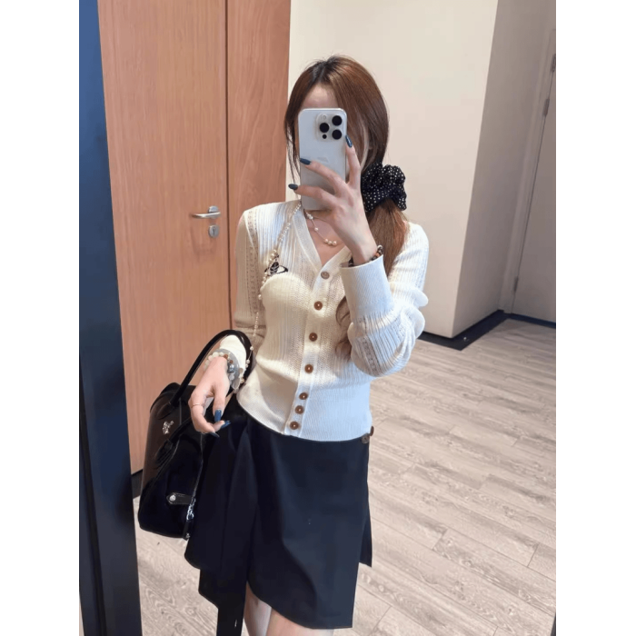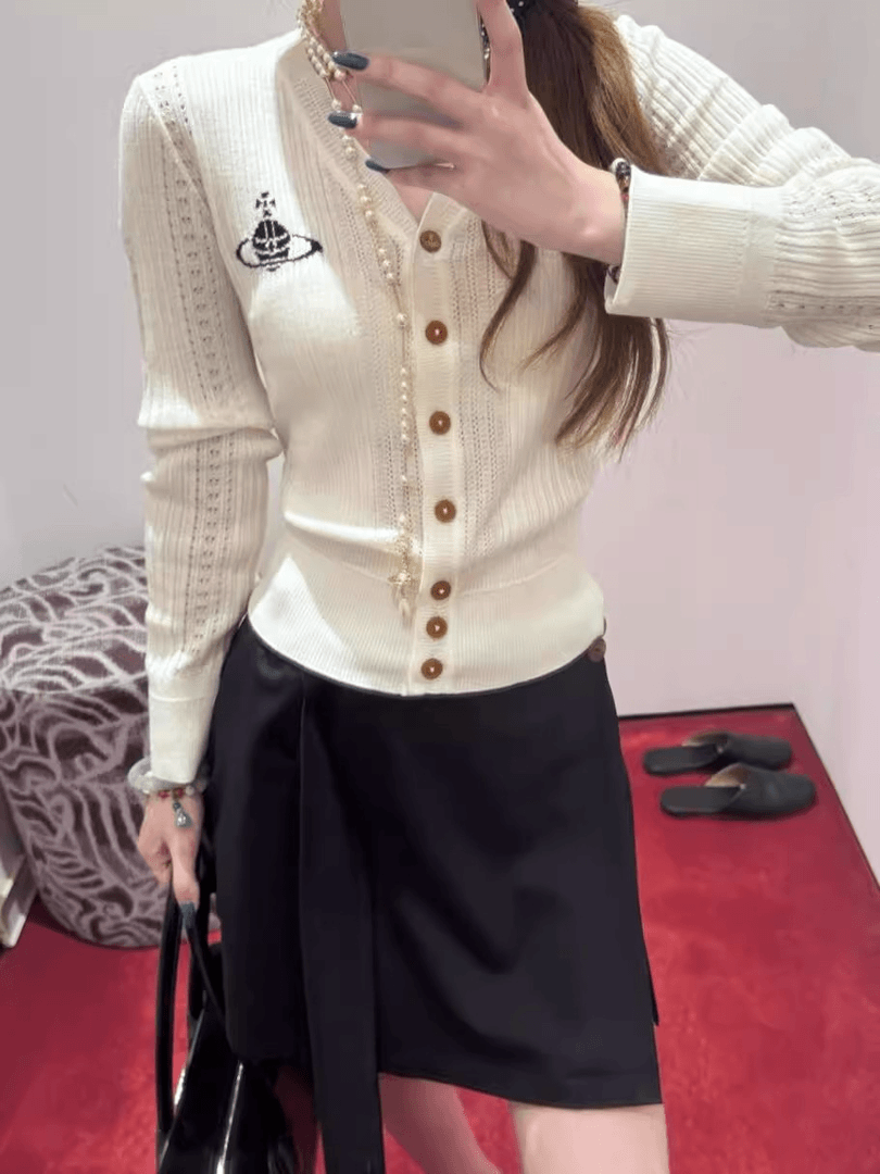 2025早秋新款西太後土星羊毛針織開衫提花V領長袖刺綉印花外套女