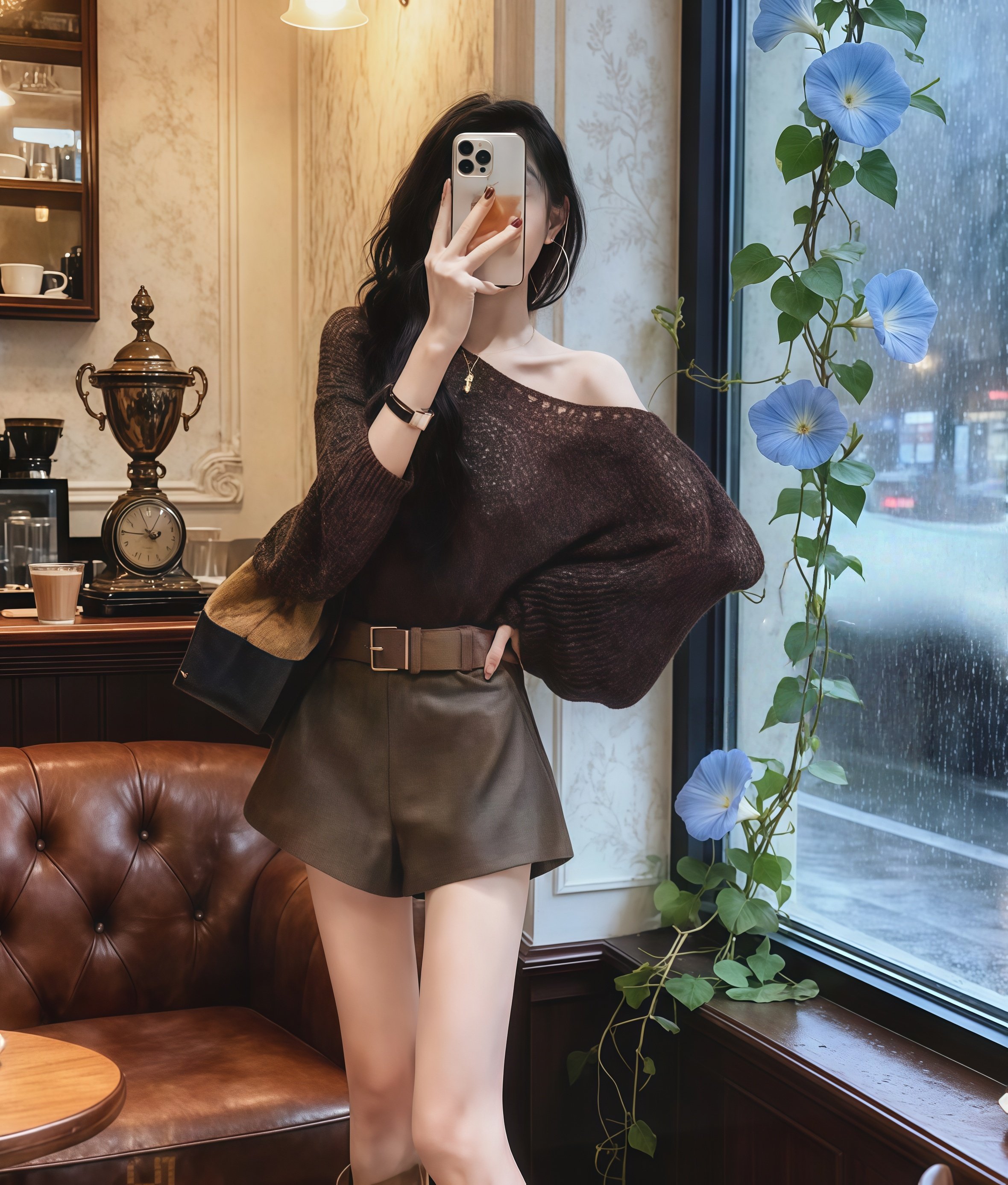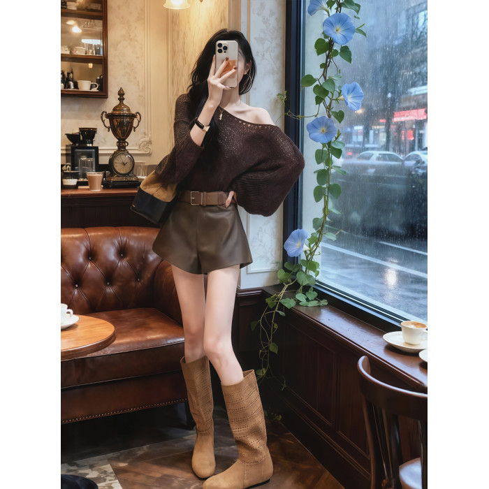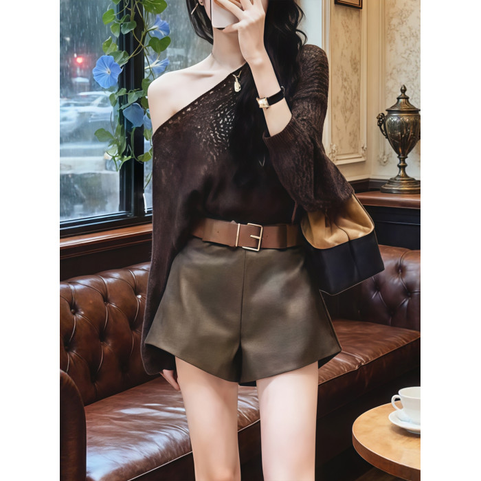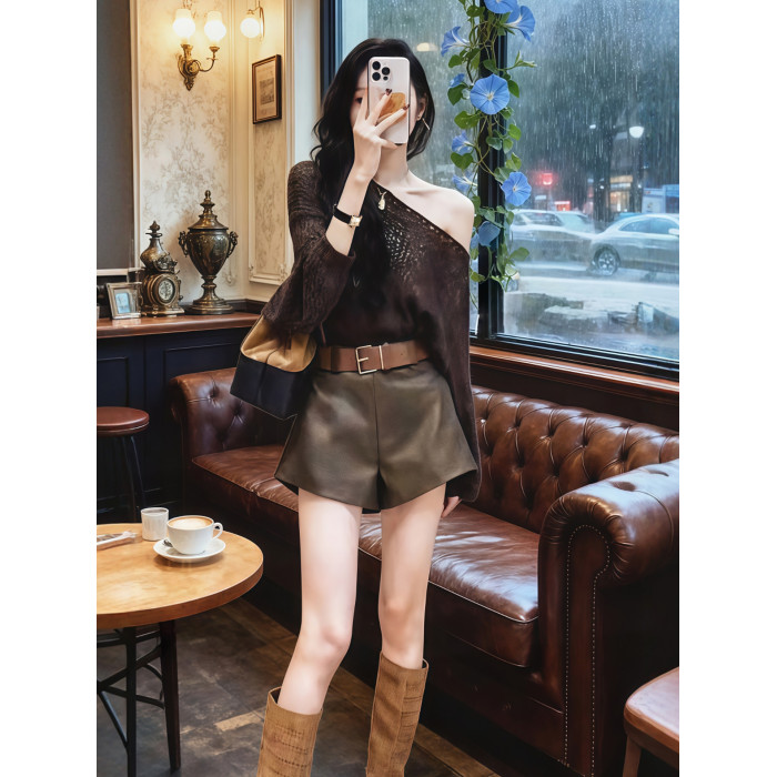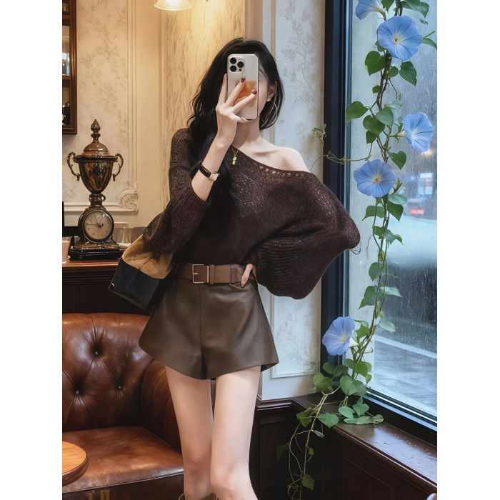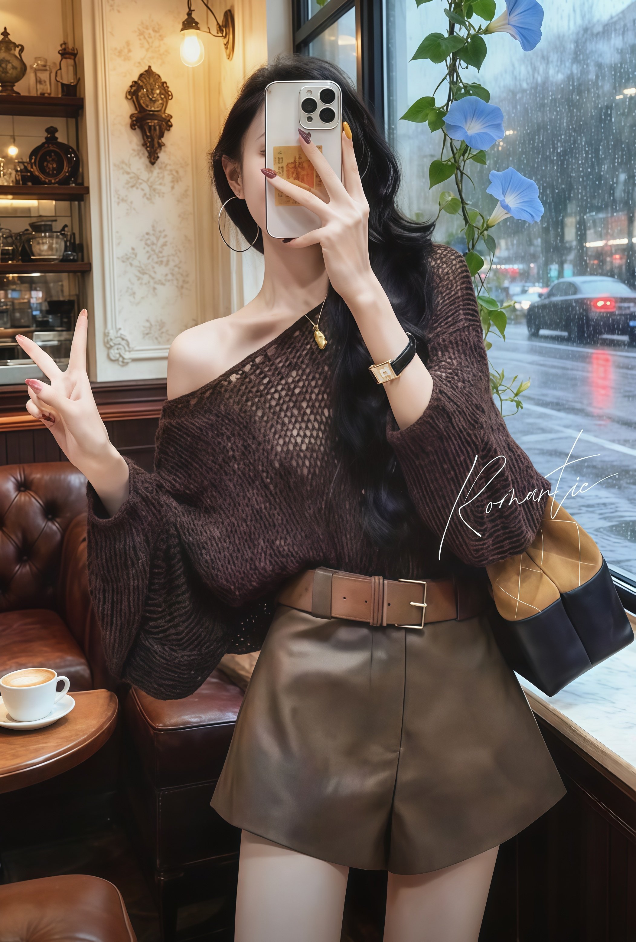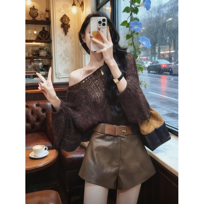慵懶風咖色斜肩破洞毛衣鏤空針織衫女2025新款韓系氛圍感早秋上衣