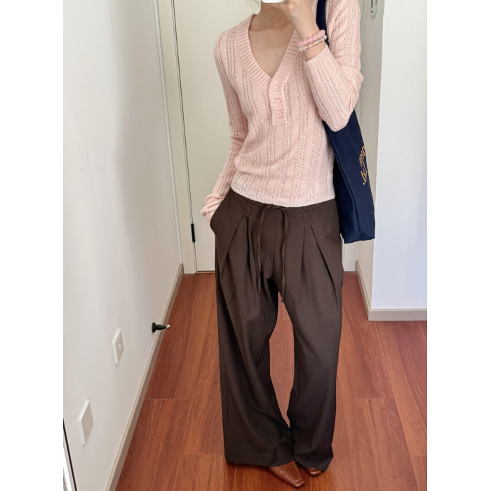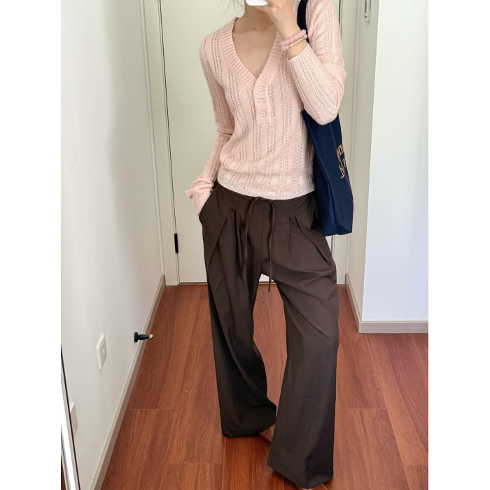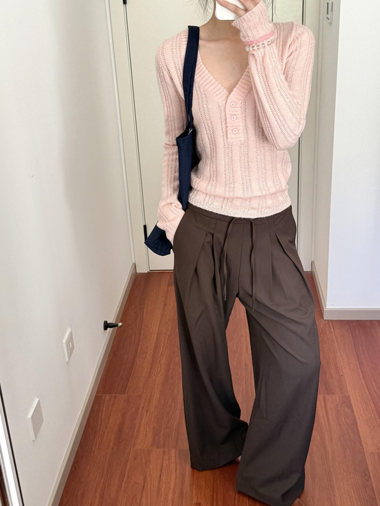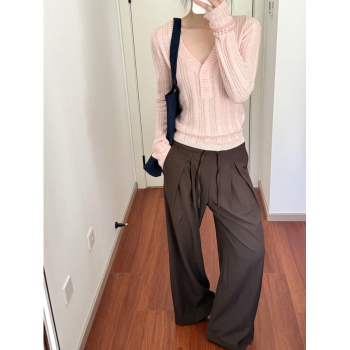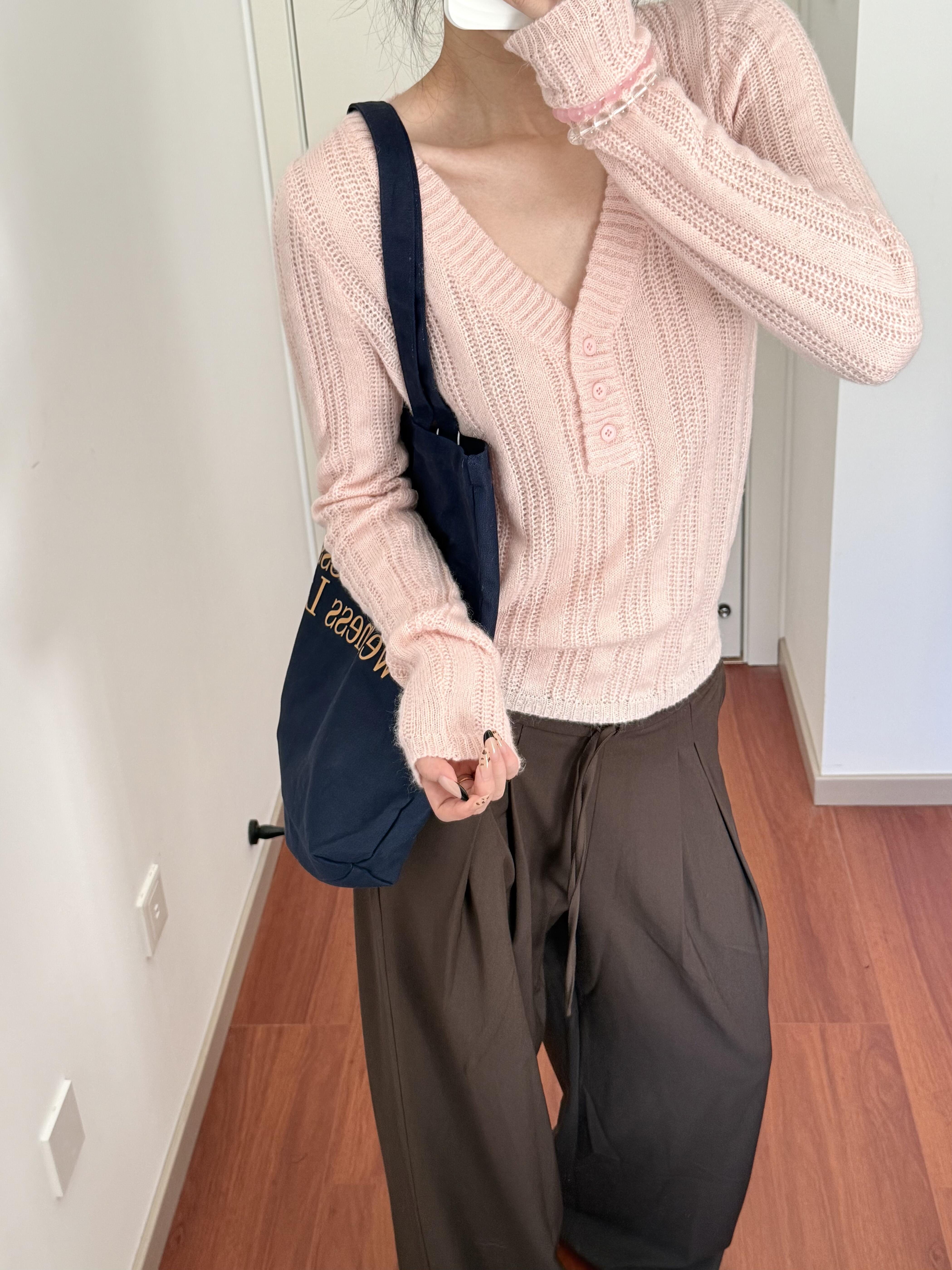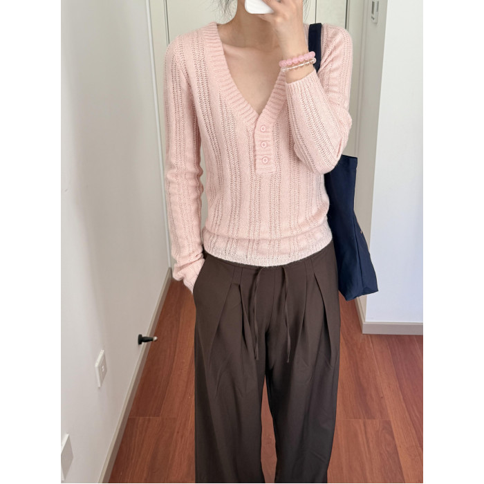 Wild leek韓系休閒V領紐釦毛織螺紋鏤空針織衫長袖修身顯瘦上衣女