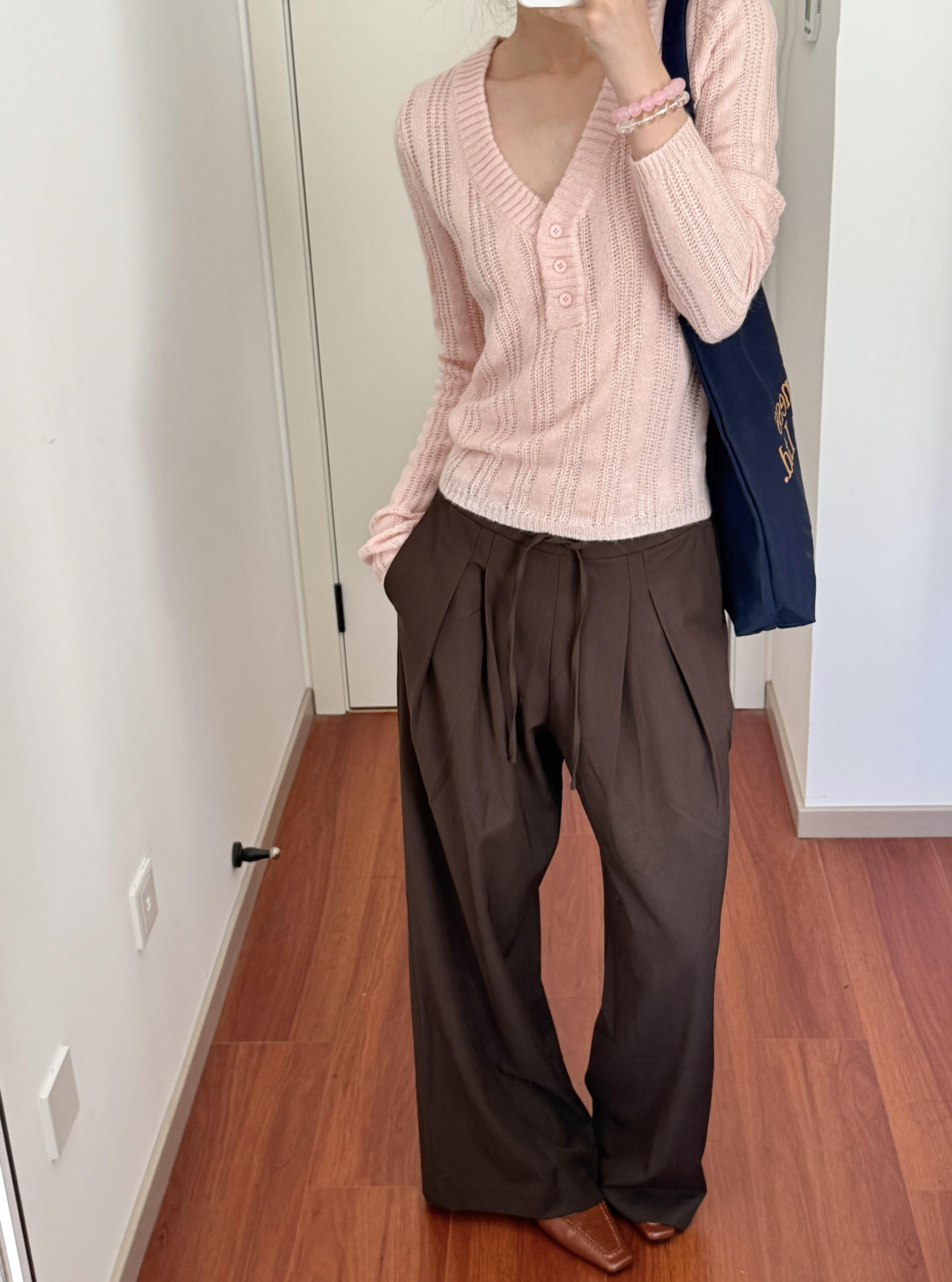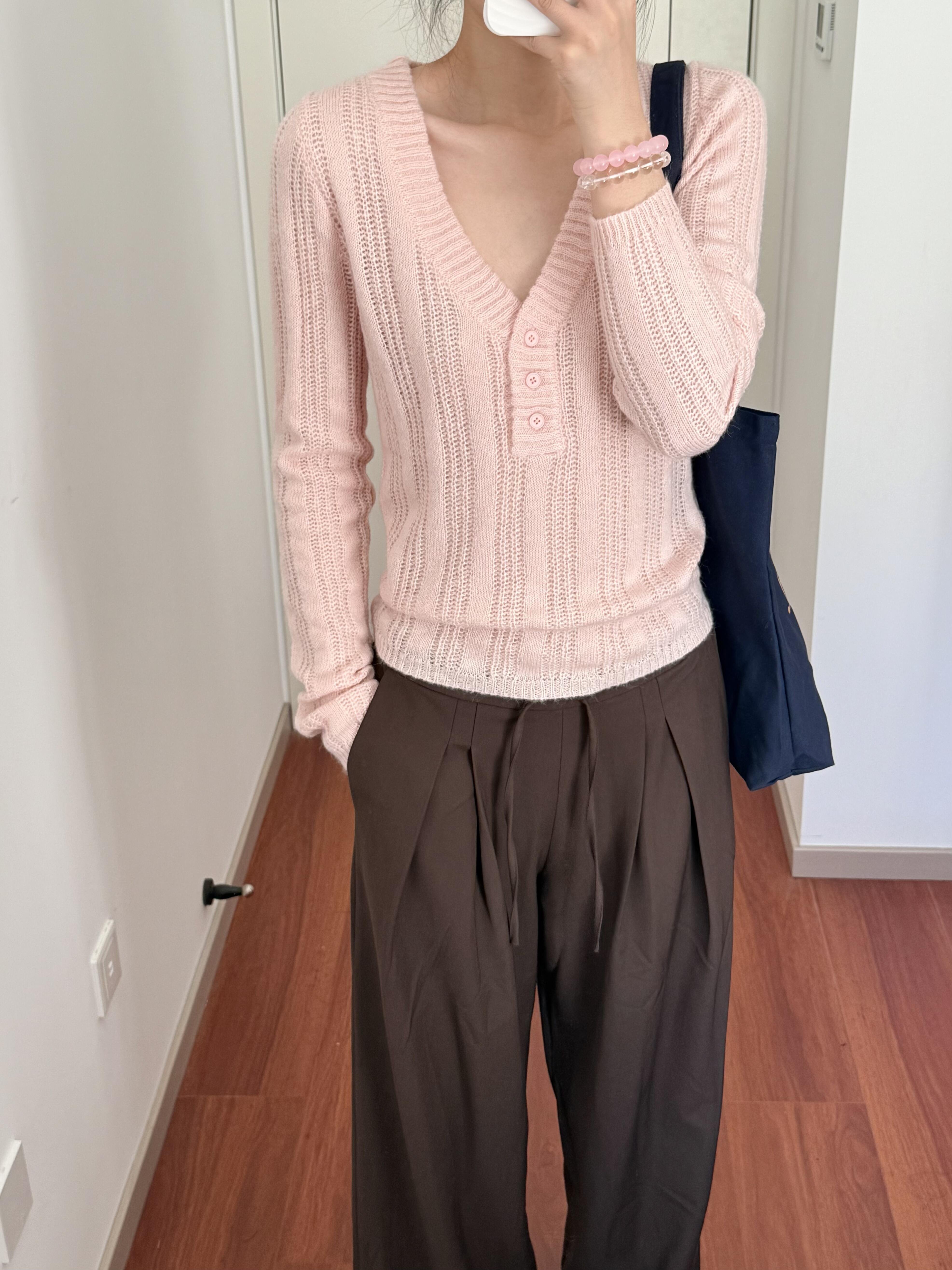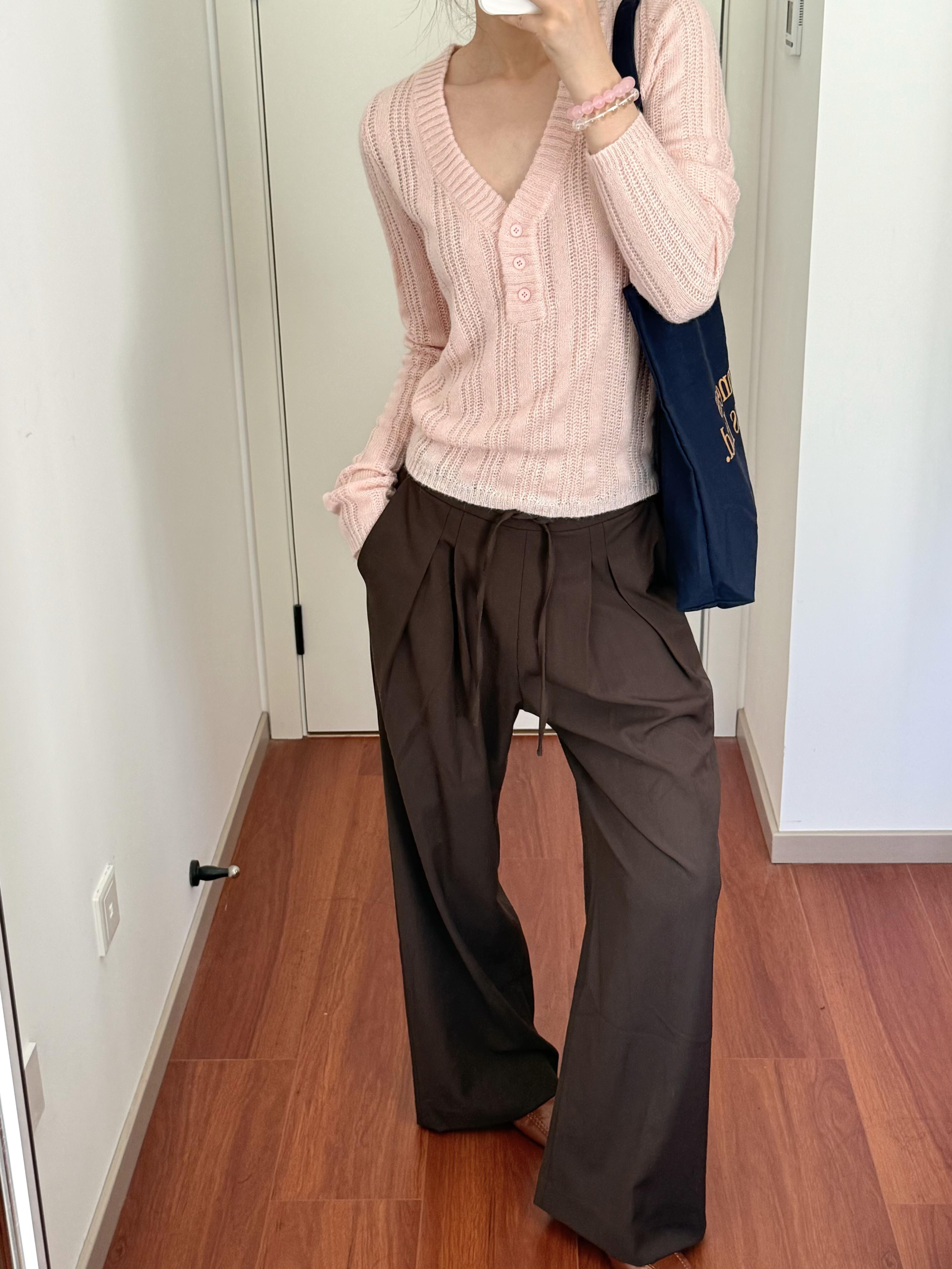 Wild leek韓系休閒V領紐釦毛織螺紋鏤空針織衫長袖修身顯瘦上衣女