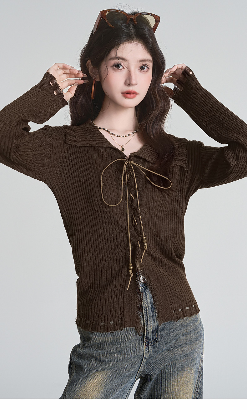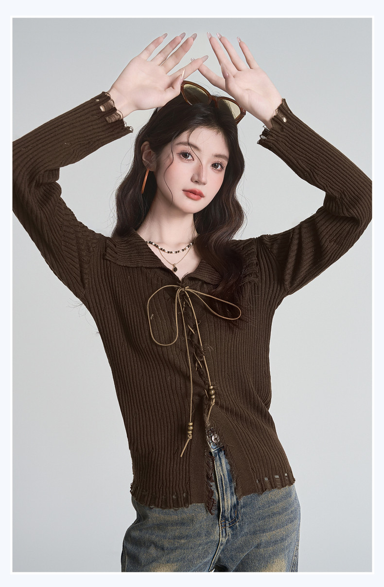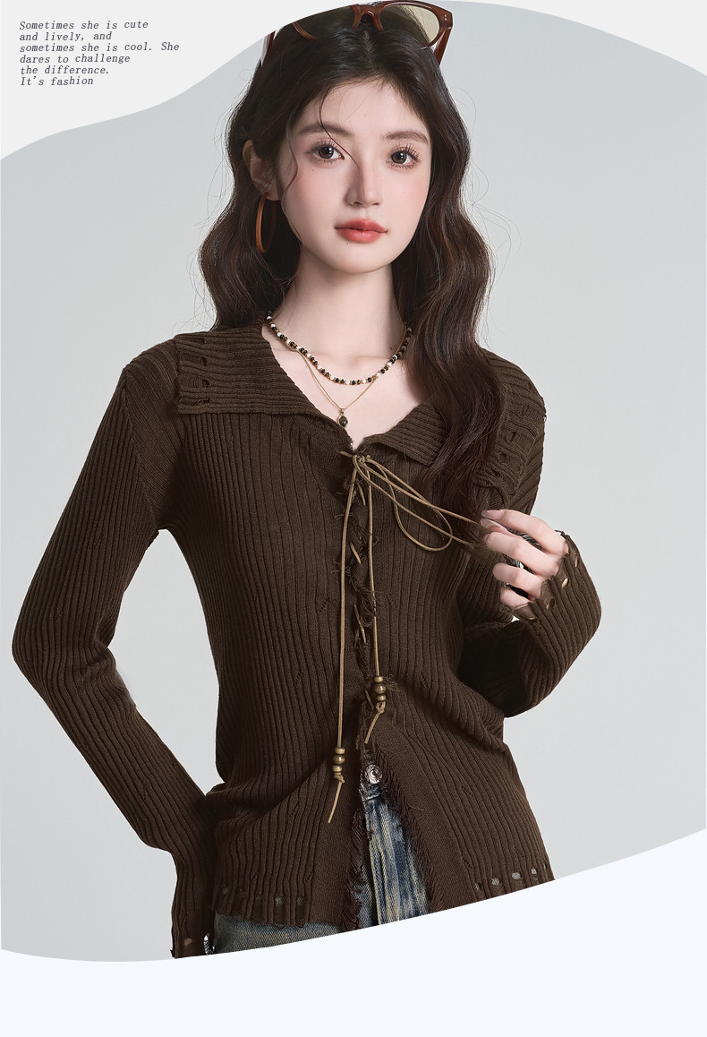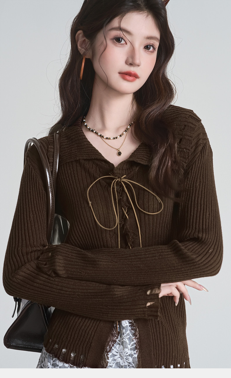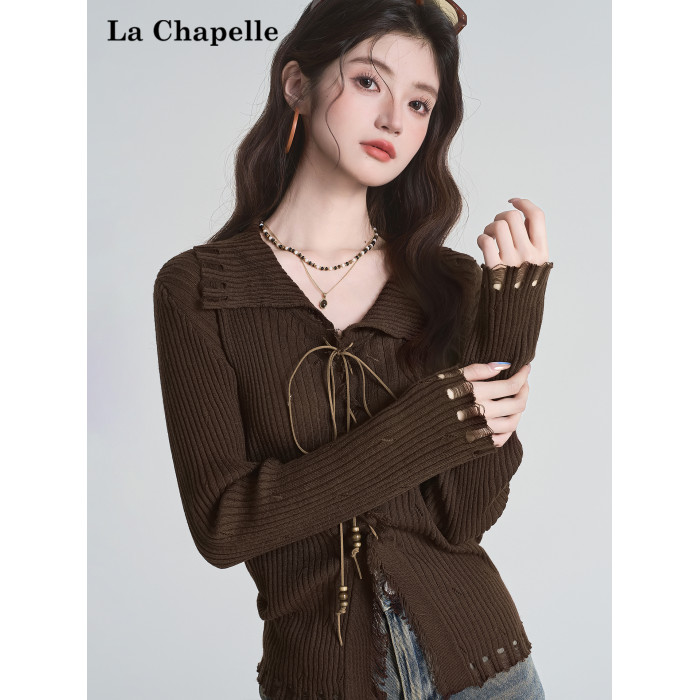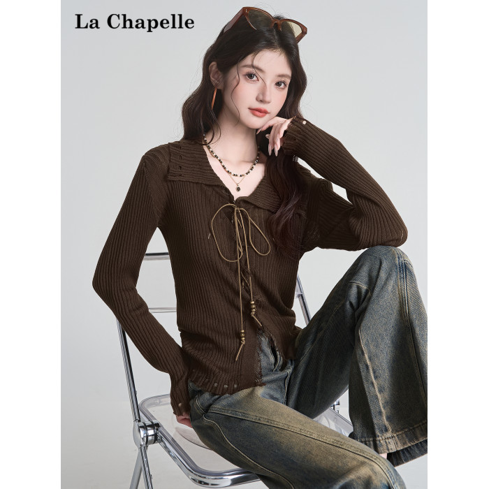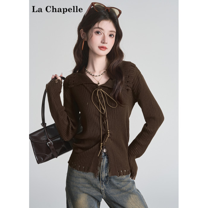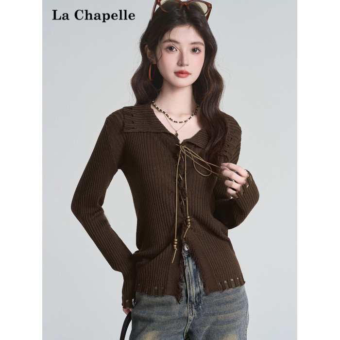 拉夏貝爾咖色毛衣設計感長袖毛邊綁帶針織開衫女翻領打底上衣秋季