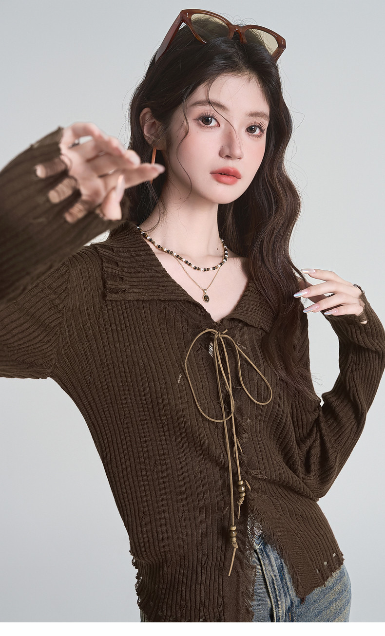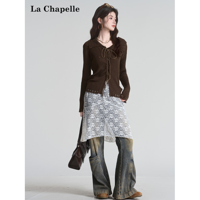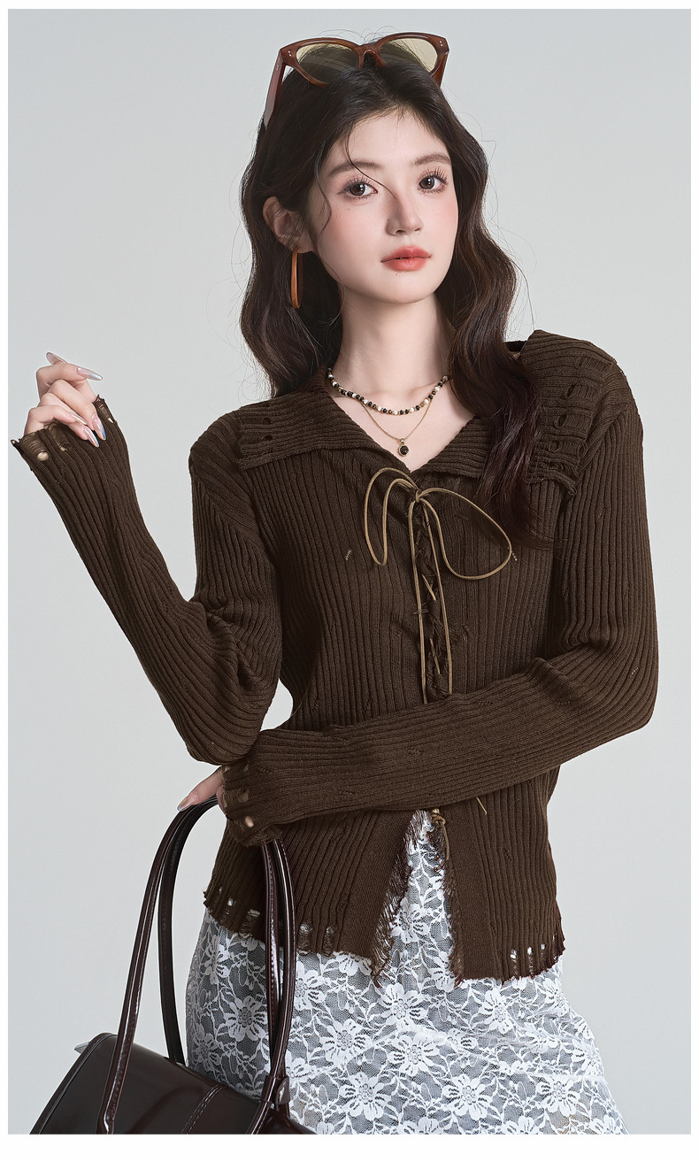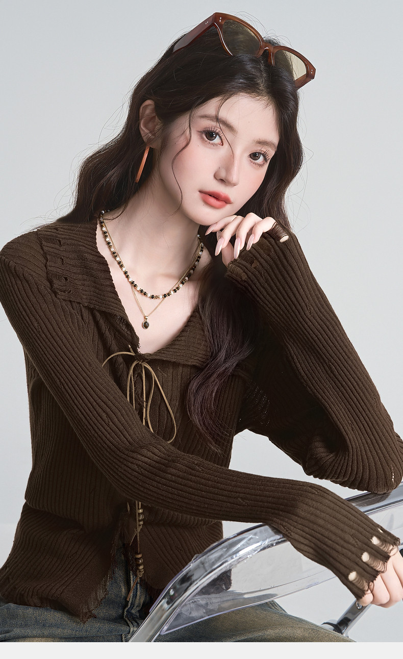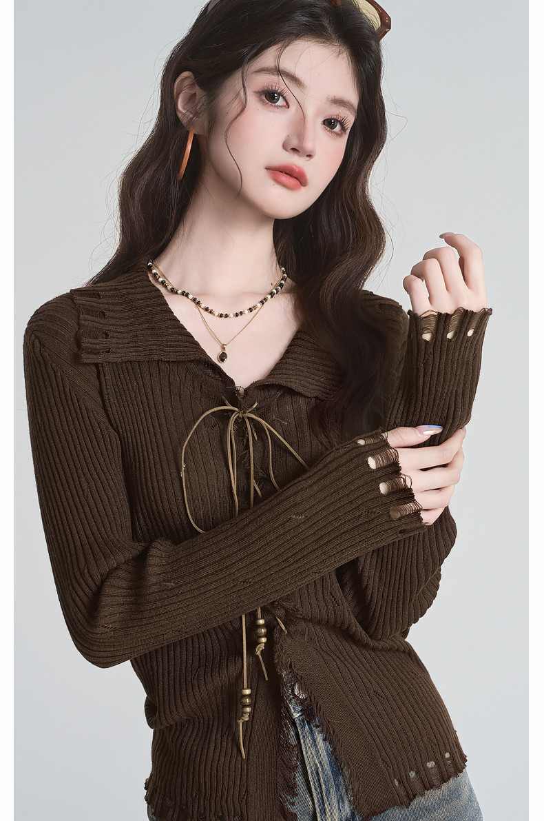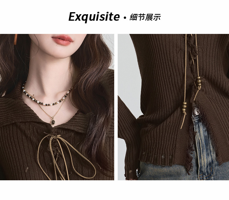 拉夏貝爾咖色毛衣設計感長袖毛邊綁帶針織開衫女翻領打底上衣秋季