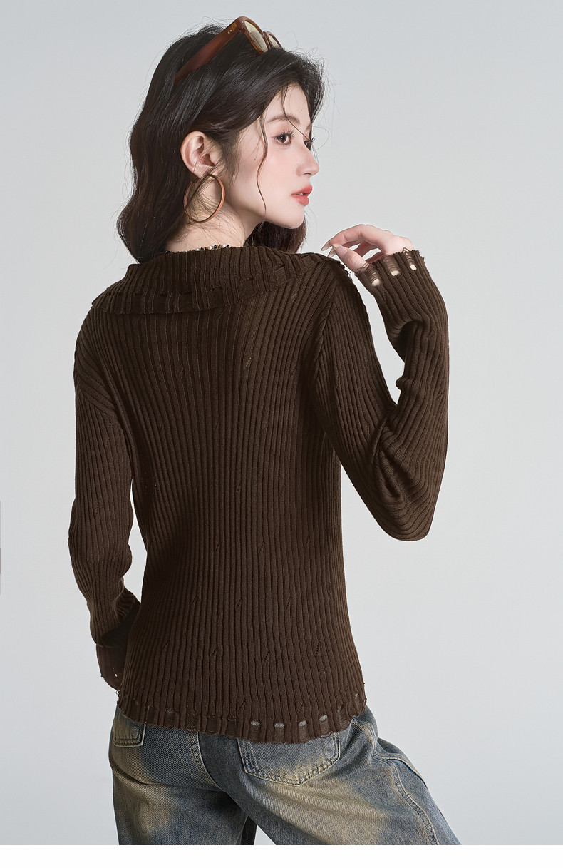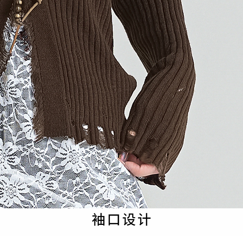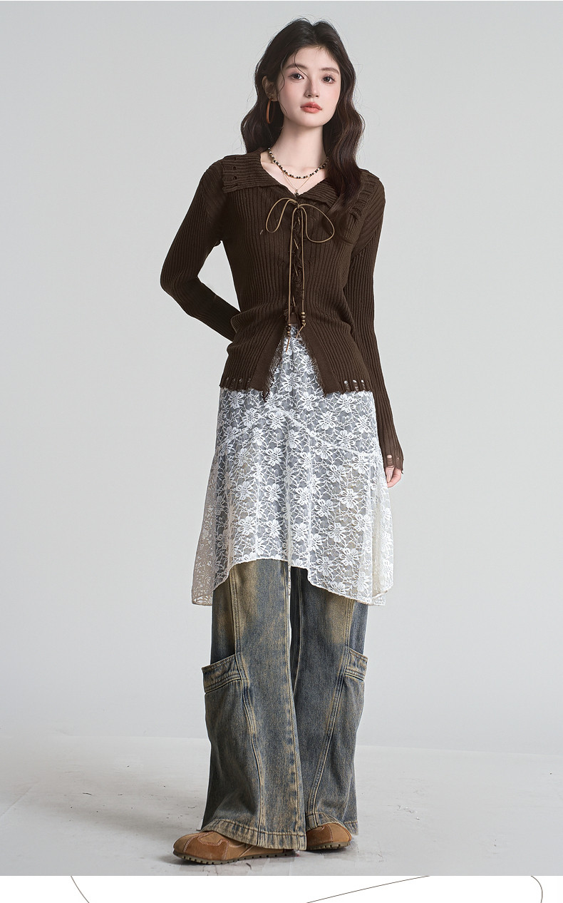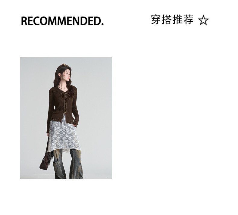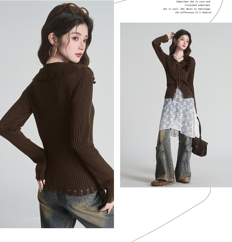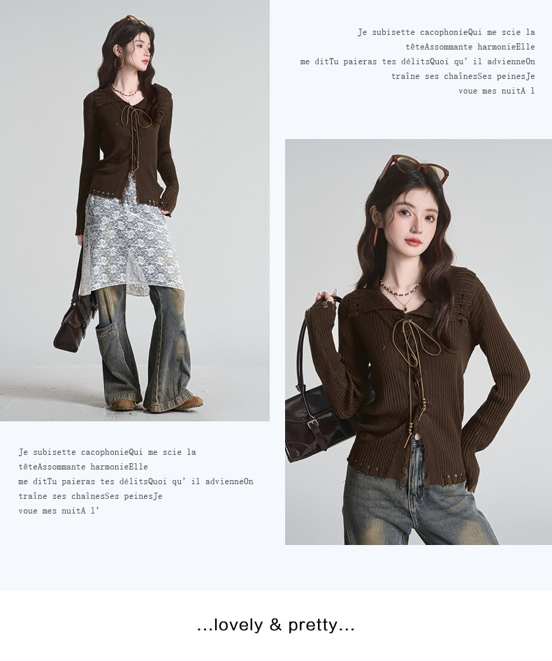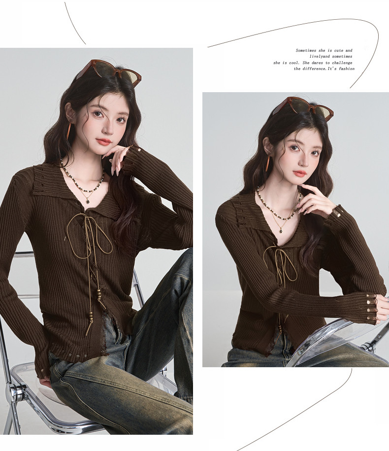 拉夏貝爾咖色毛衣設計感長袖毛邊綁帶針織開衫女翻領打底上衣秋季
