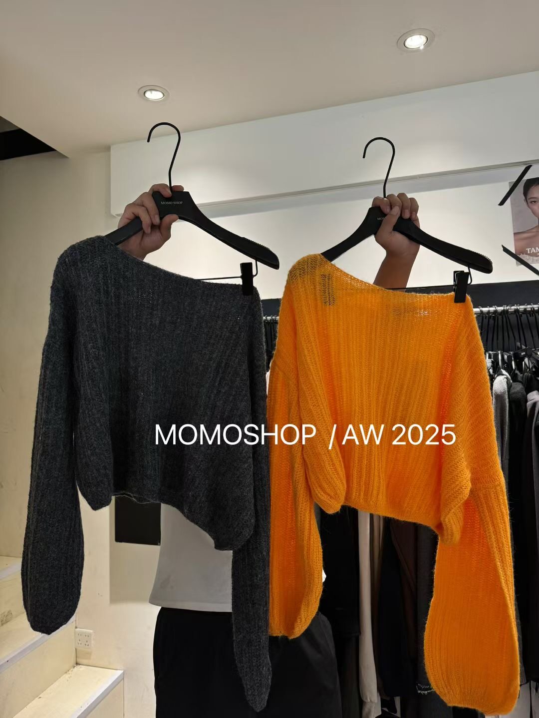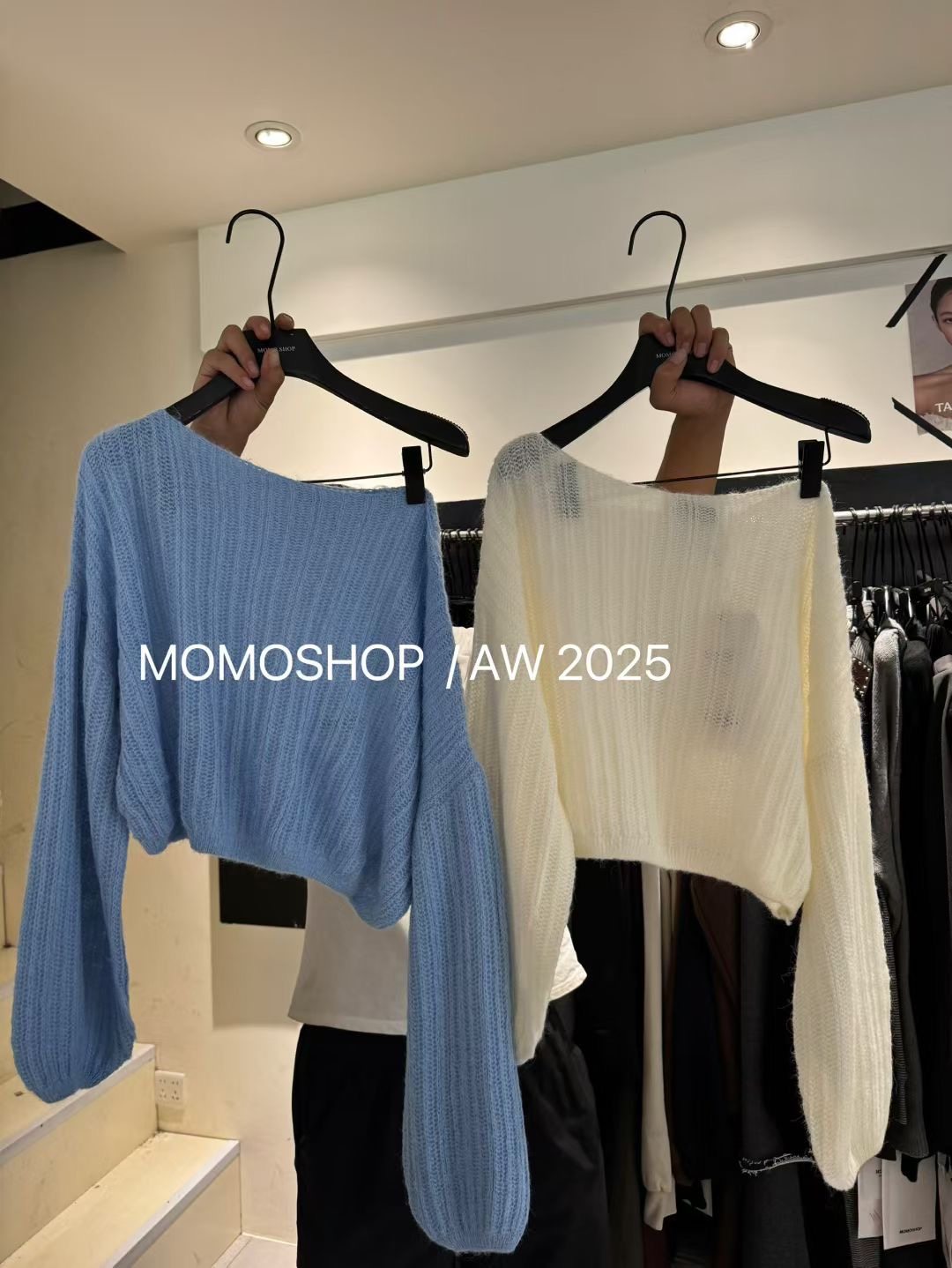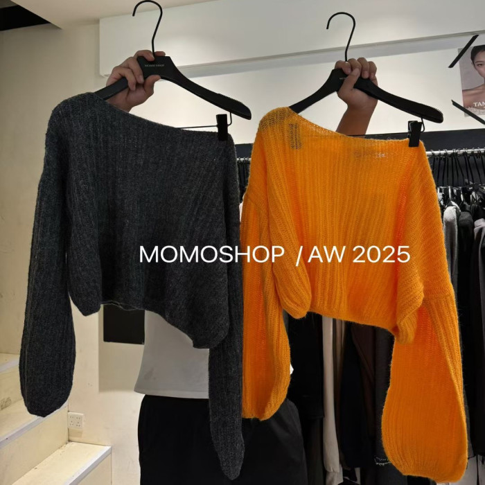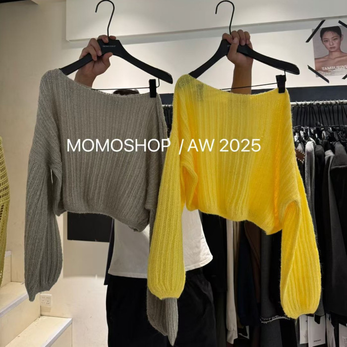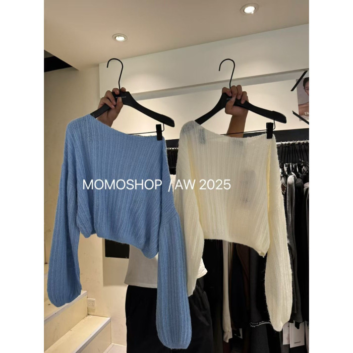 2025秋款韓版設計小衆簡約慵懶風斜肩針織衫毛衣百搭長袖上衣