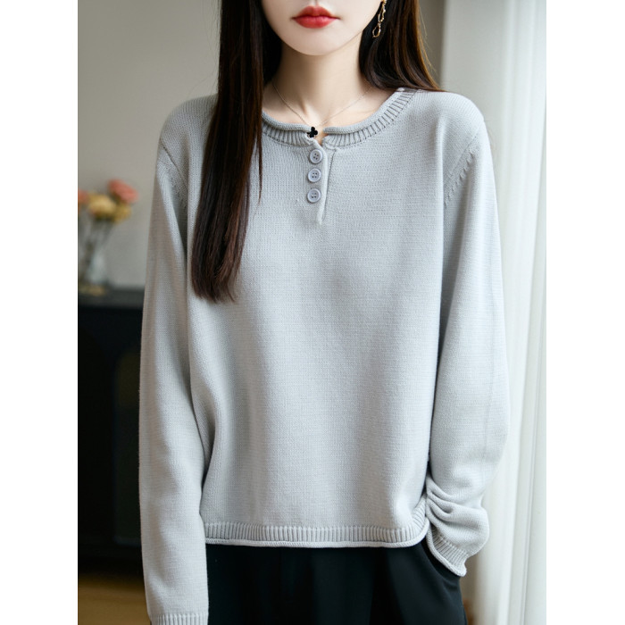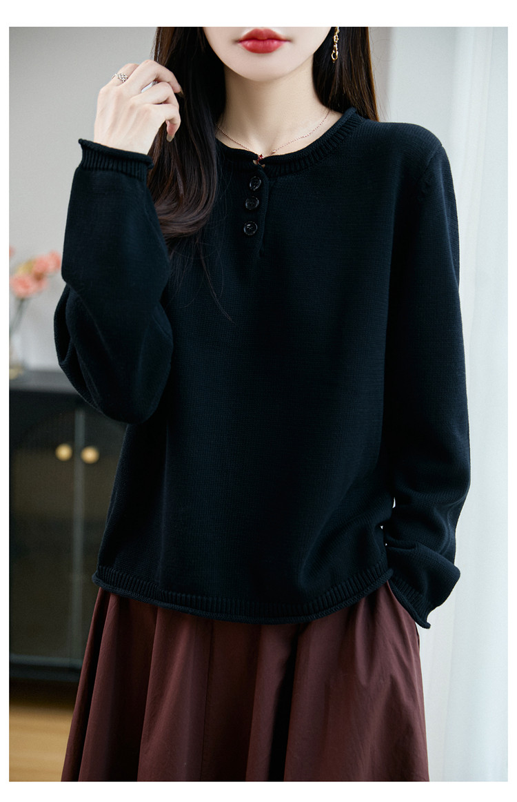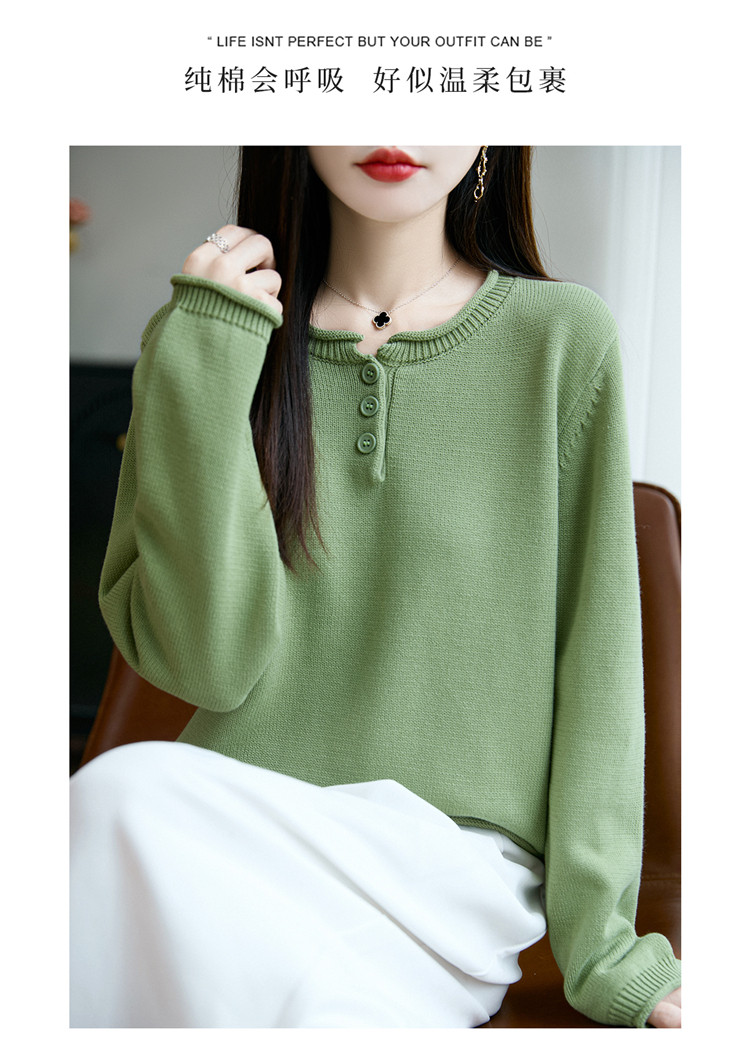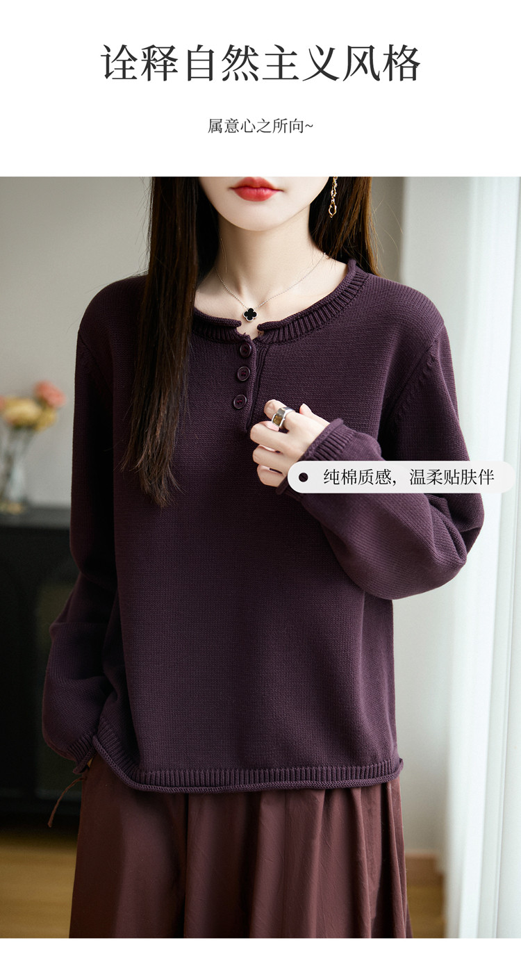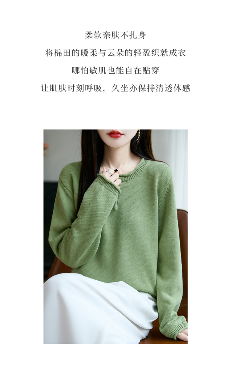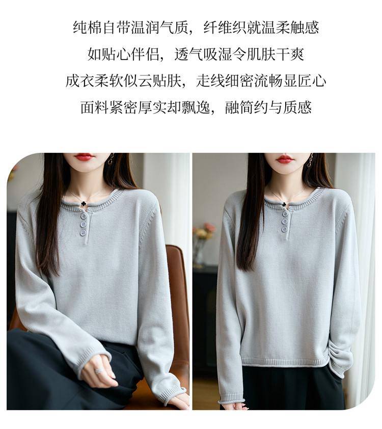 100%純棉線卷邊圓領長袖針織衫女加厚寬松套頭打底衫全棉顯瘦上衣