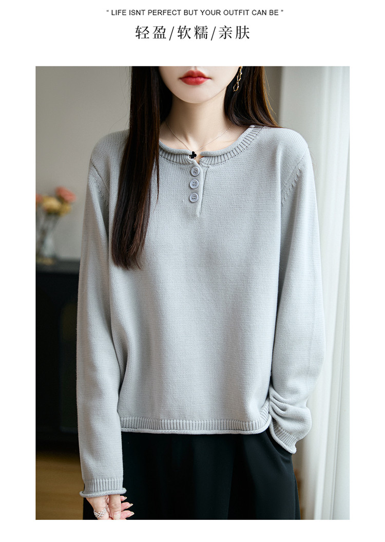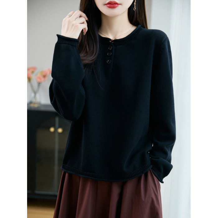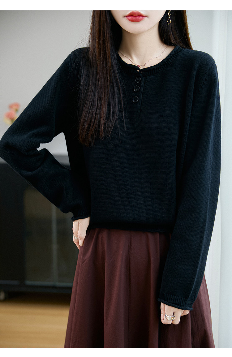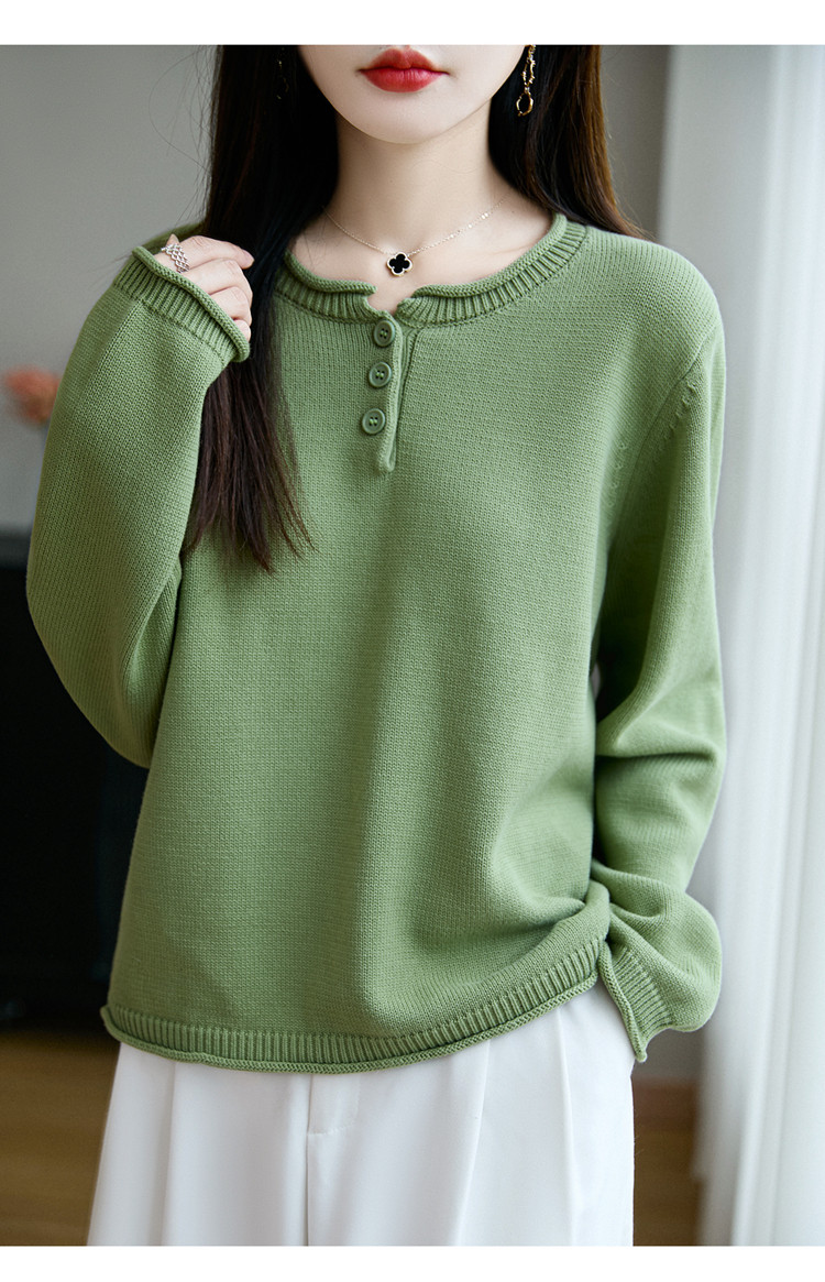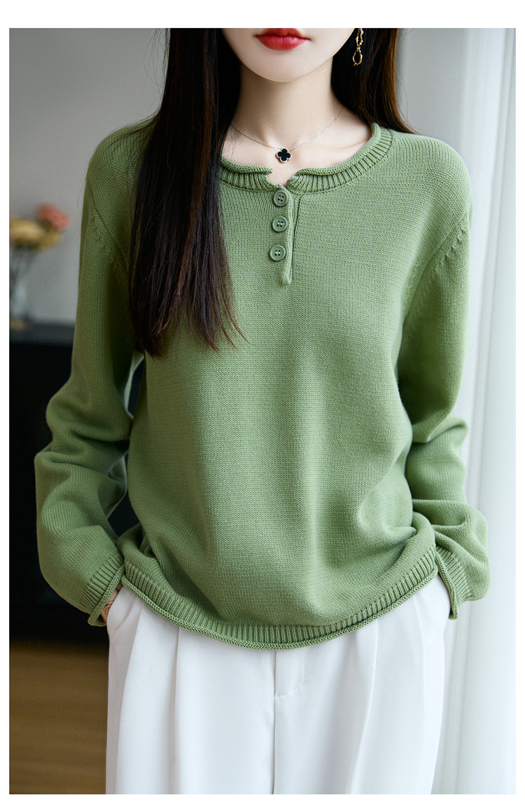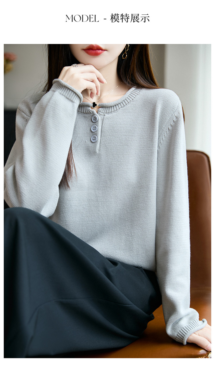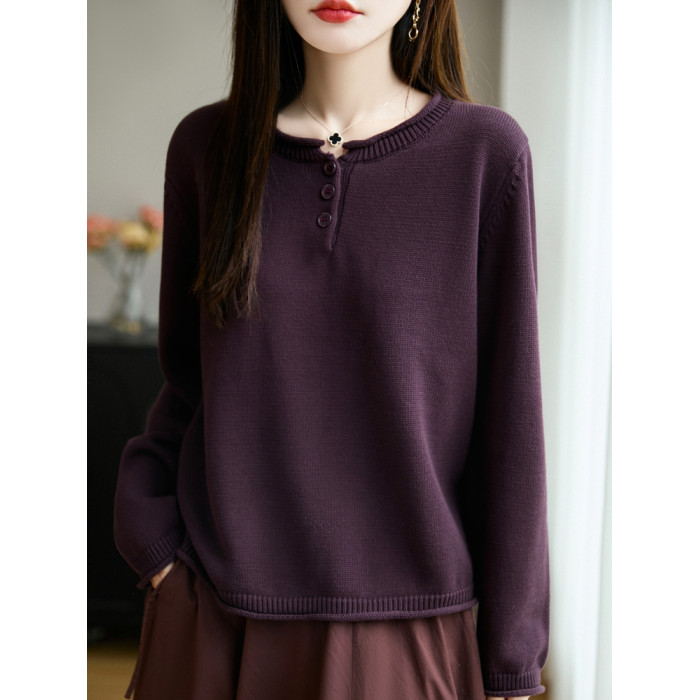 100%純棉線卷邊圓領長袖針織衫女加厚寬松套頭打底衫全棉顯瘦上衣