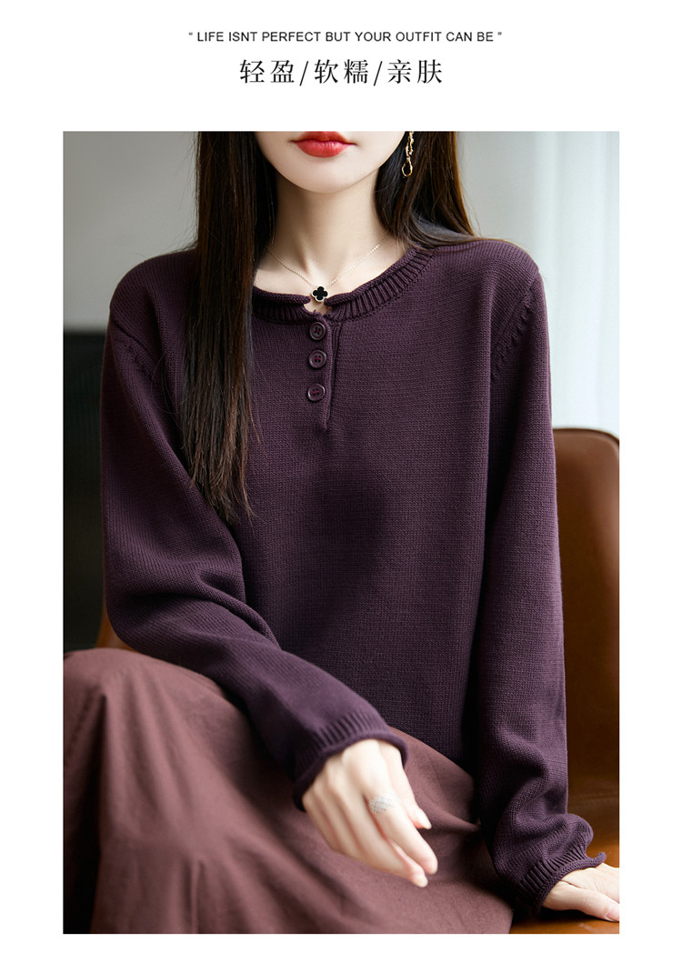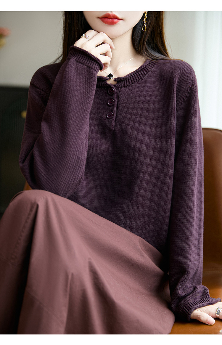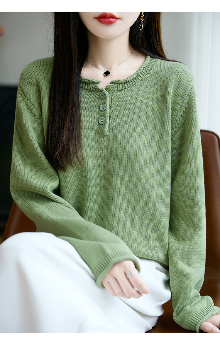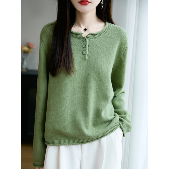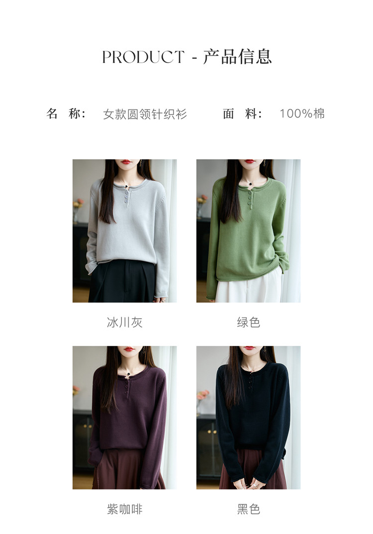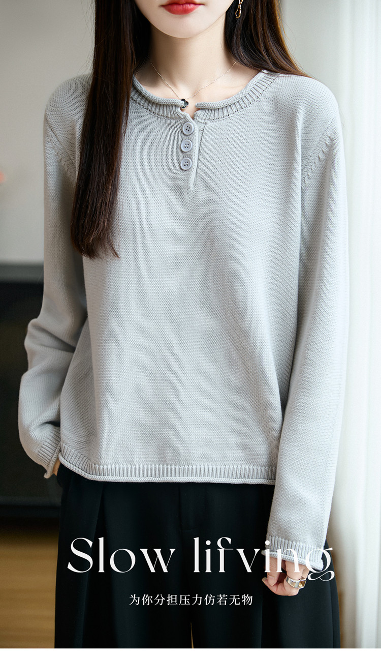 100%純棉線卷邊圓領長袖針織衫女加厚寬松套頭打底衫全棉顯瘦上衣