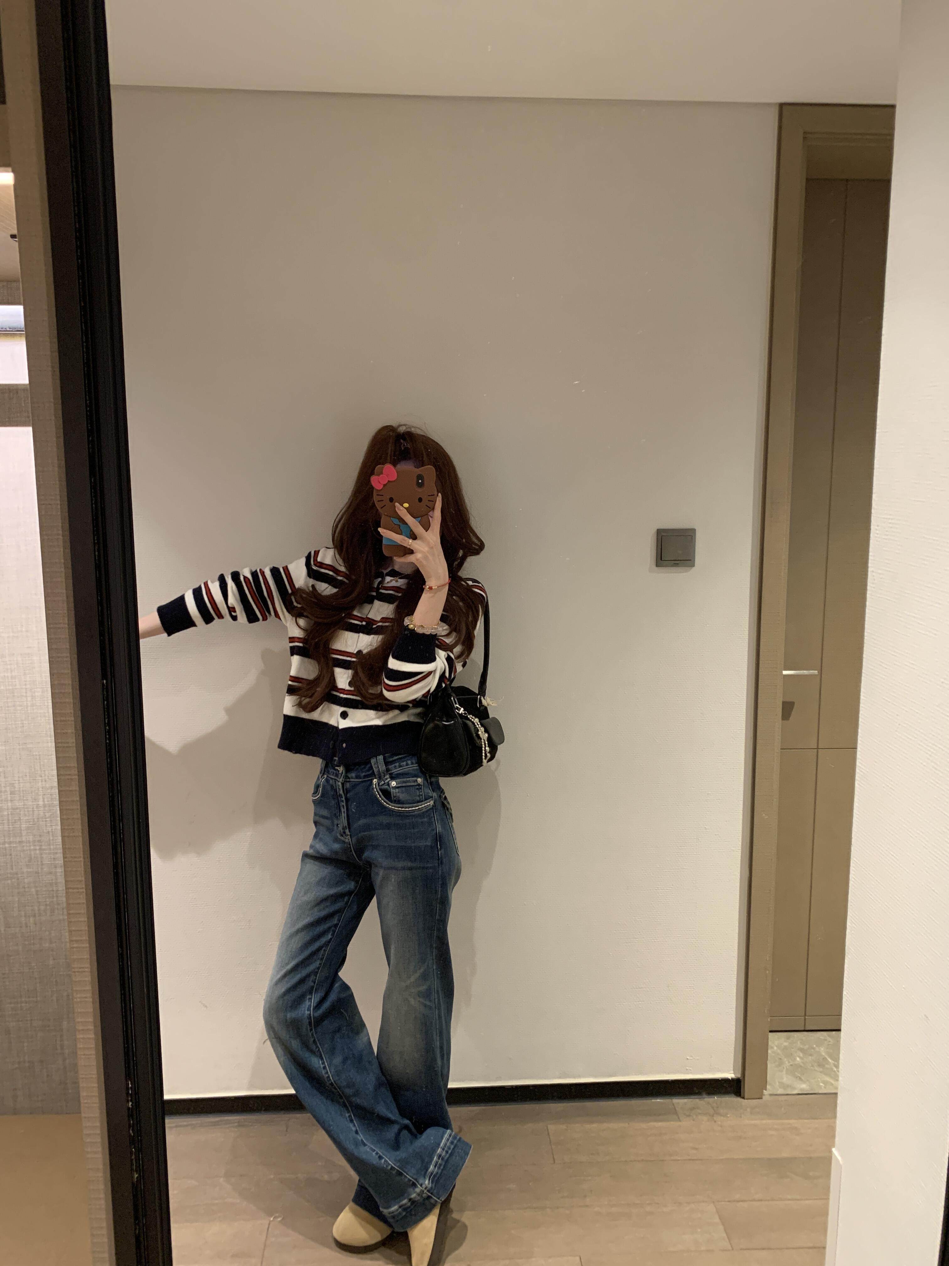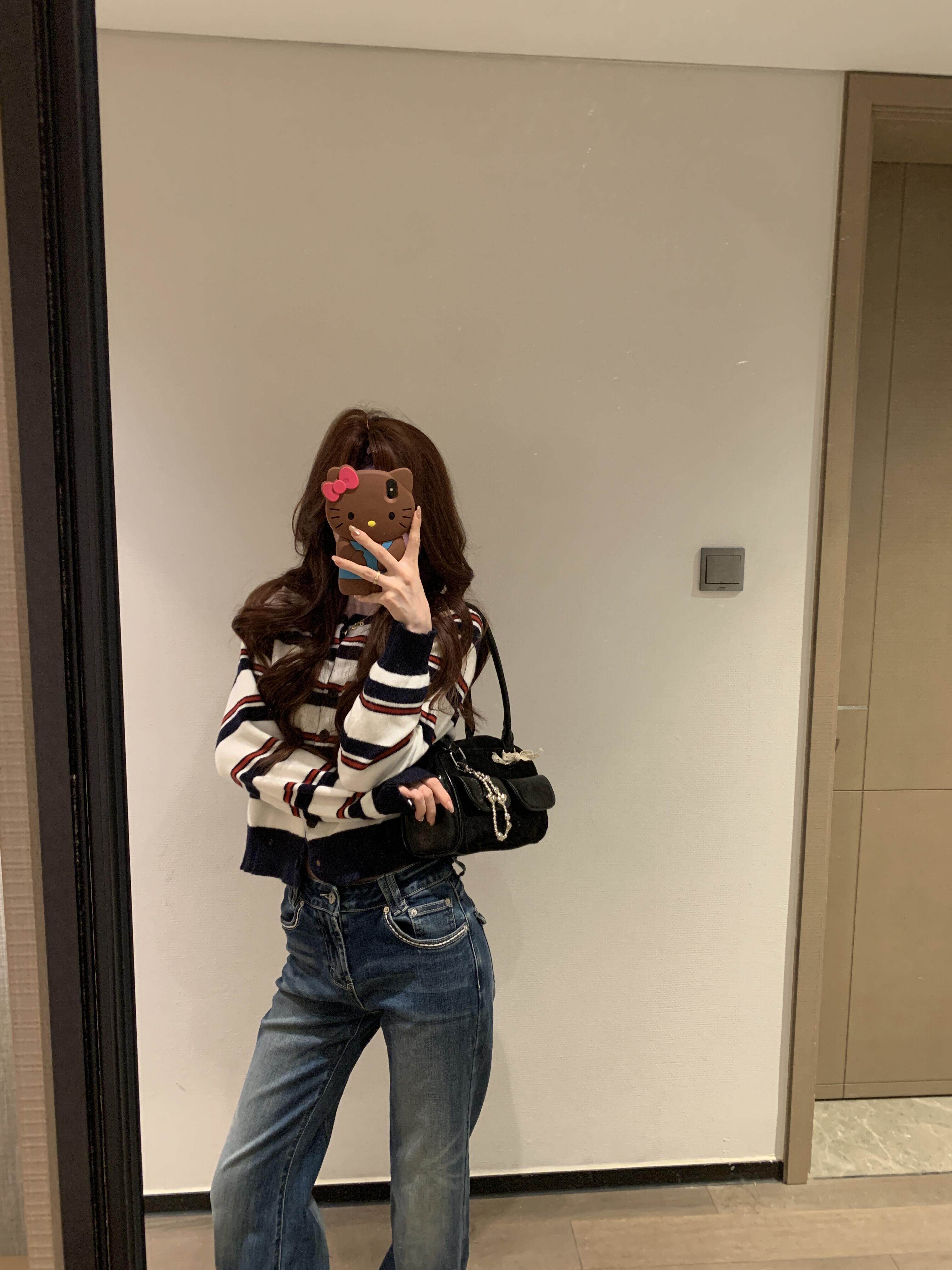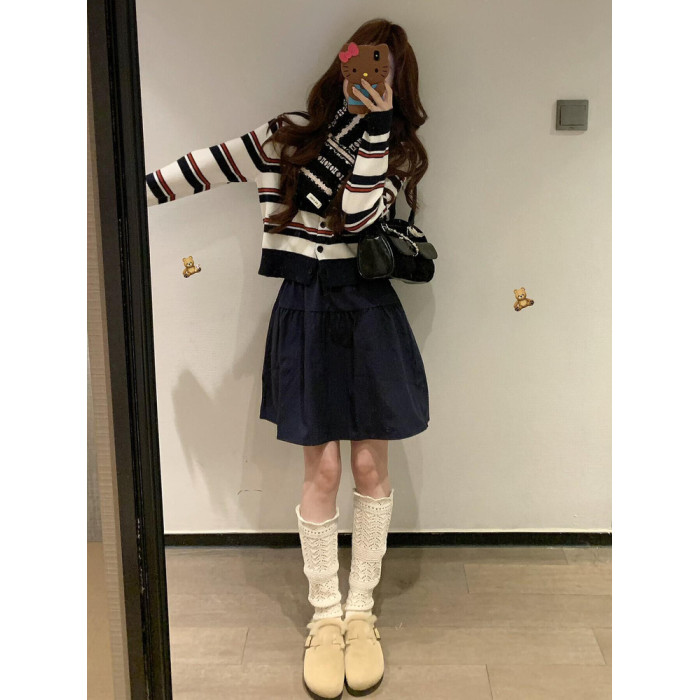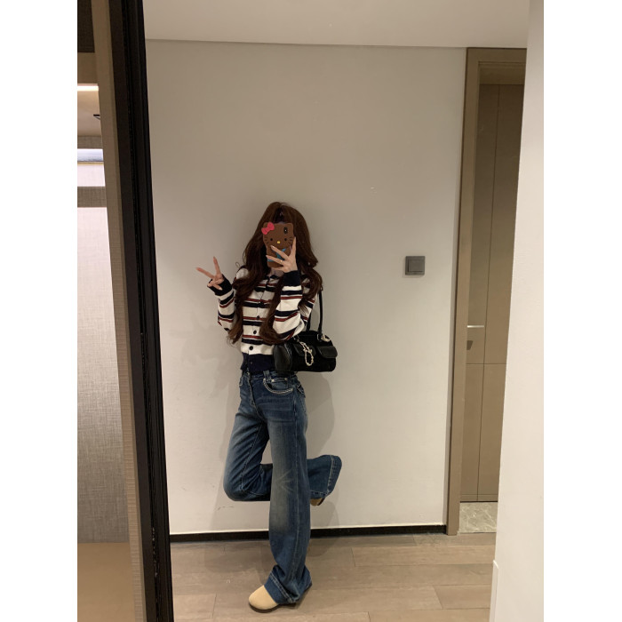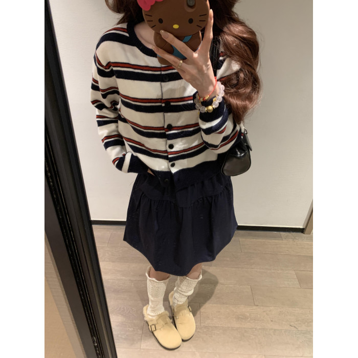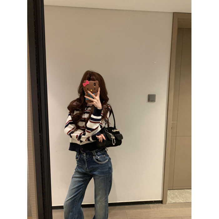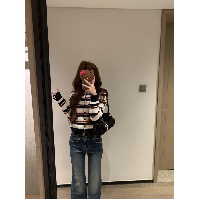 2025新款早秋季撞色條紋針織衫上衣女裝韓系爆款短款毛衣開衫外套