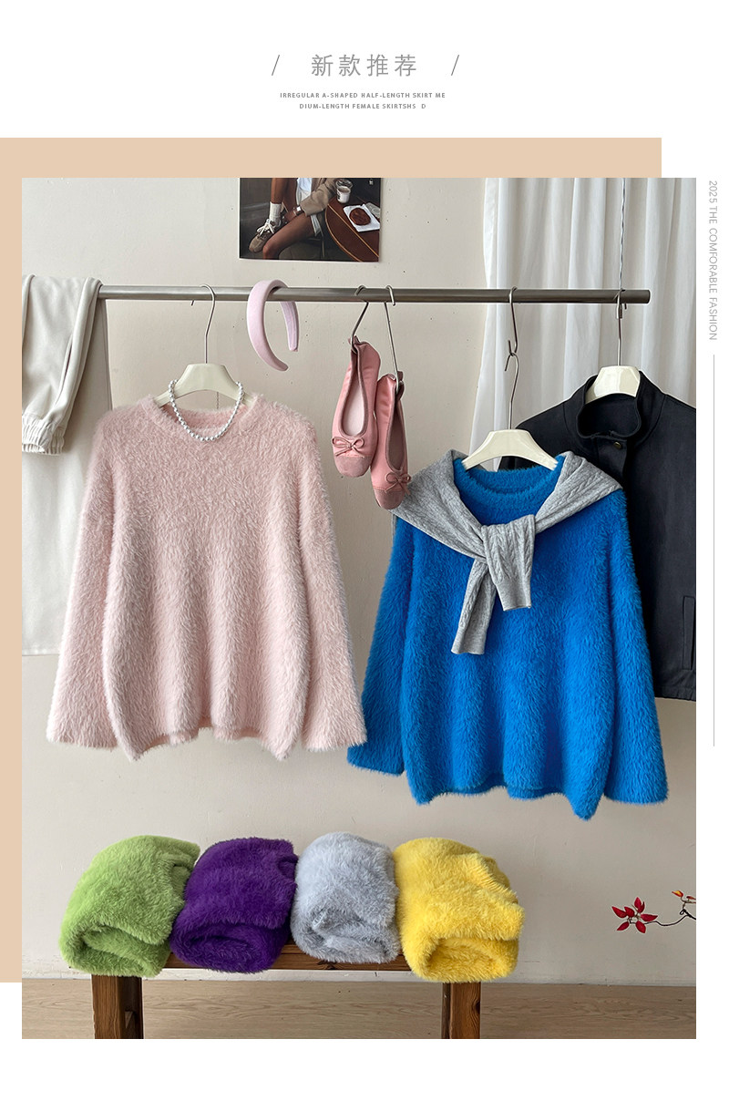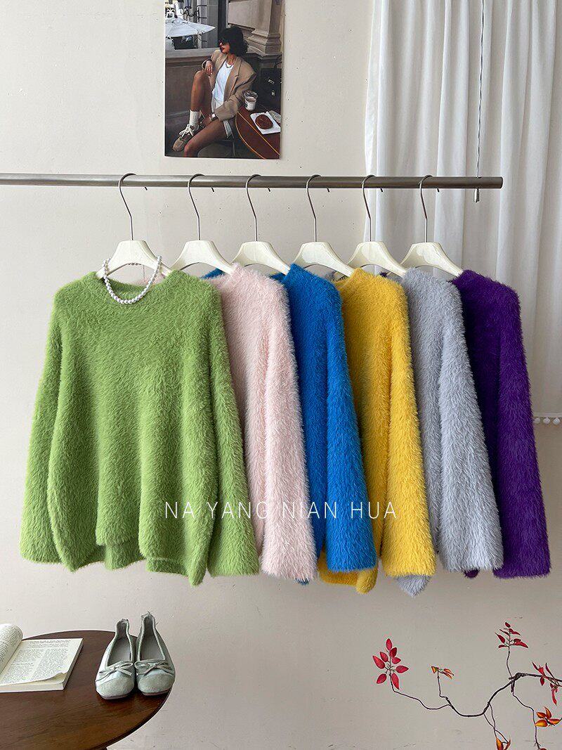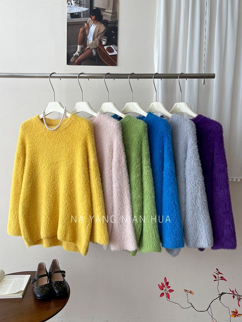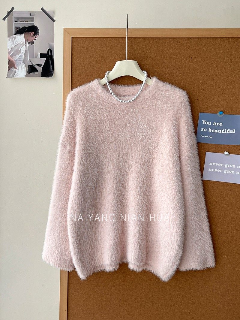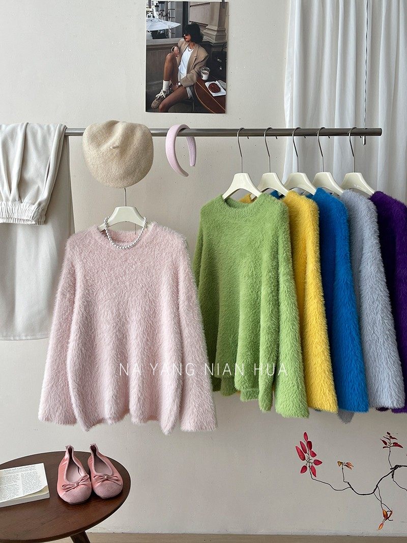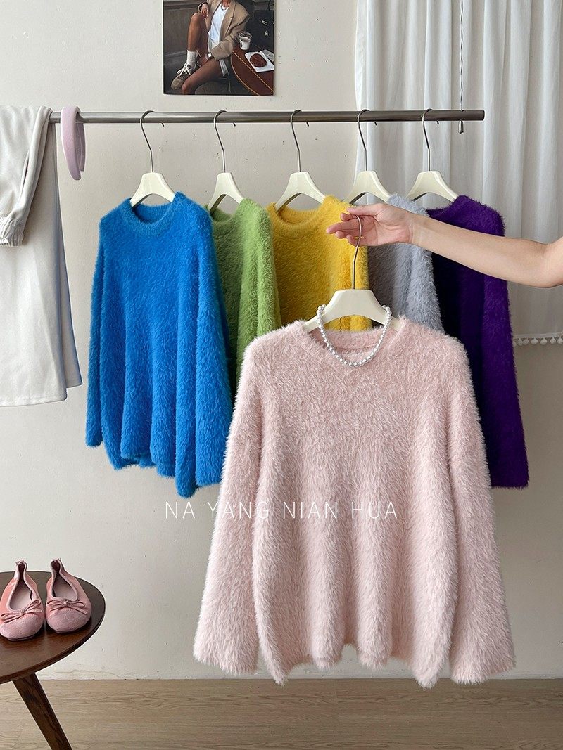 日韓系復古溫柔軟糯水貂絨毛衣女秋冬休閒百搭慵懶風松弛感針織衫