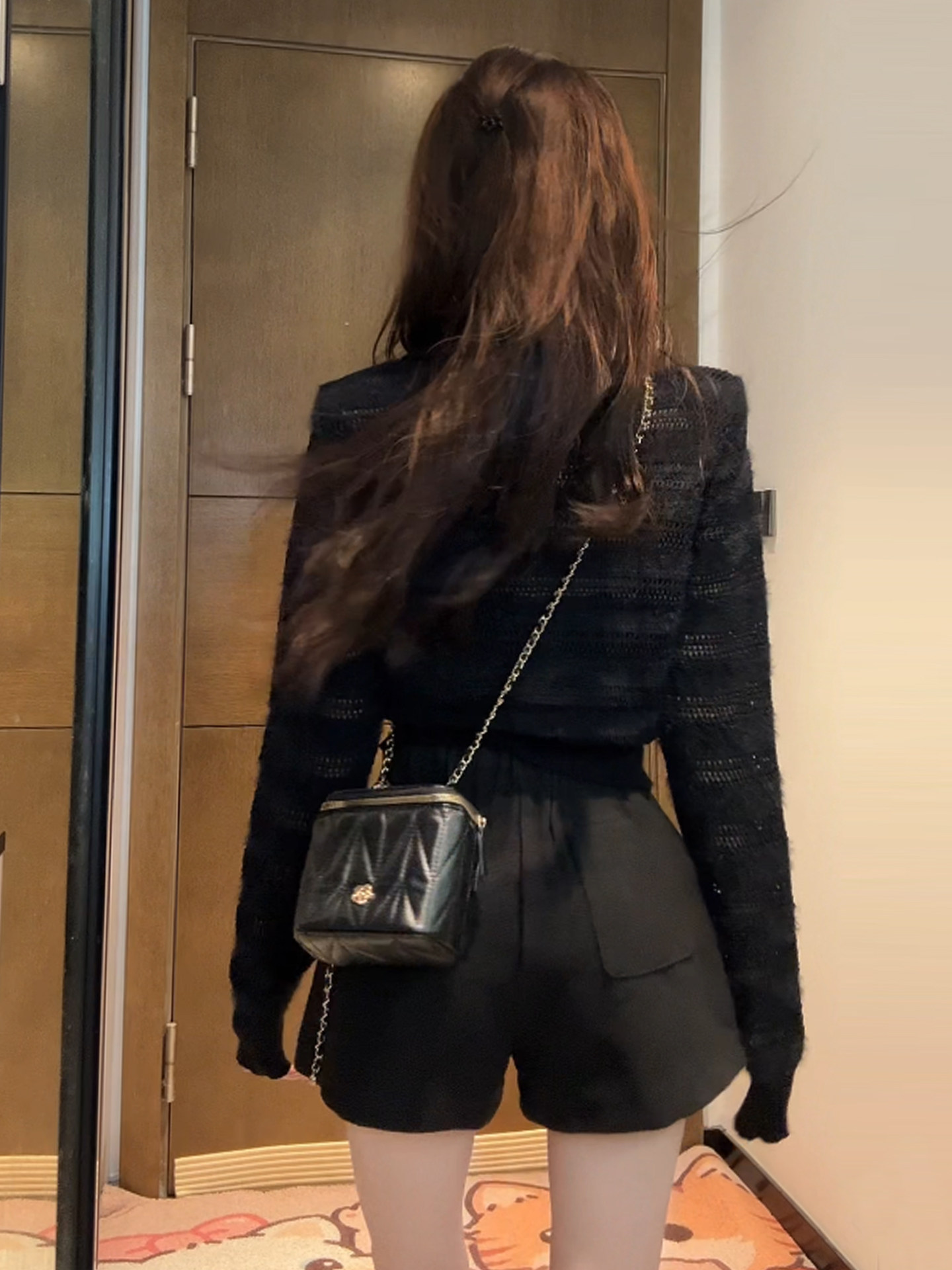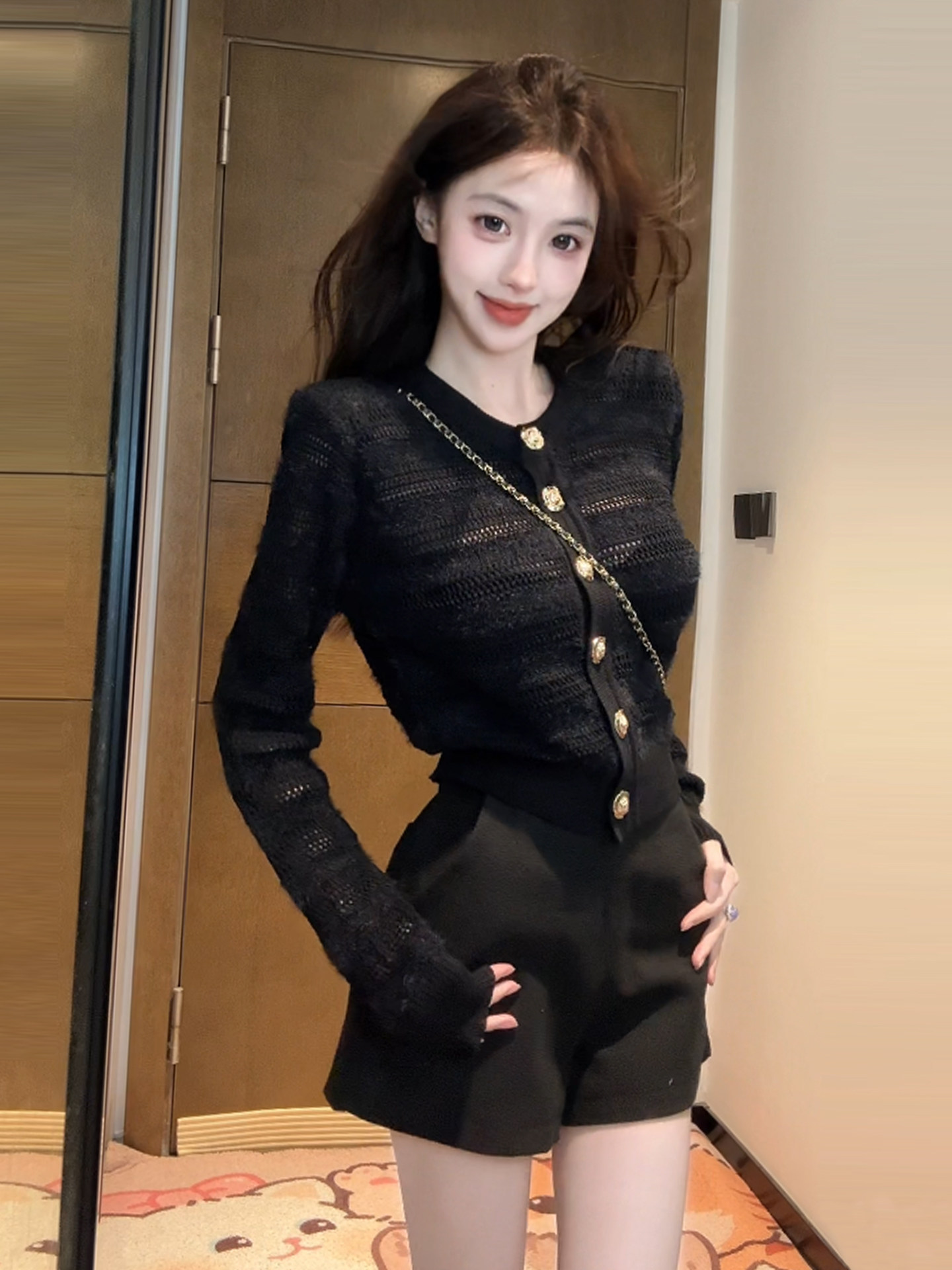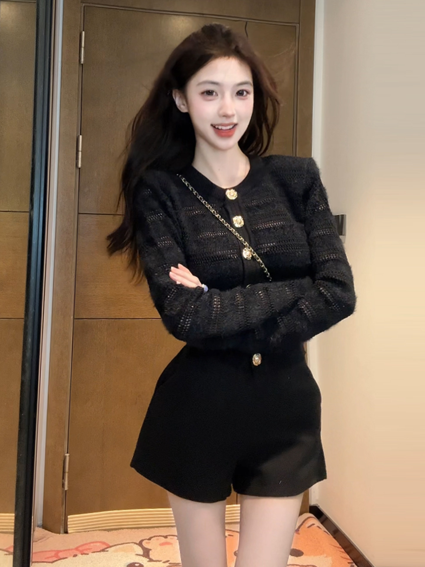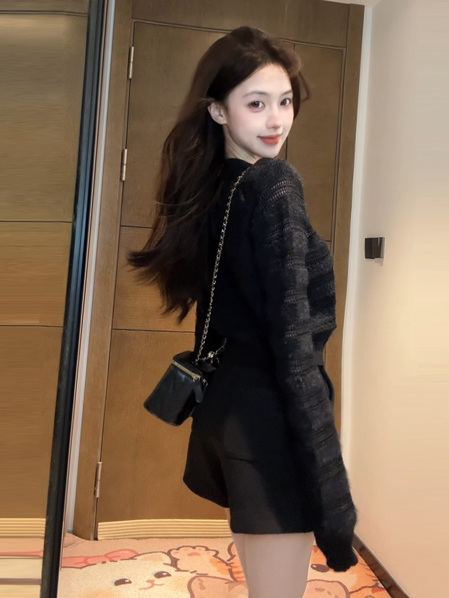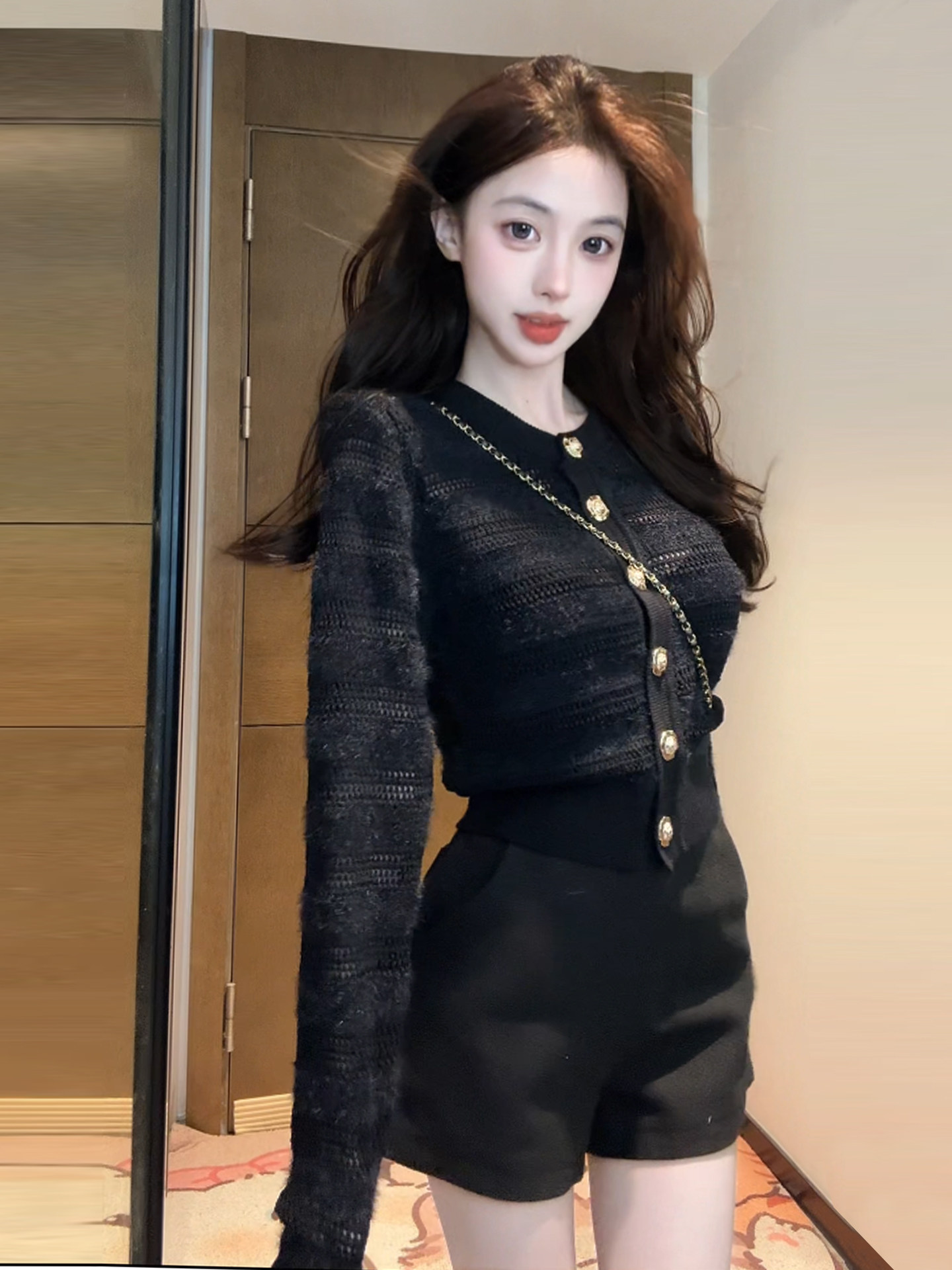 【XIAOBAWANG】黑色圓領針織開衫外套上衣女秋冬小個子收腰上衣