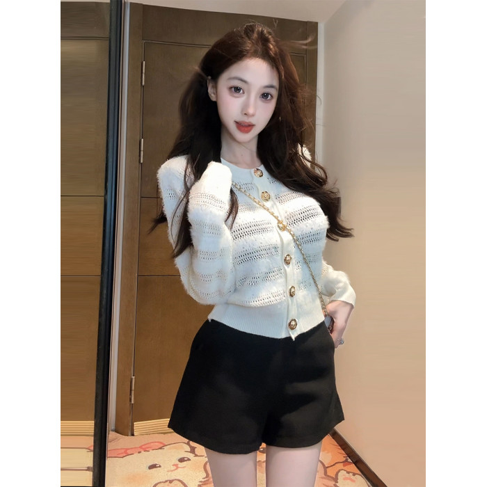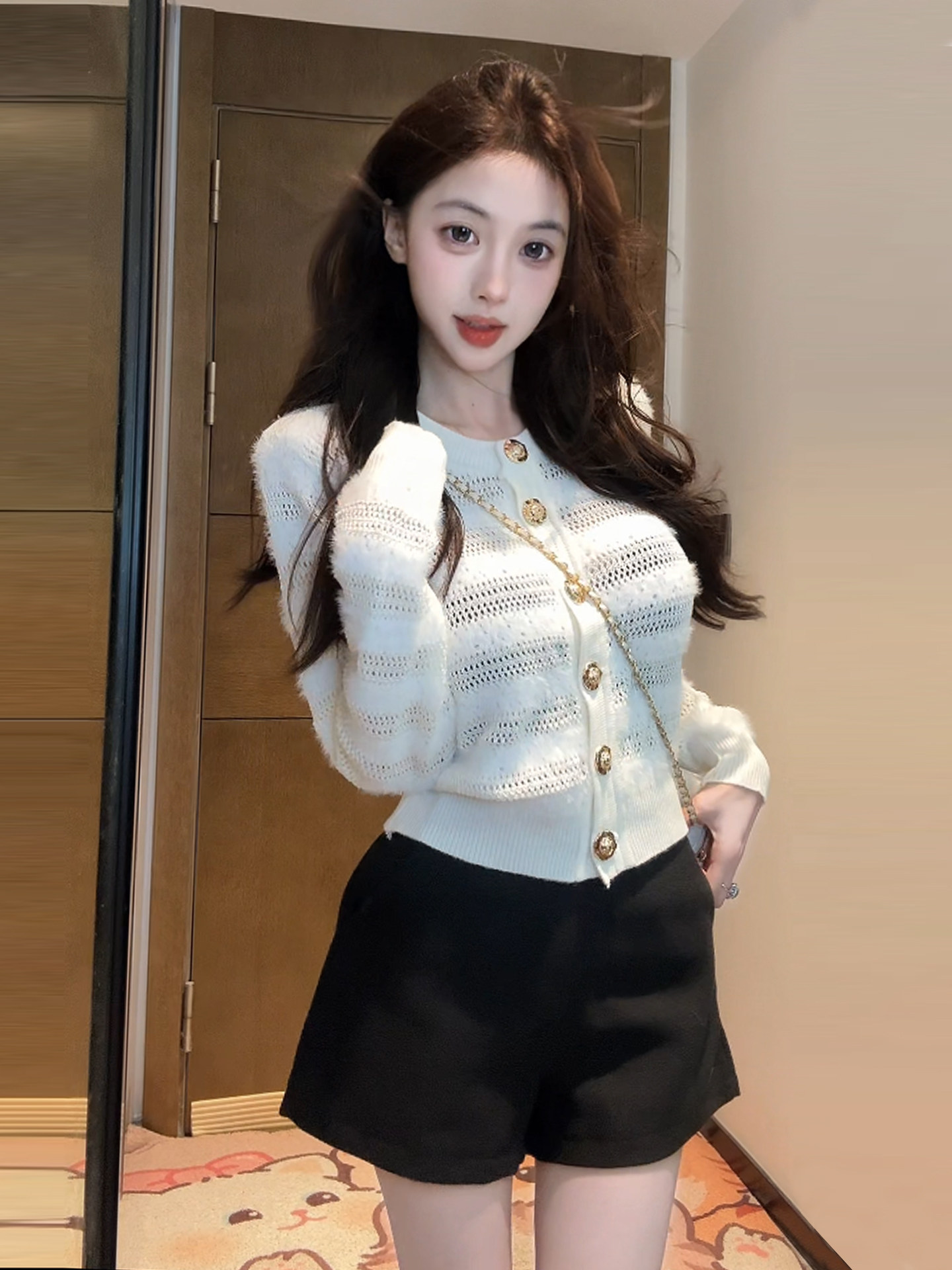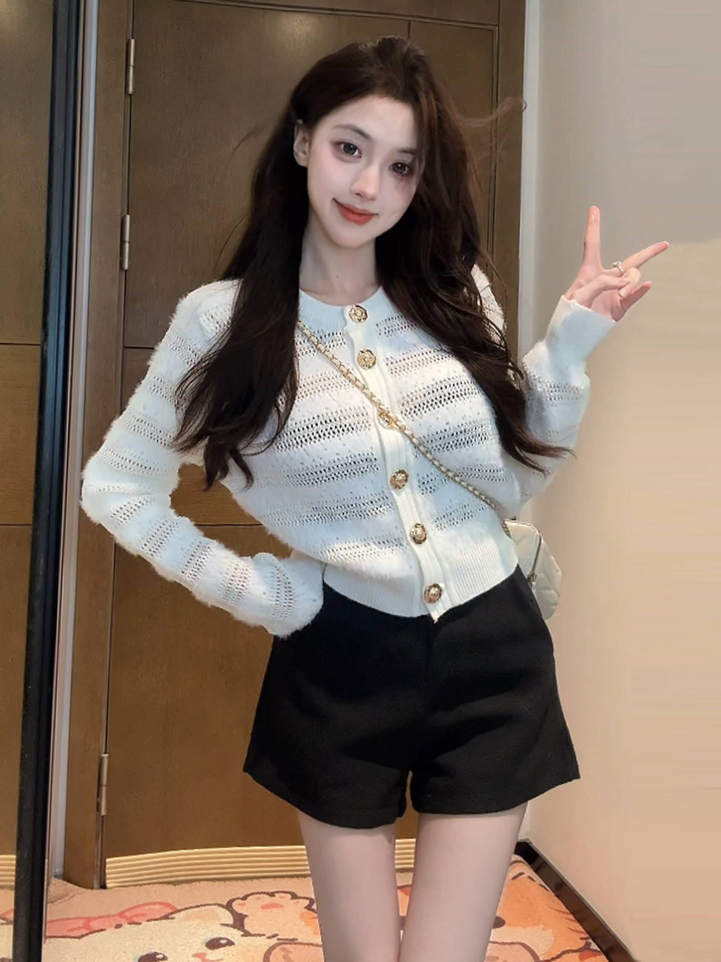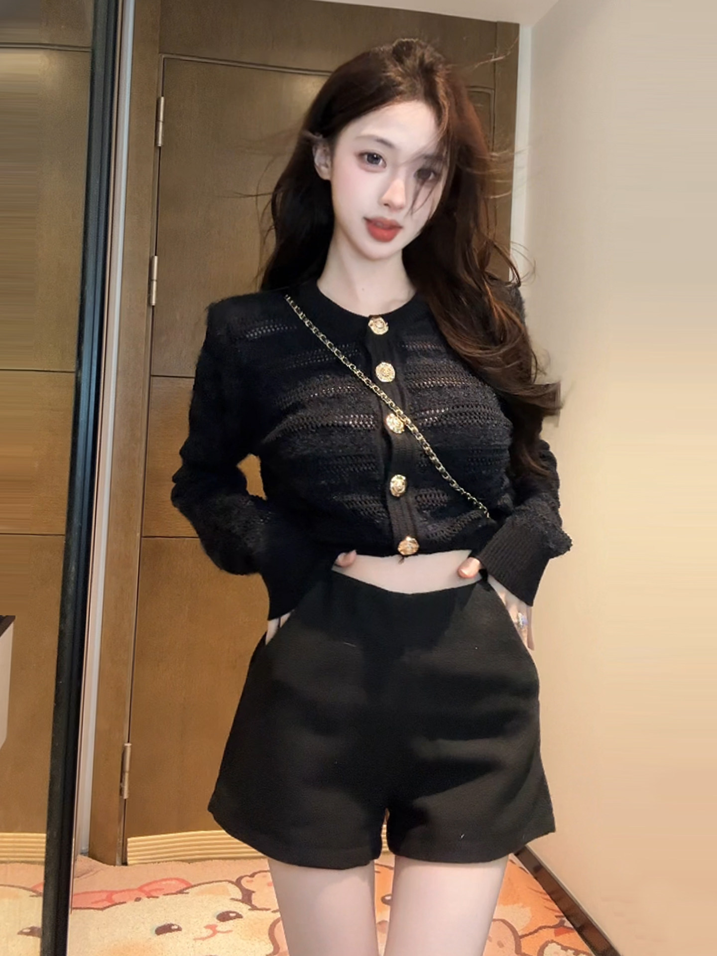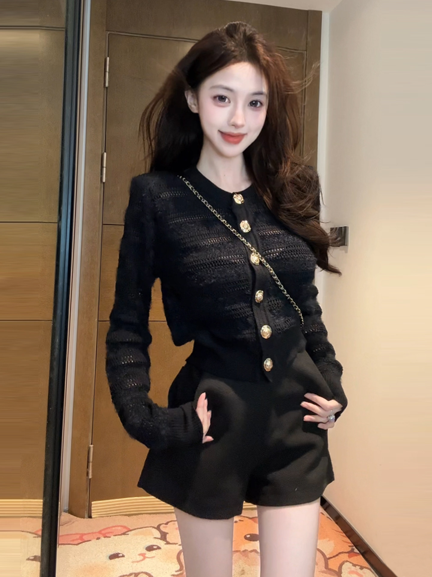 【XIAOBAWANG】黑色圓領針織開衫外套上衣女秋冬小個子收腰上衣