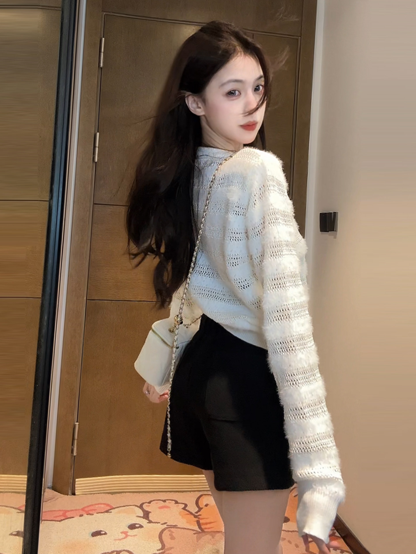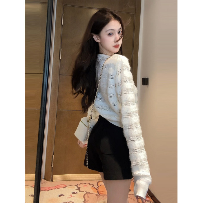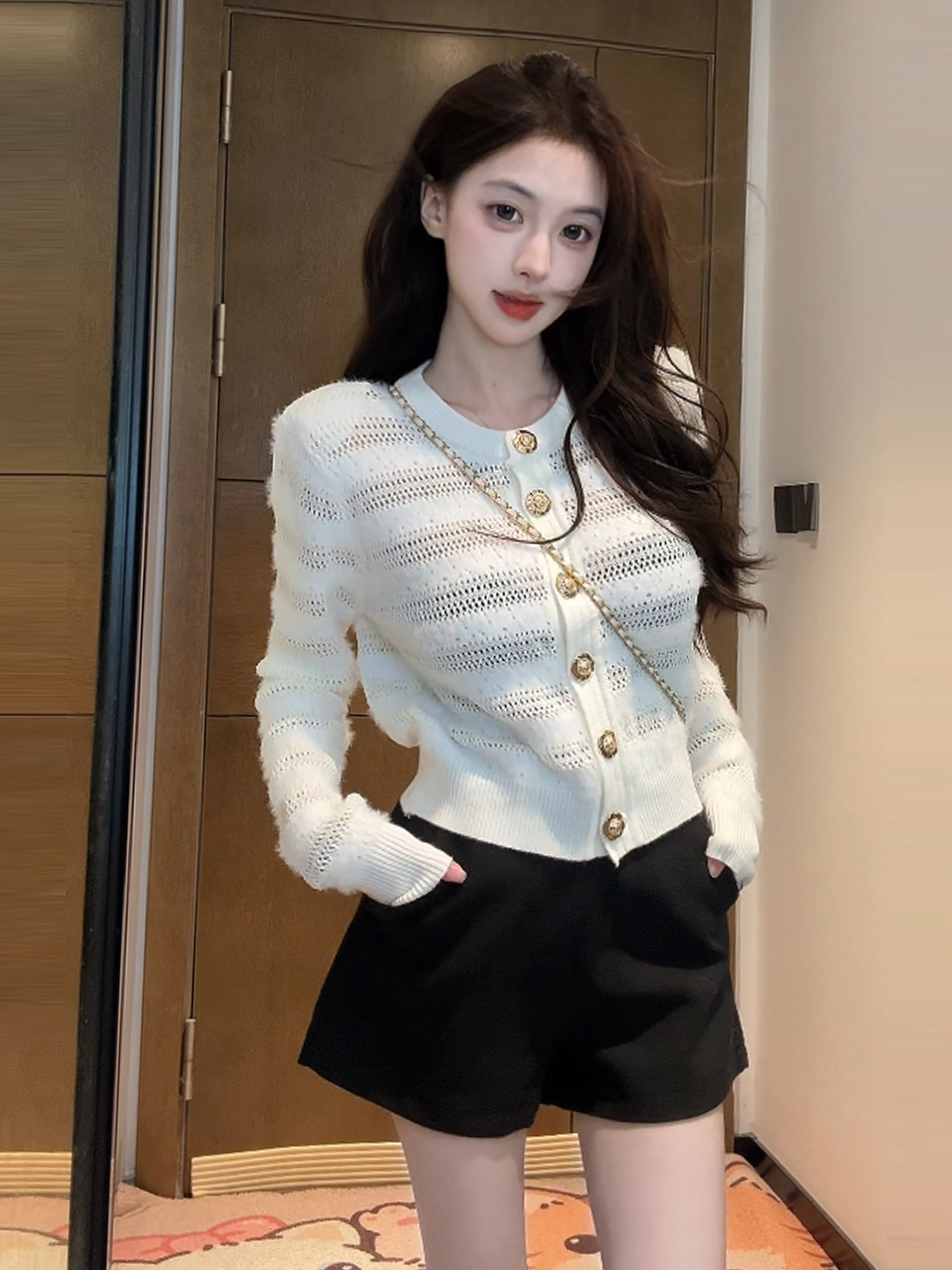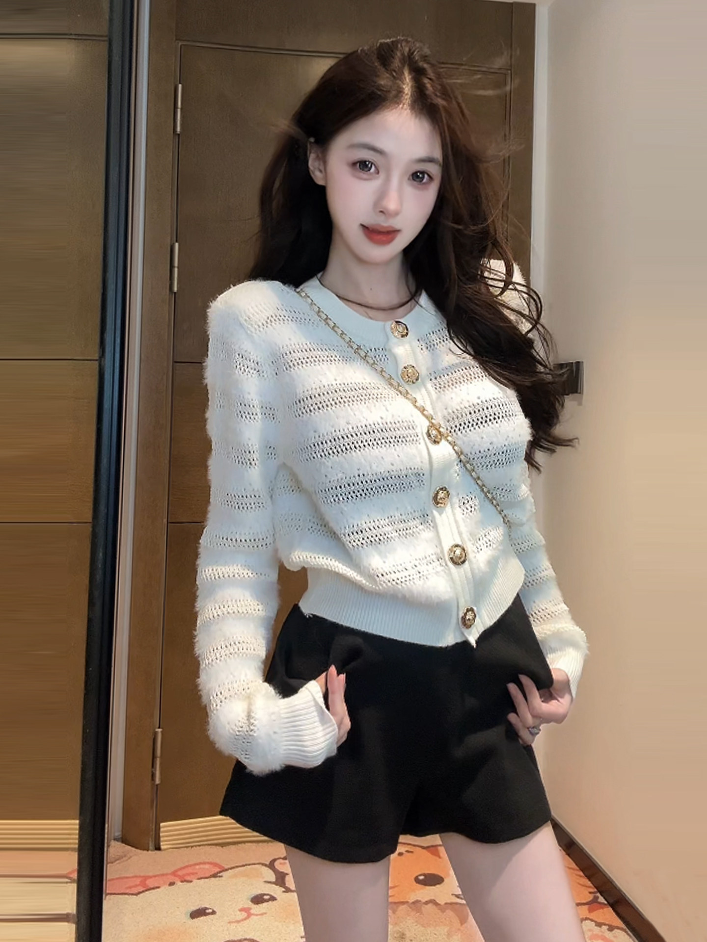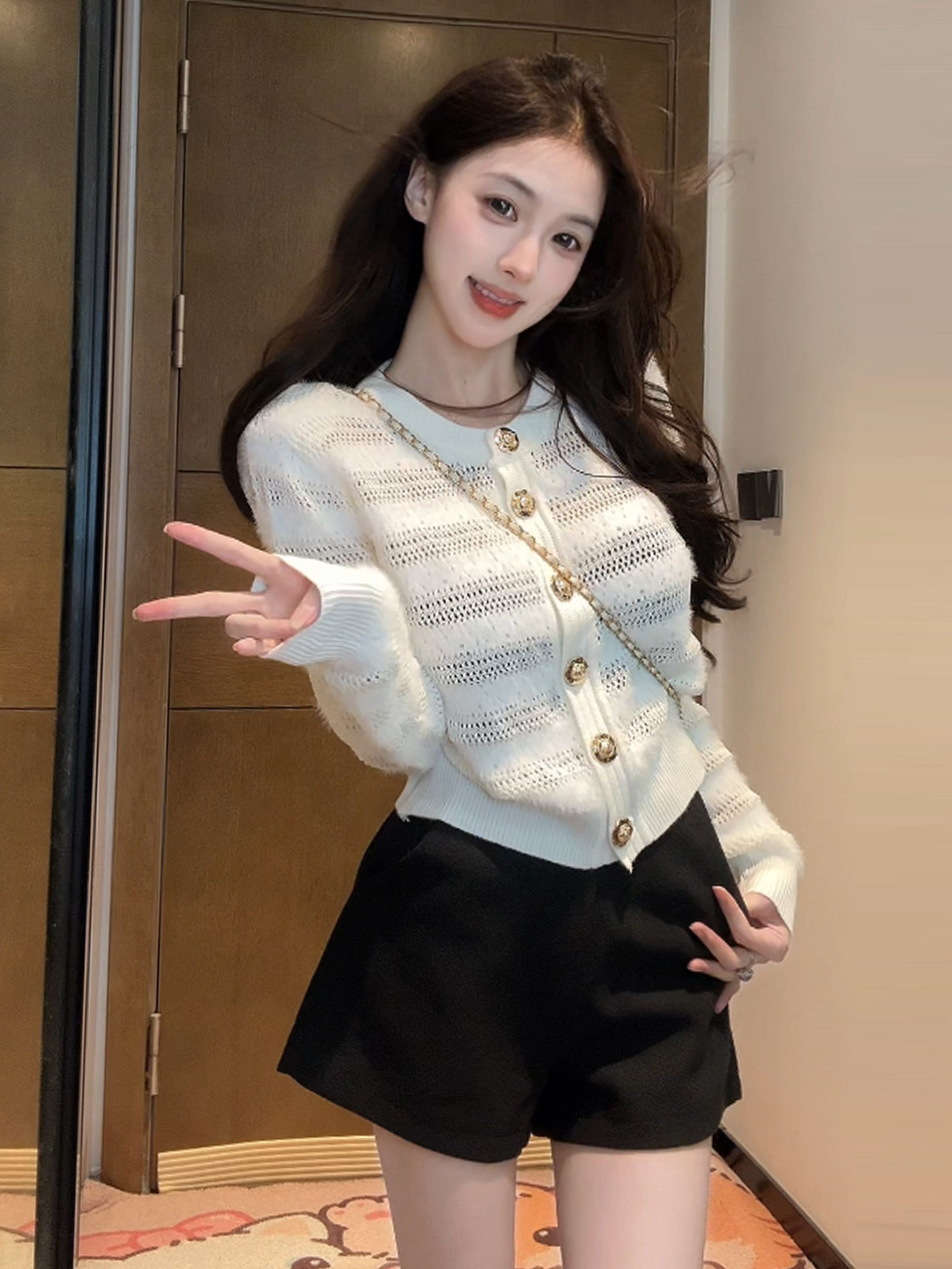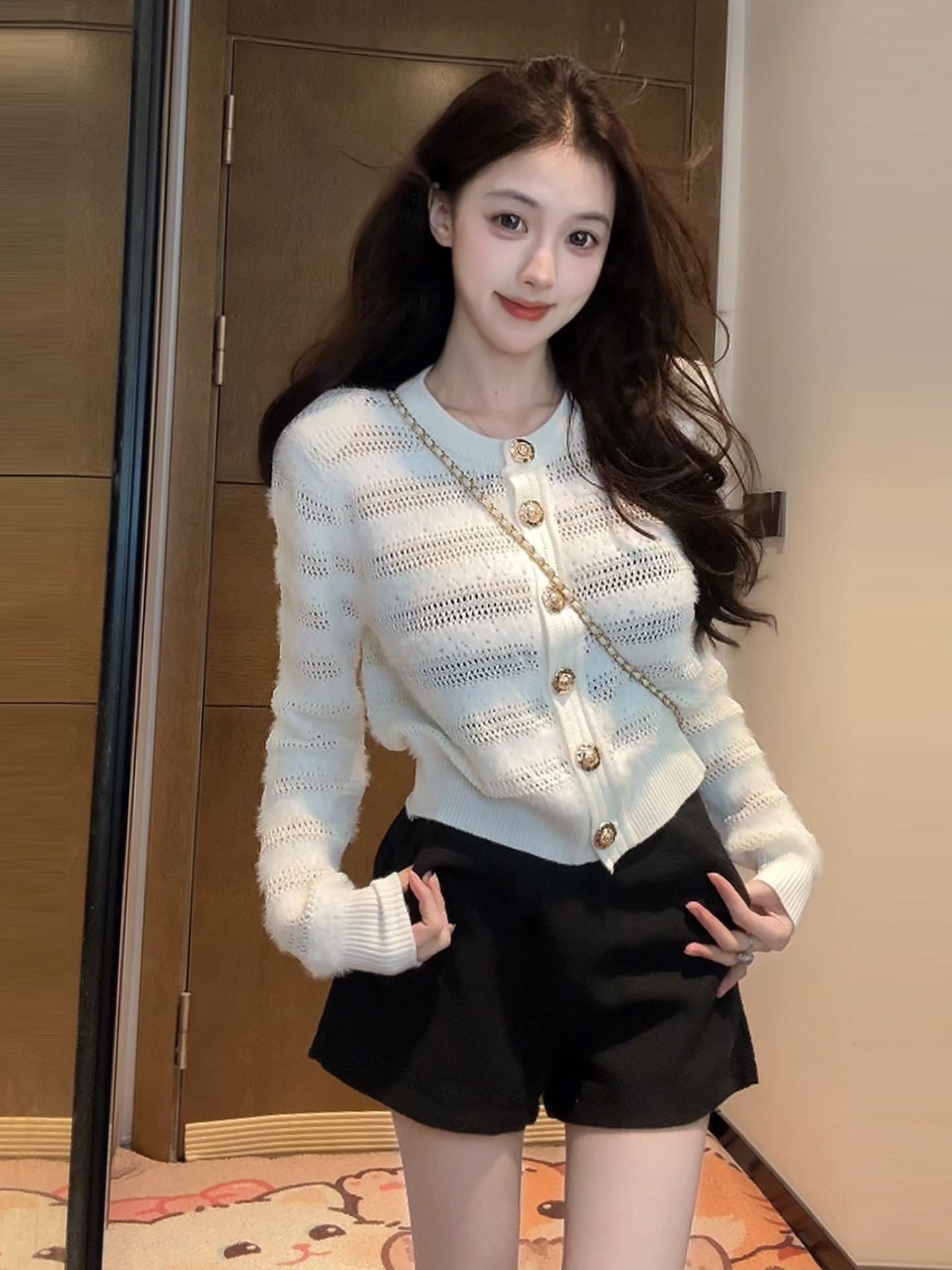 【XIAOBAWANG】黑色圓領針織開衫外套上衣女秋冬小個子收腰上衣