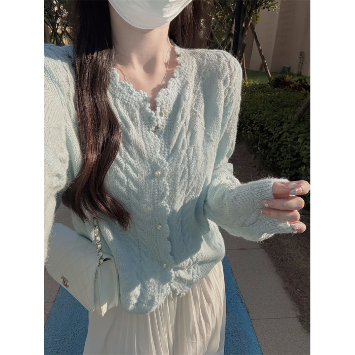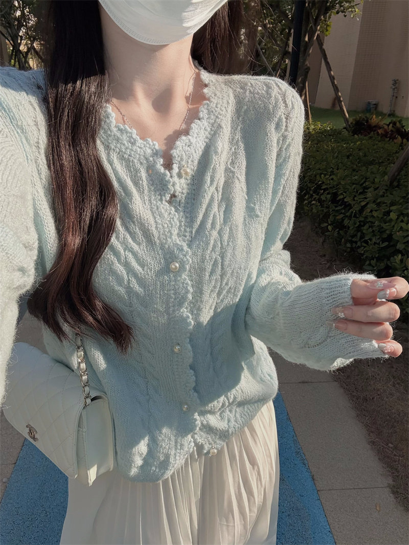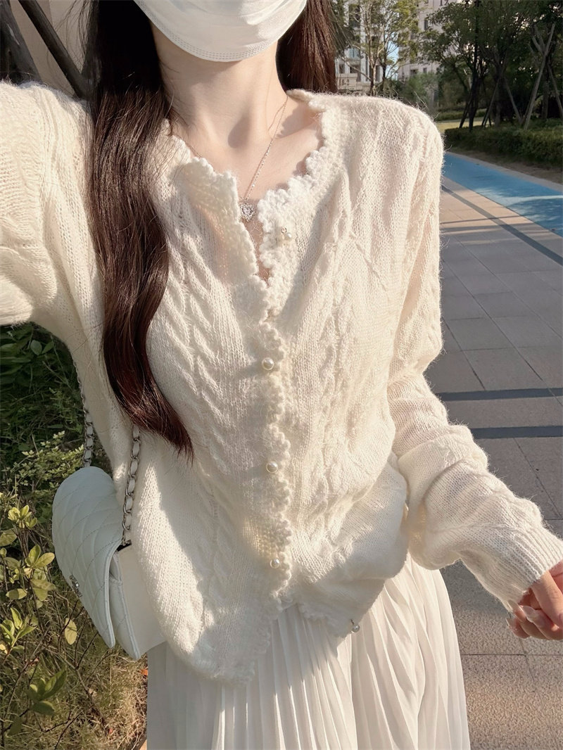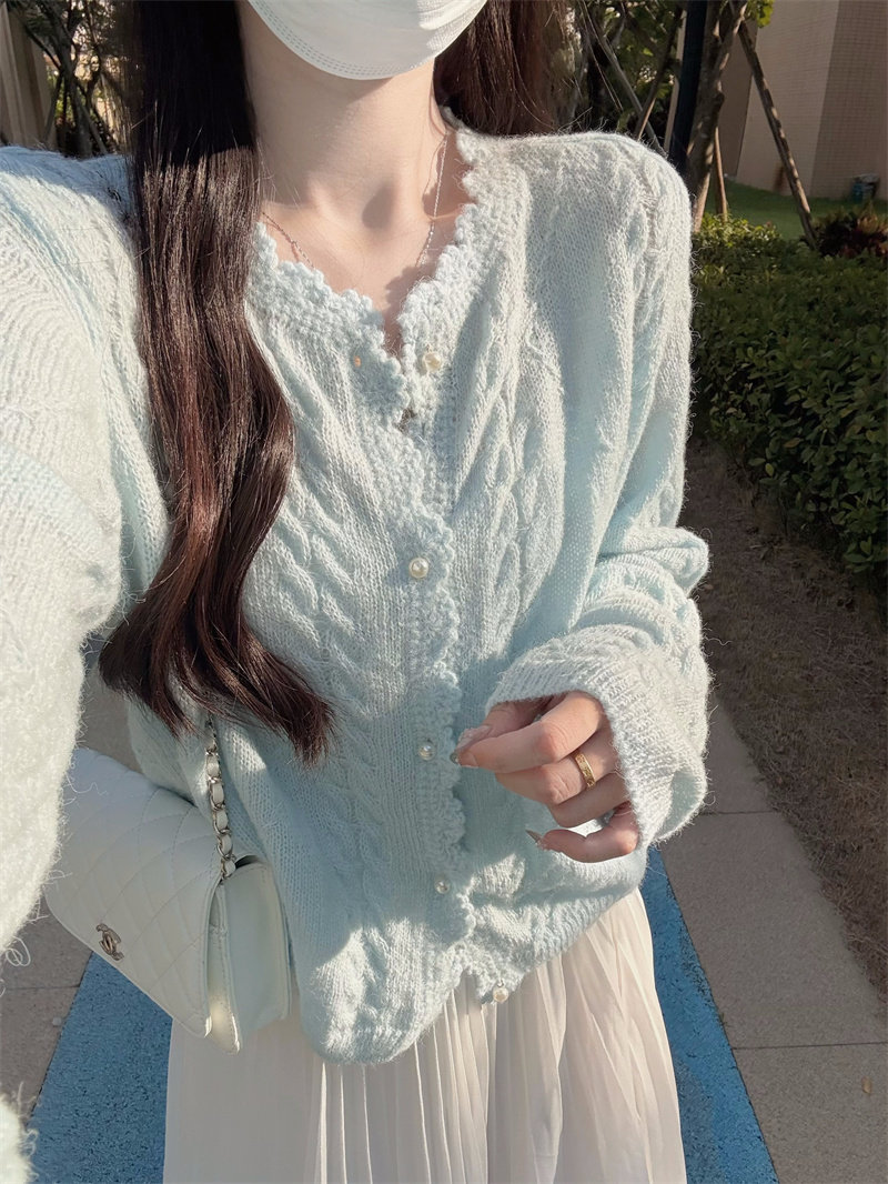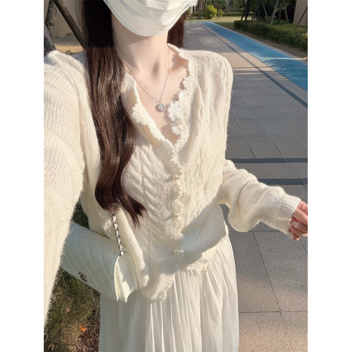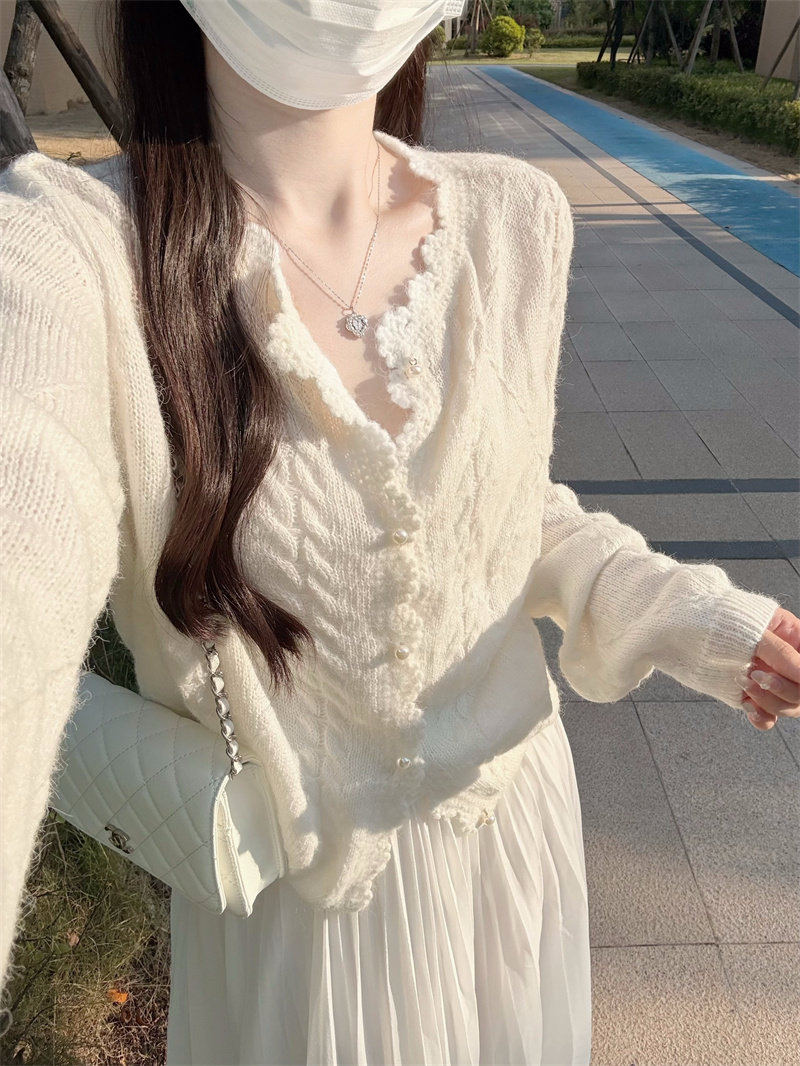 Bluee33 清純白色馬海毛麻花珍珠釦手工鉤花針織開衫圓領毛衣外套