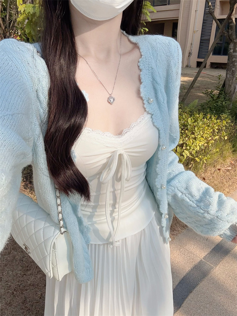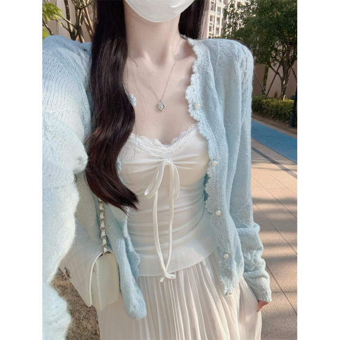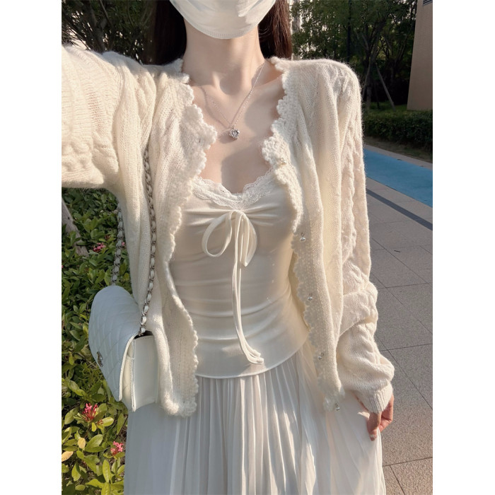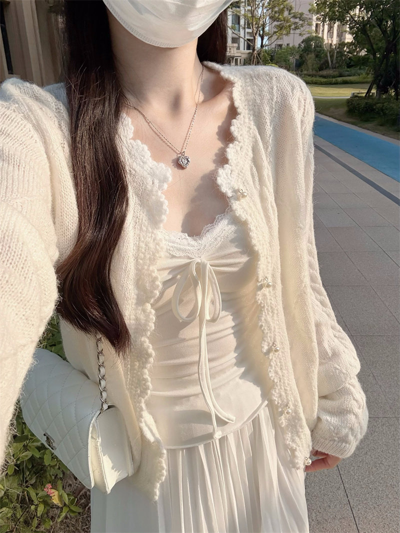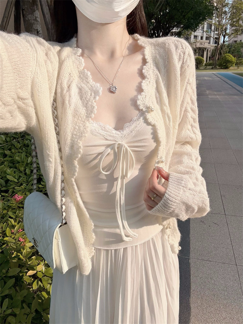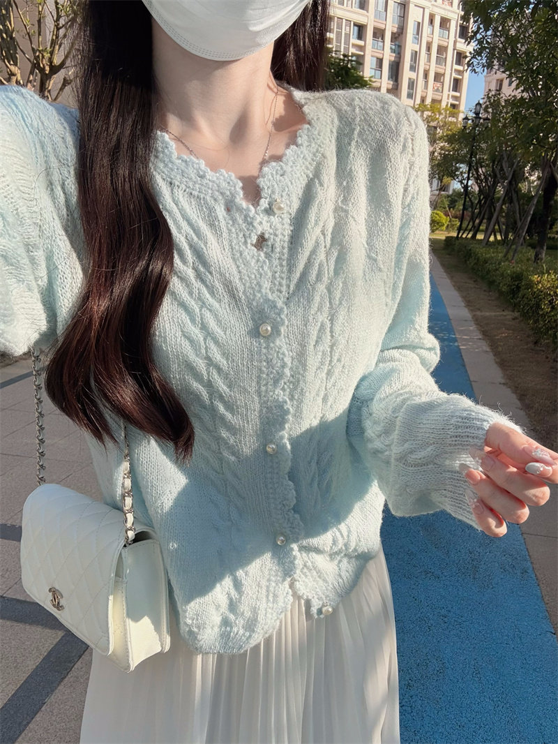 Bluee33 清純白色馬海毛麻花珍珠釦手工鉤花針織開衫圓領毛衣外套