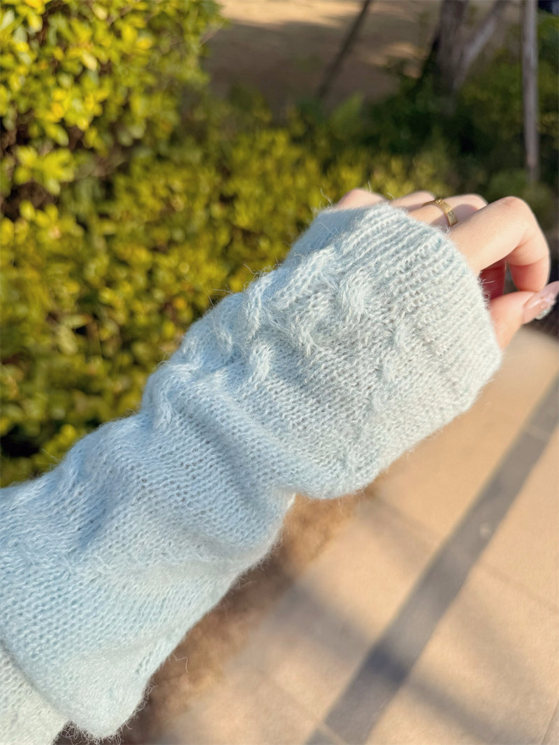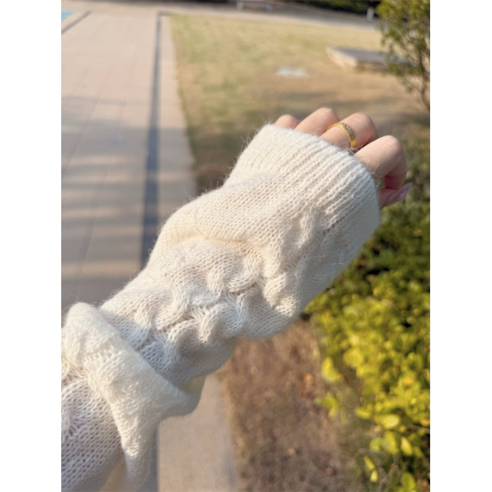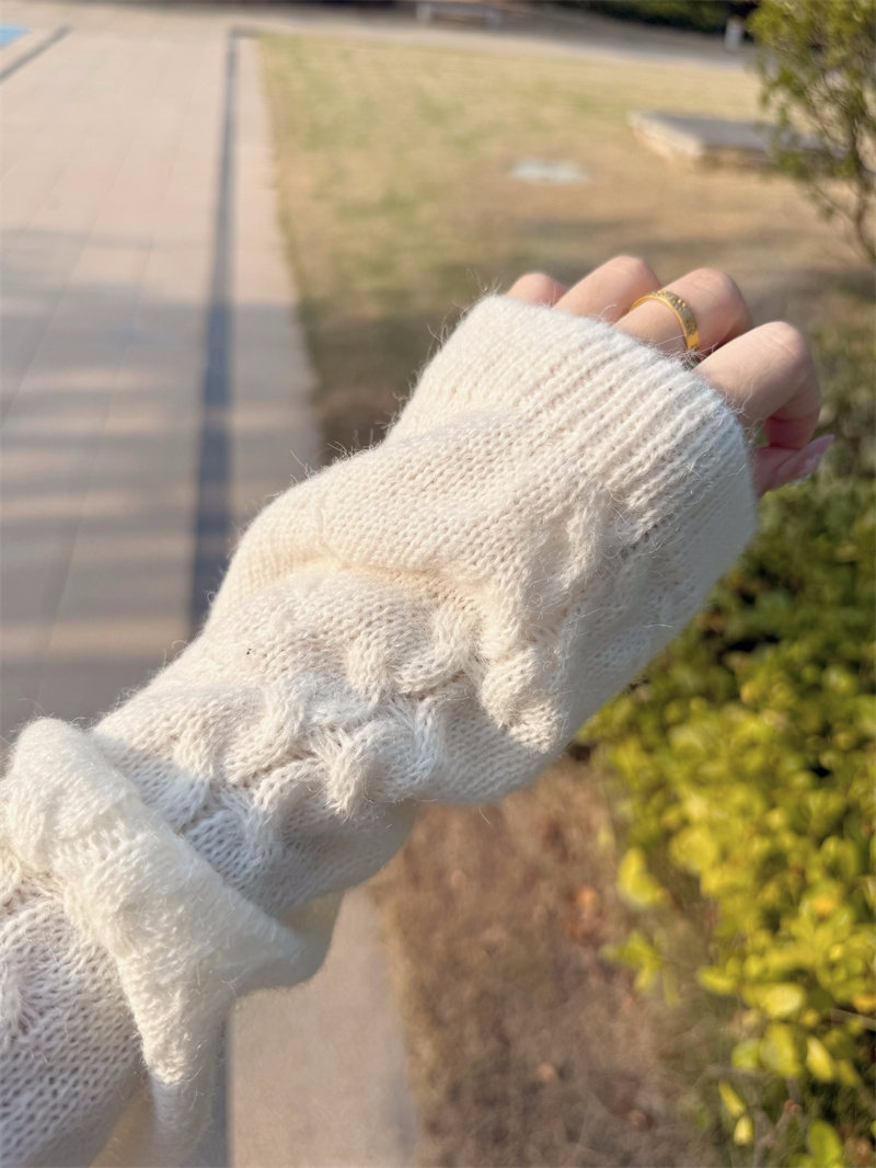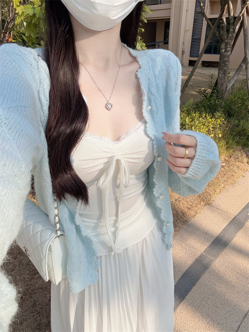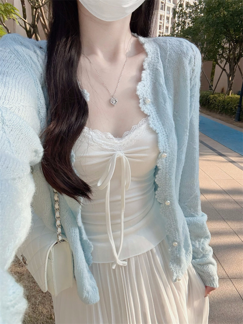 Bluee33 清純白色馬海毛麻花珍珠釦手工鉤花針織開衫圓領毛衣外套