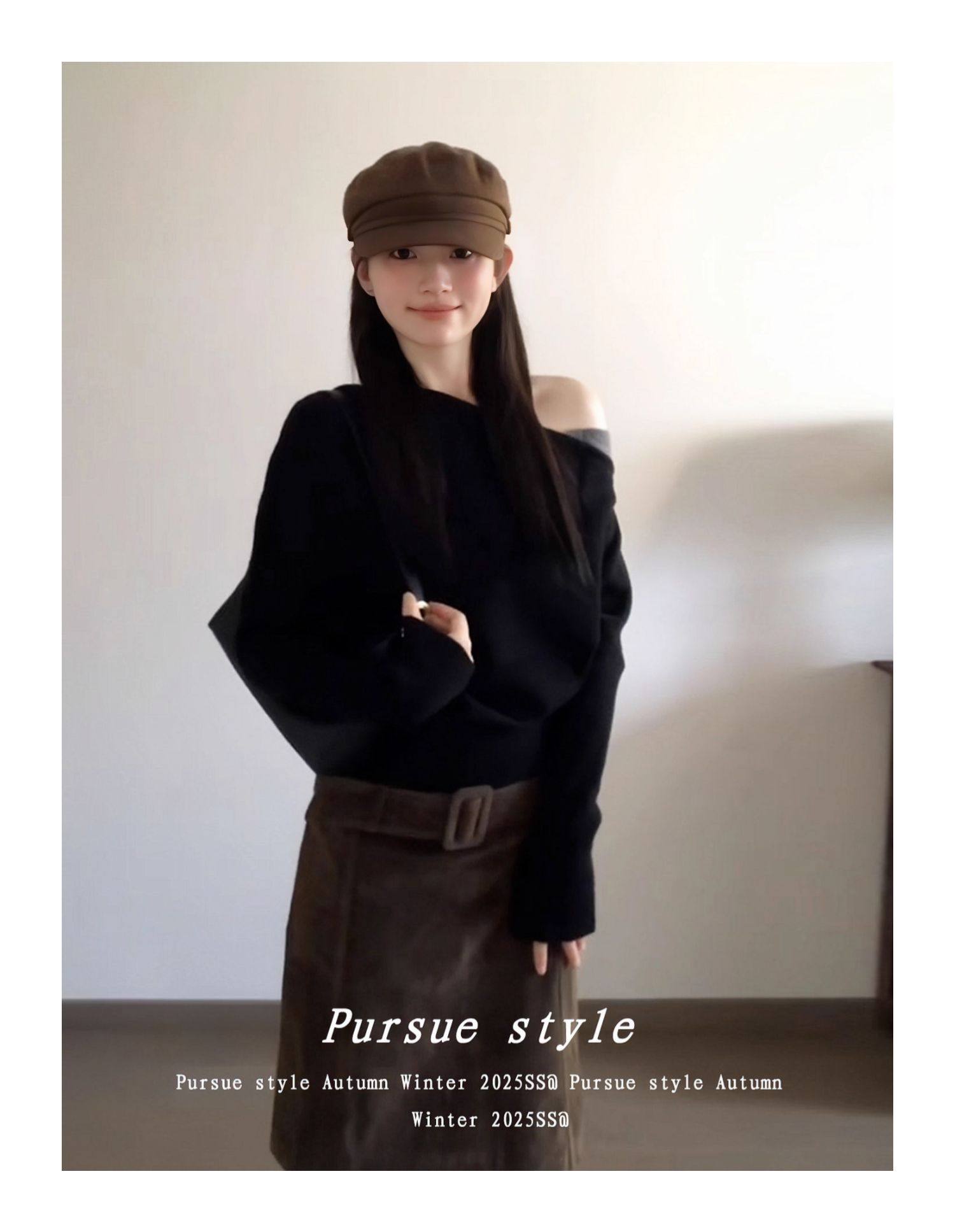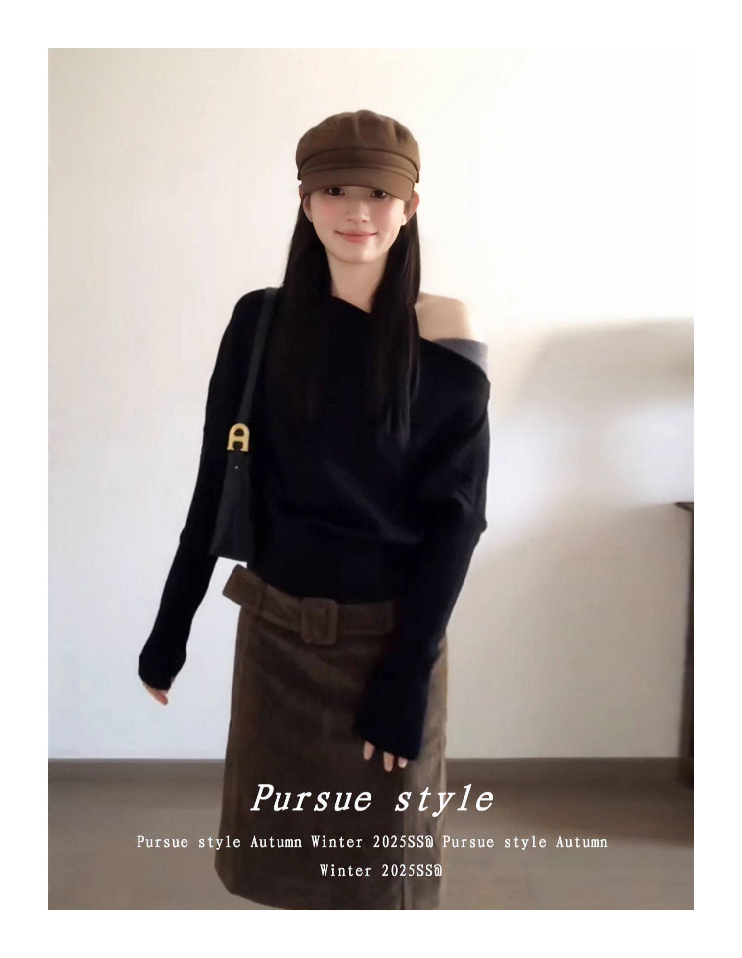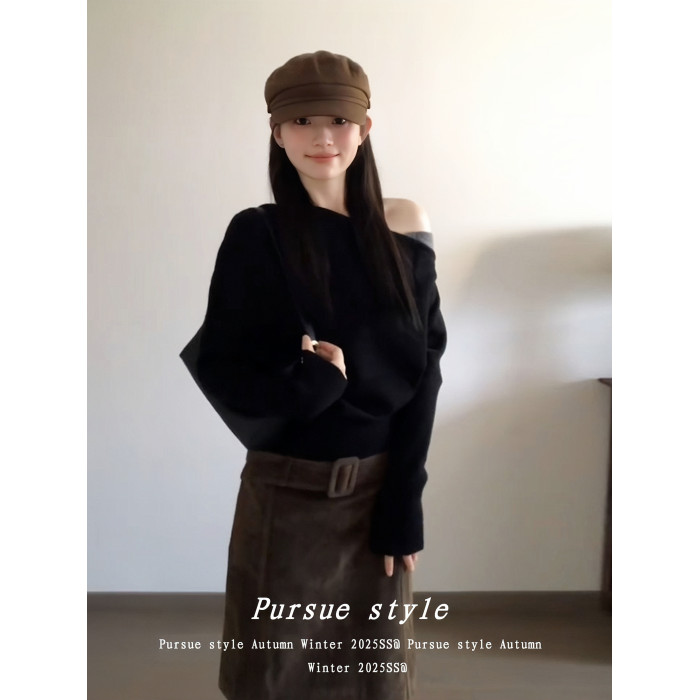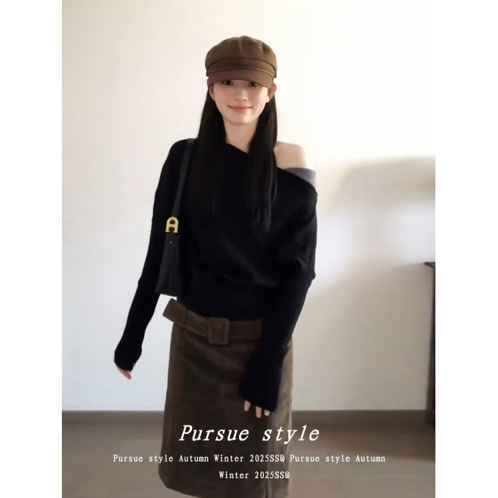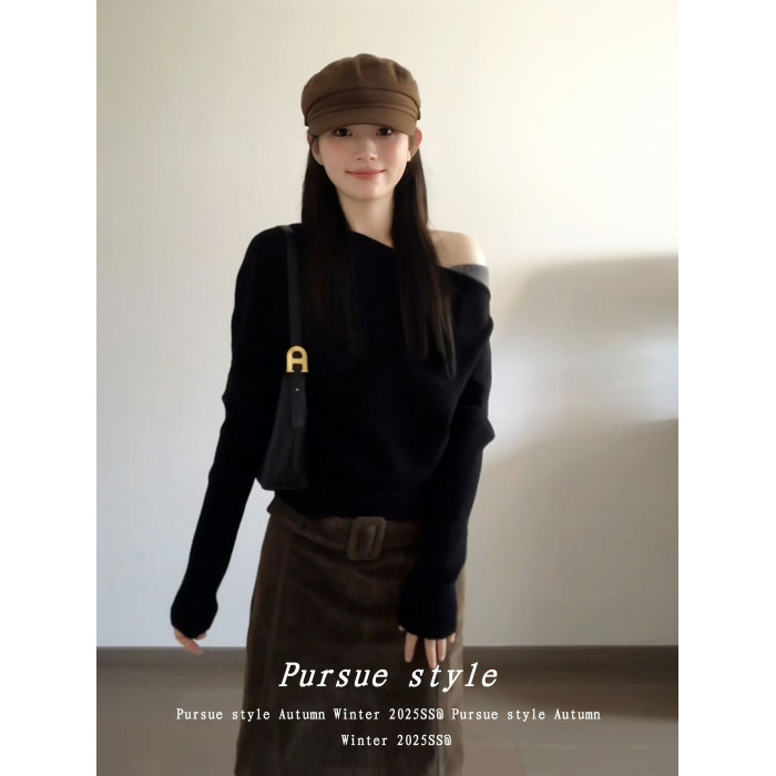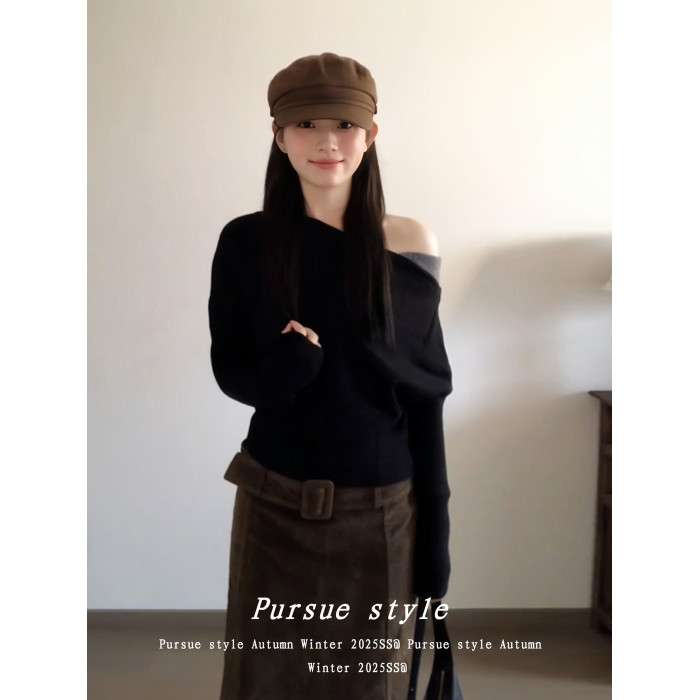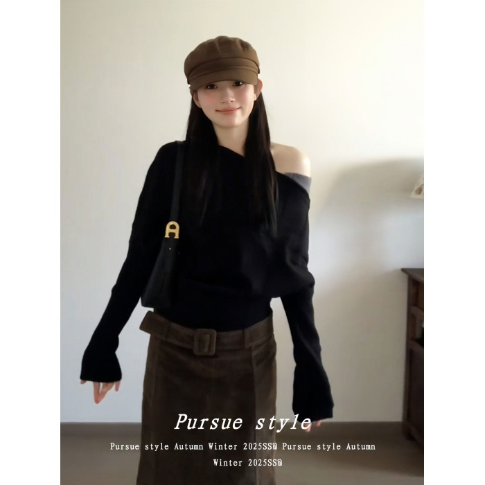 【暗夜序曲】設計感斜肩針織衫女秋季撞色拼接毛衣黑色露肩上衣潮