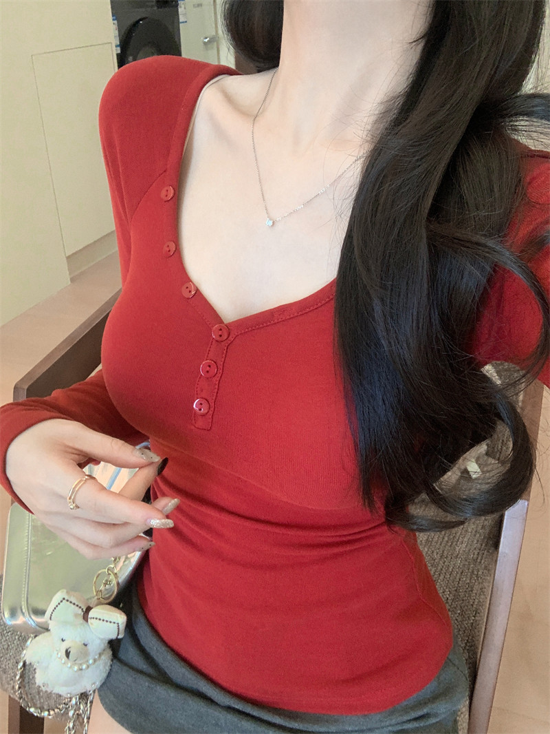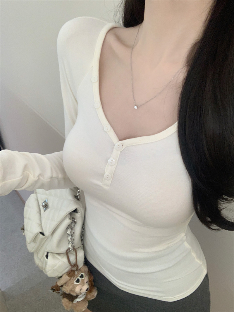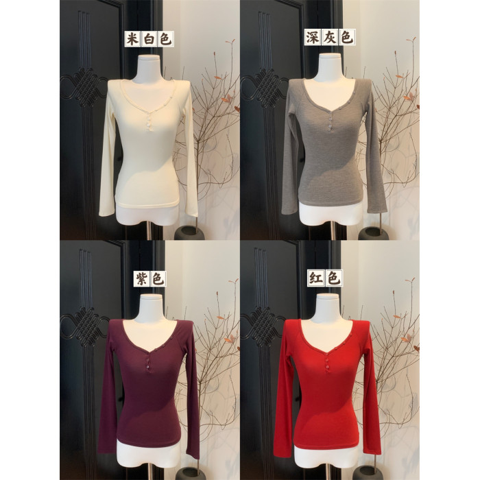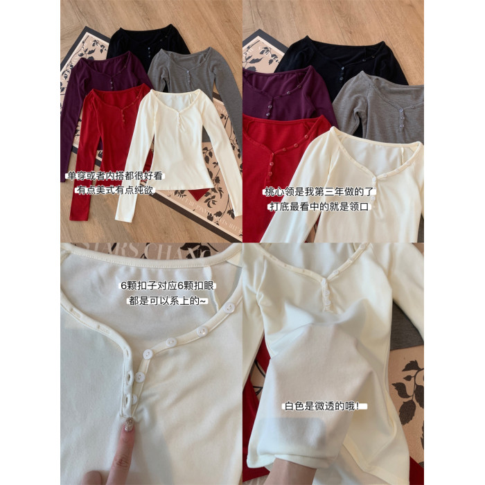 遲早 桃心領公式! 基礎款tee紐釦長袖打底內搭針織衫百搭上衣女
