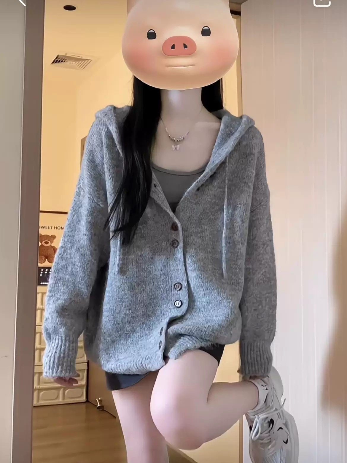 灰色連帽毛衣開衫外套女秋季韓系穿搭寬松軟糯慵懶風針織衫上衣冬
