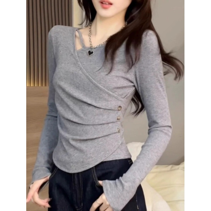 2025秋季新款時尚裝飾釦子純色收腰修身顯瘦洋氣長袖打底衫上衣