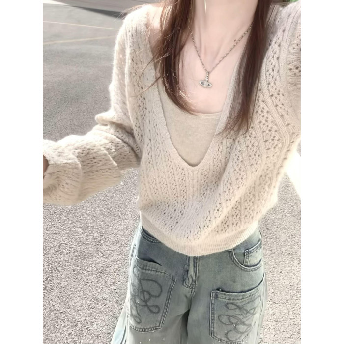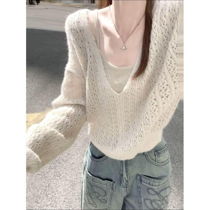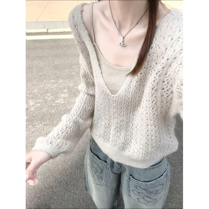 韓系早秋季穿搭v領針織衫上衣女2025新款鏤空針織罩衫吊帶兩件套