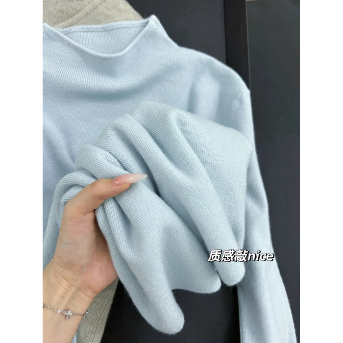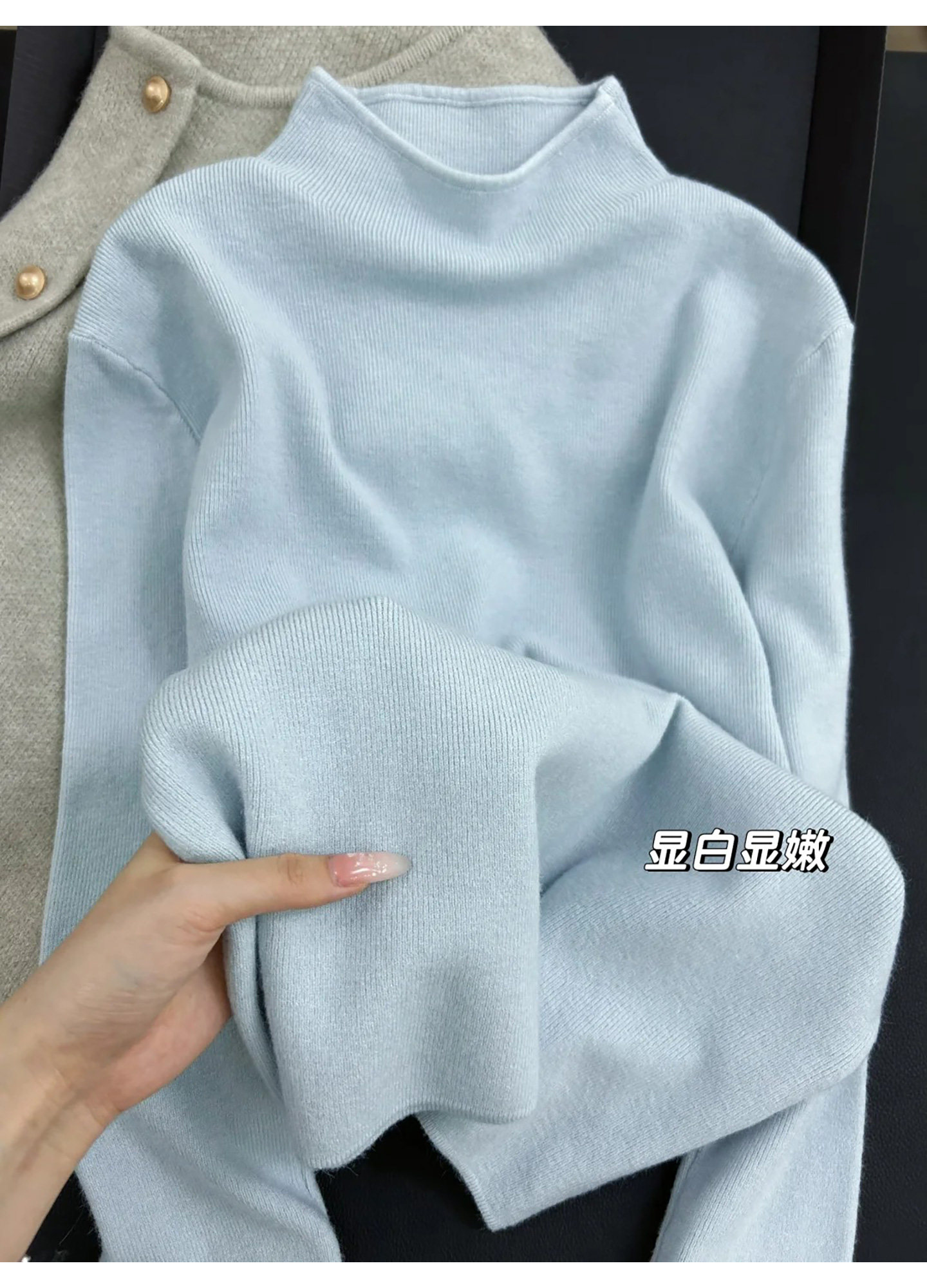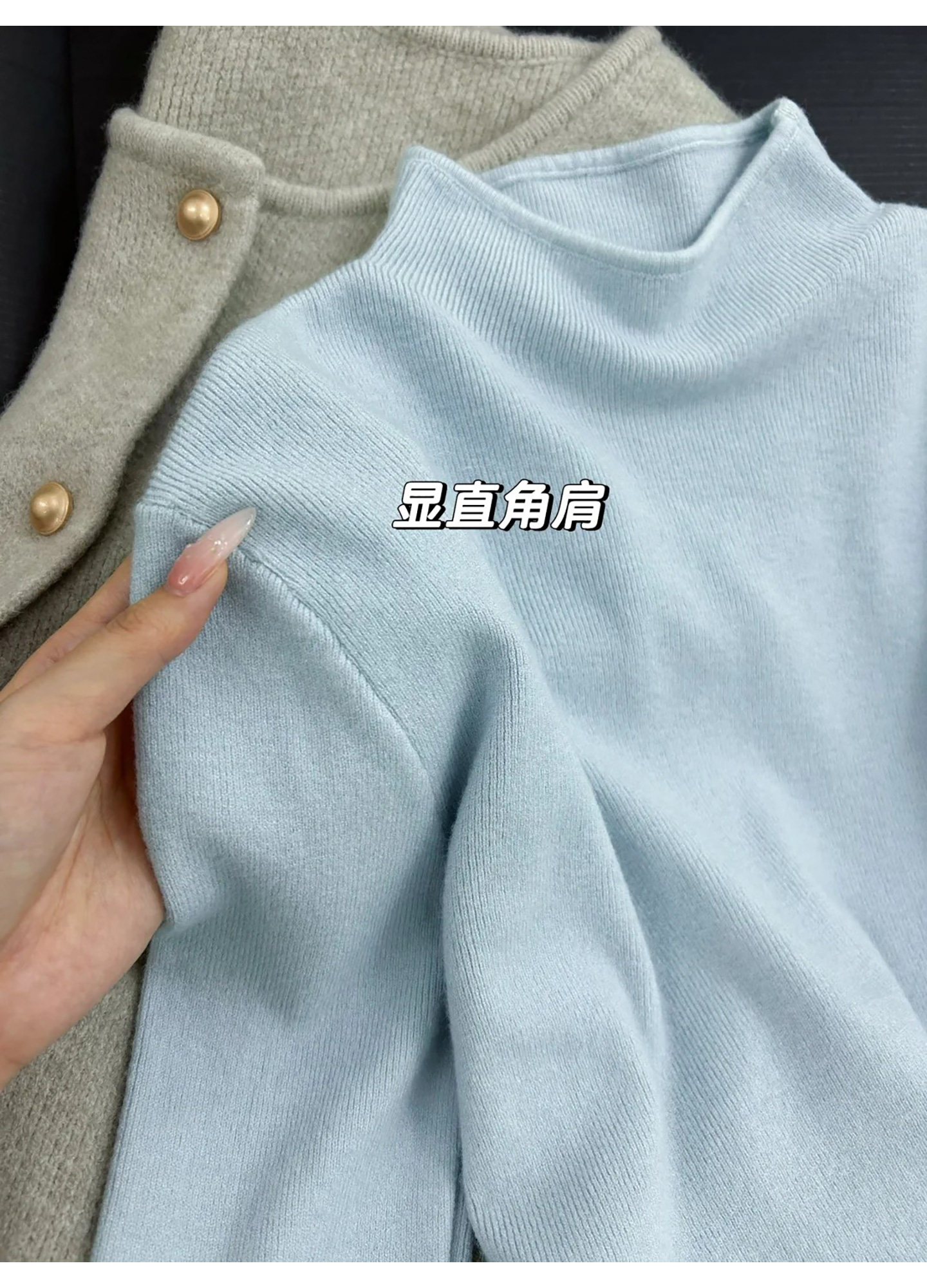 海鹽藍軟糯chic半高領毛針織衫女春季秋冬曡穿小立領內搭打底上衣