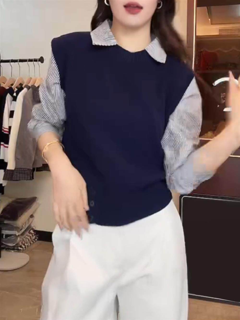 高級感假兩件條紋襯衫拼接毛衣女裝秋冬季2025新款上衣針織打底衫