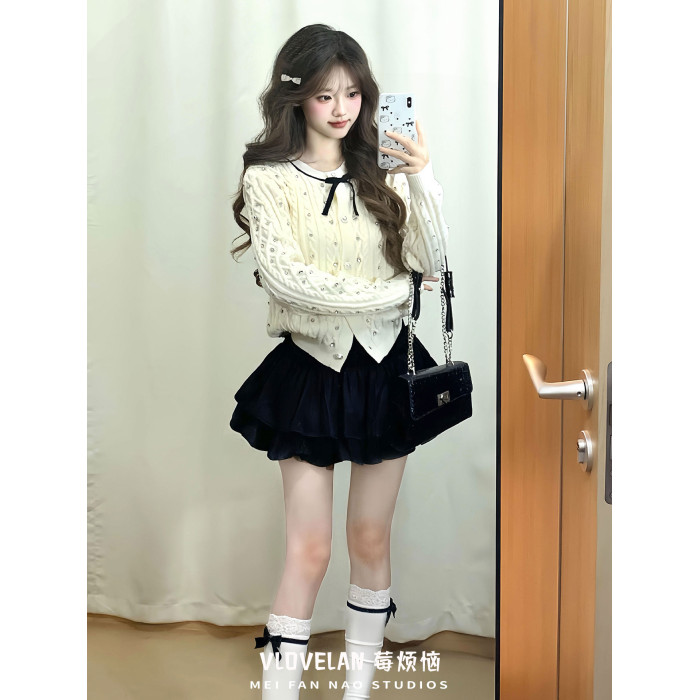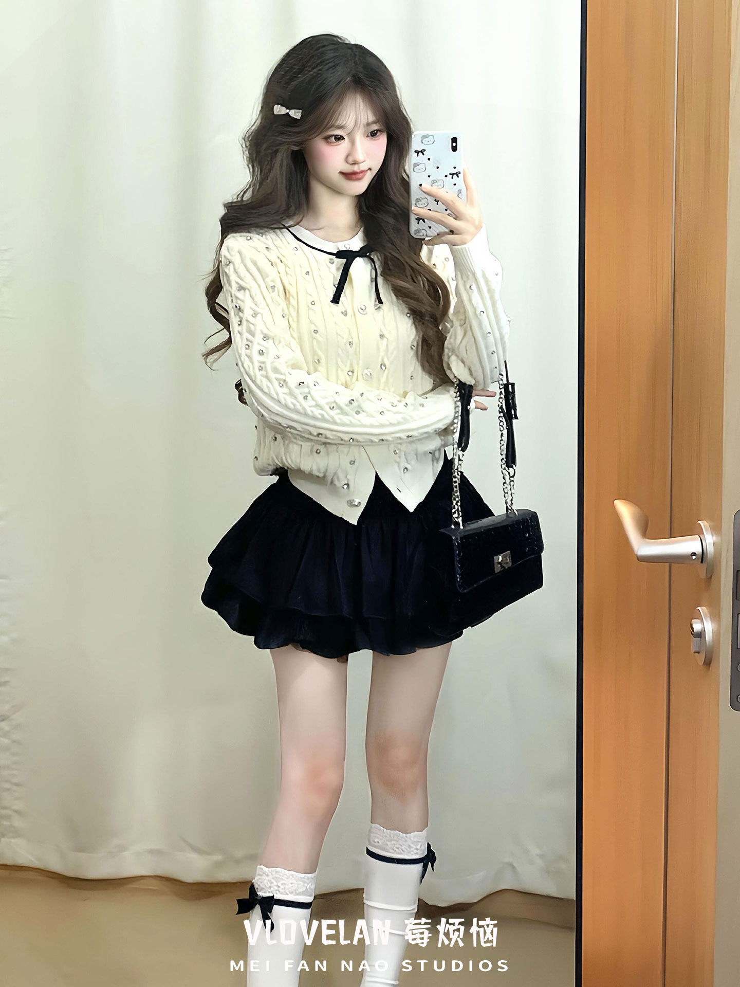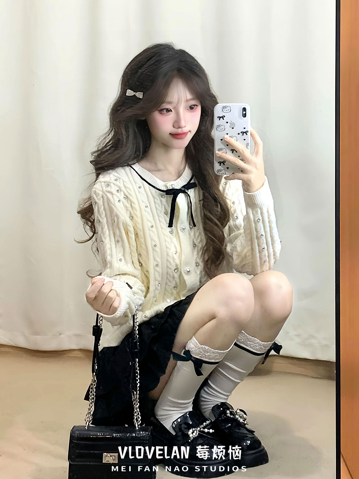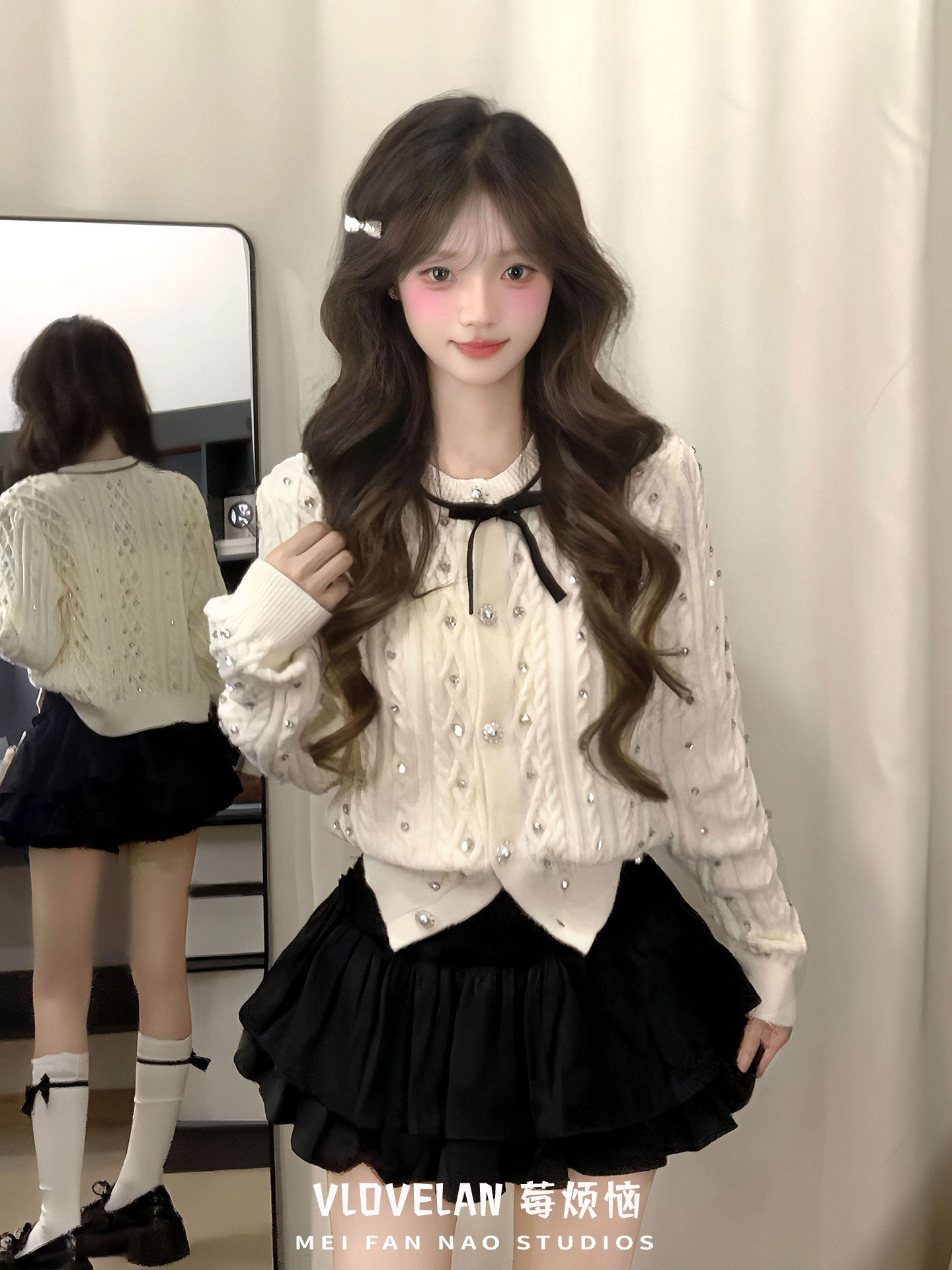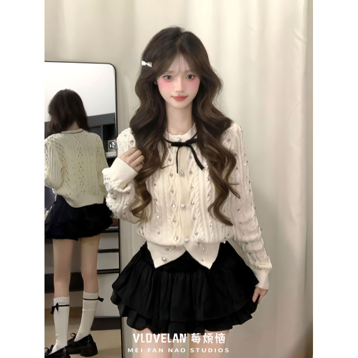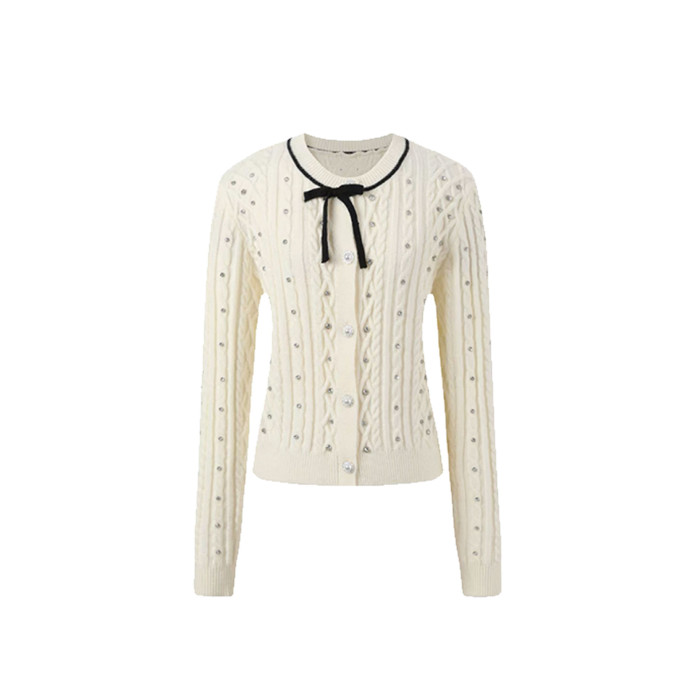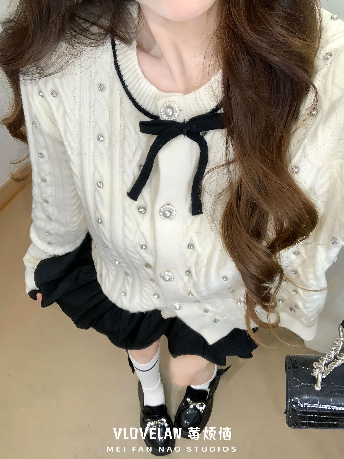 小香風白色蝴蝶結針織衫女秋冬新款燙鑽軟糯小個子麻花毛衣外套女