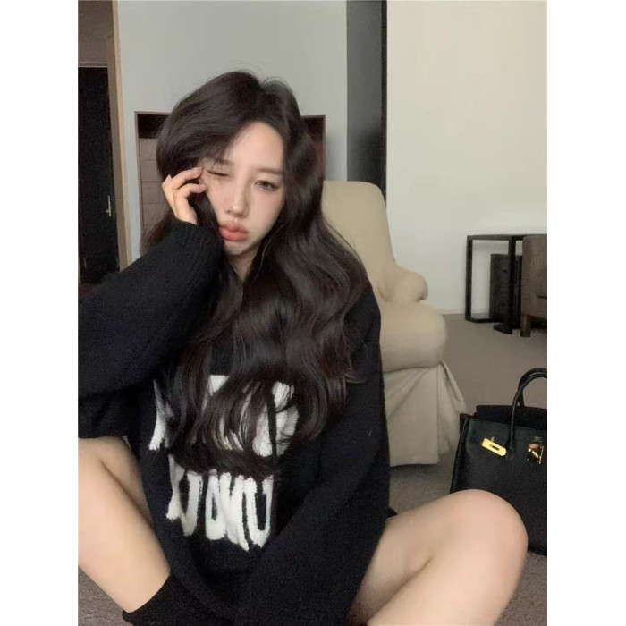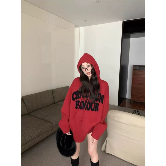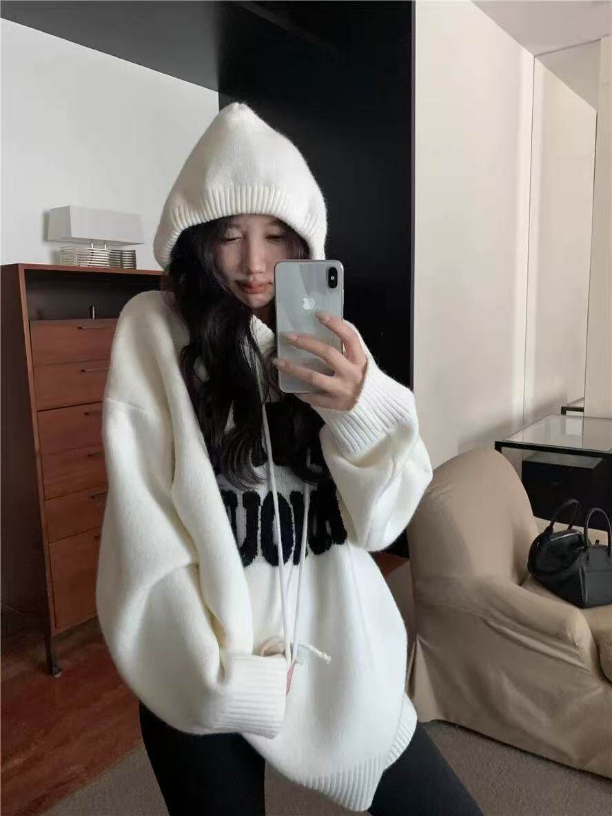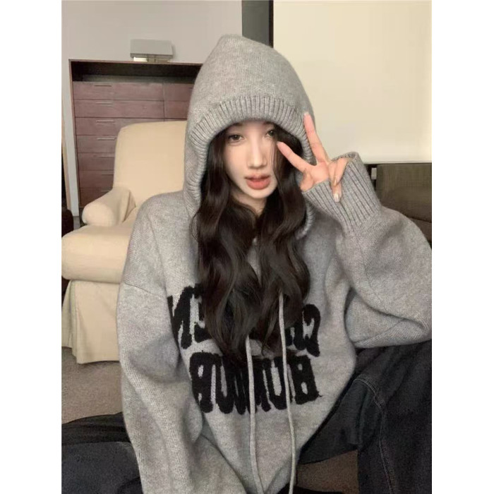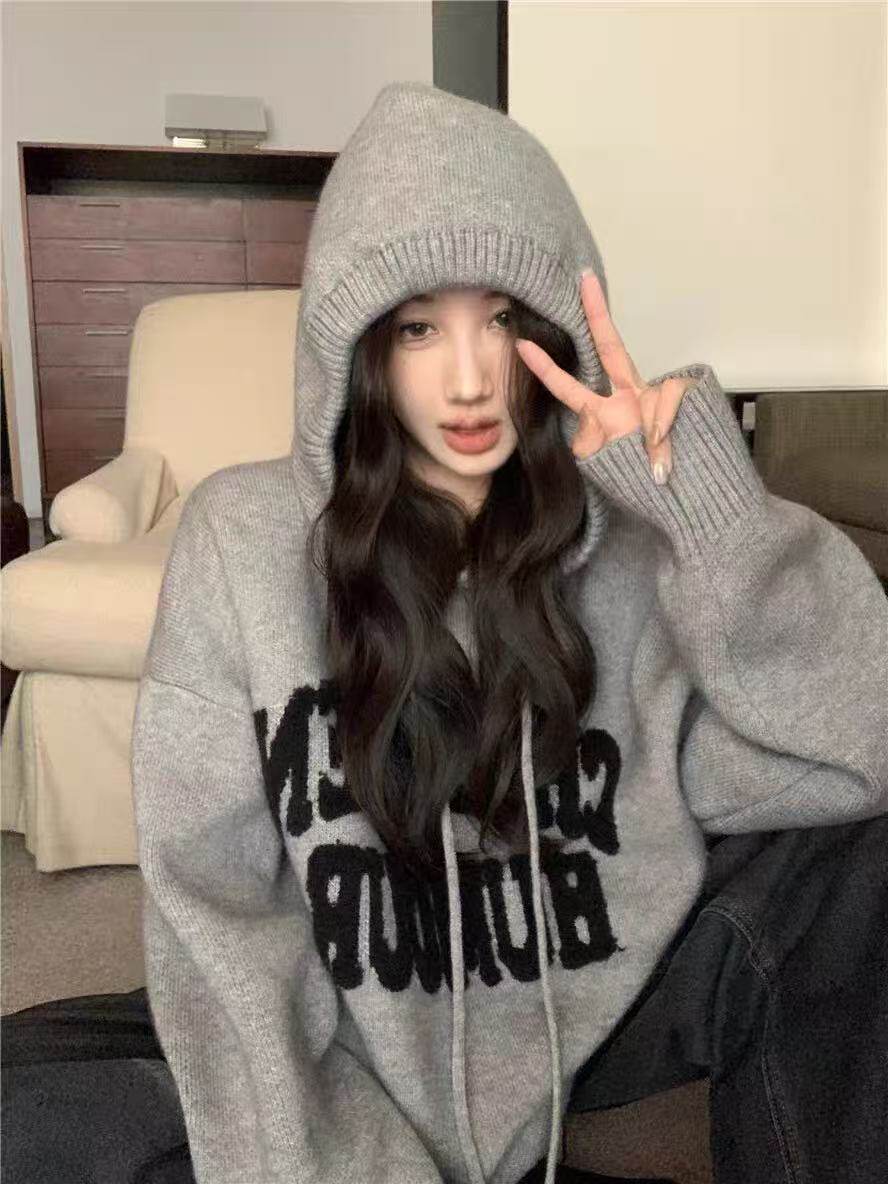 重磅加厚款連帽毛衣外套女春秋寬松慵懶風字母刺綉衛衣灰色針織衫