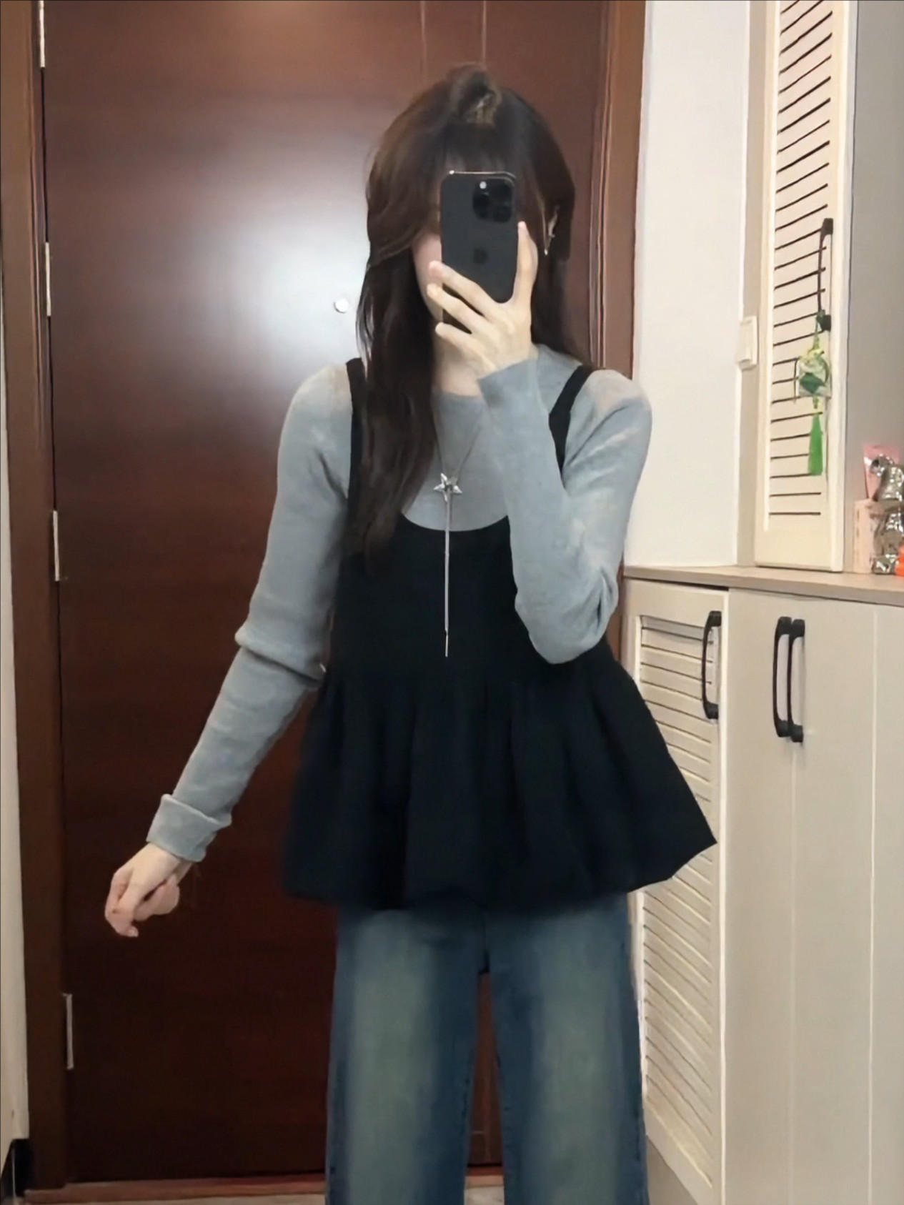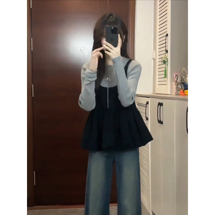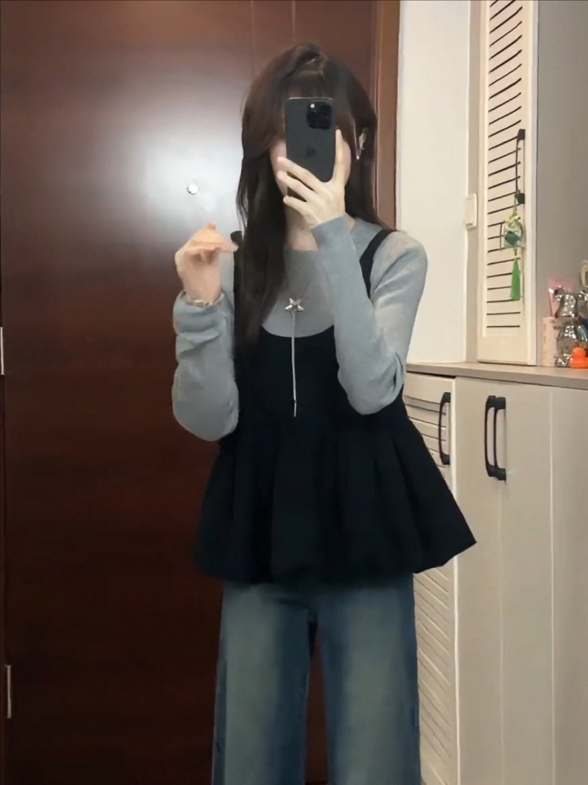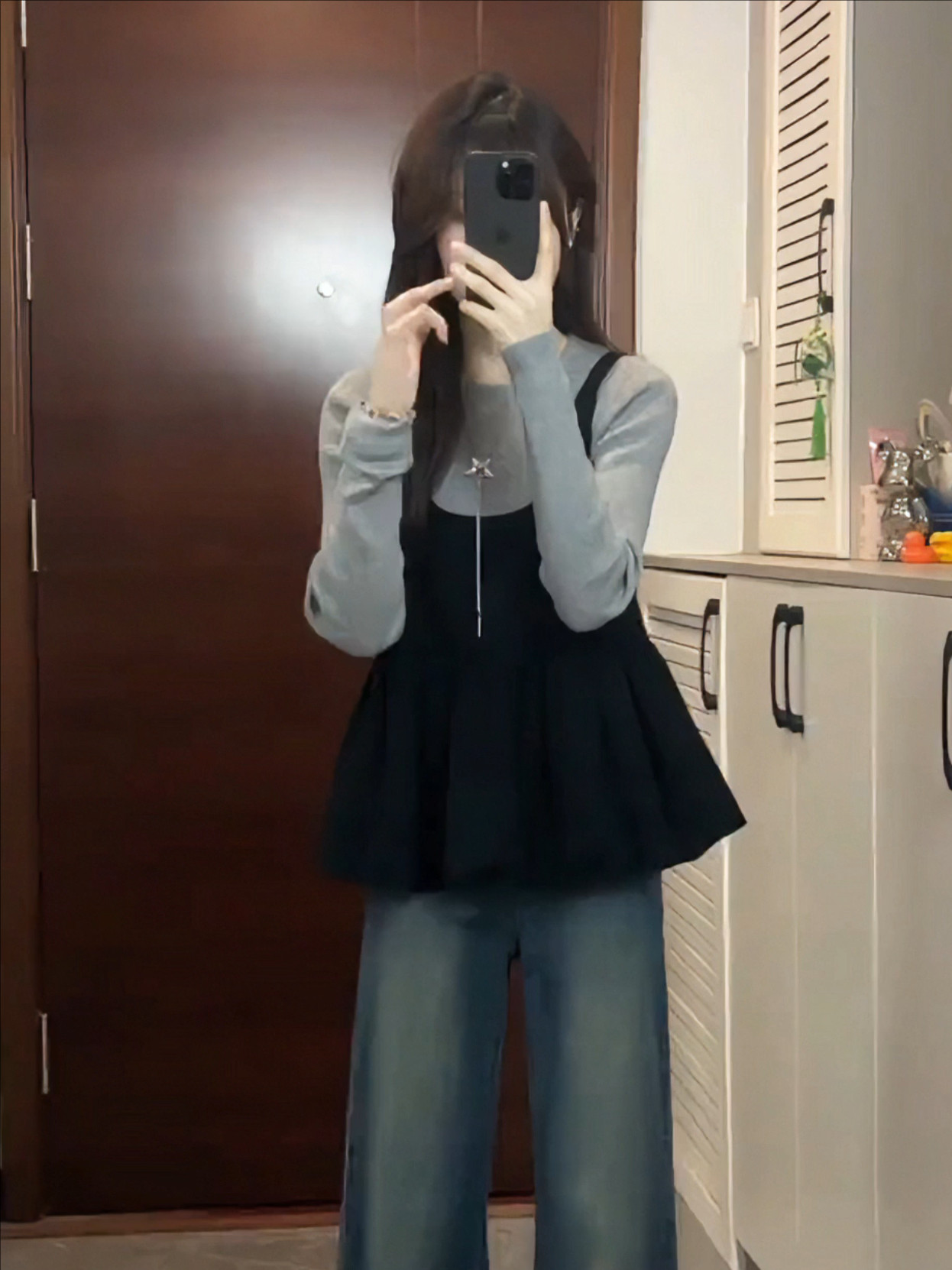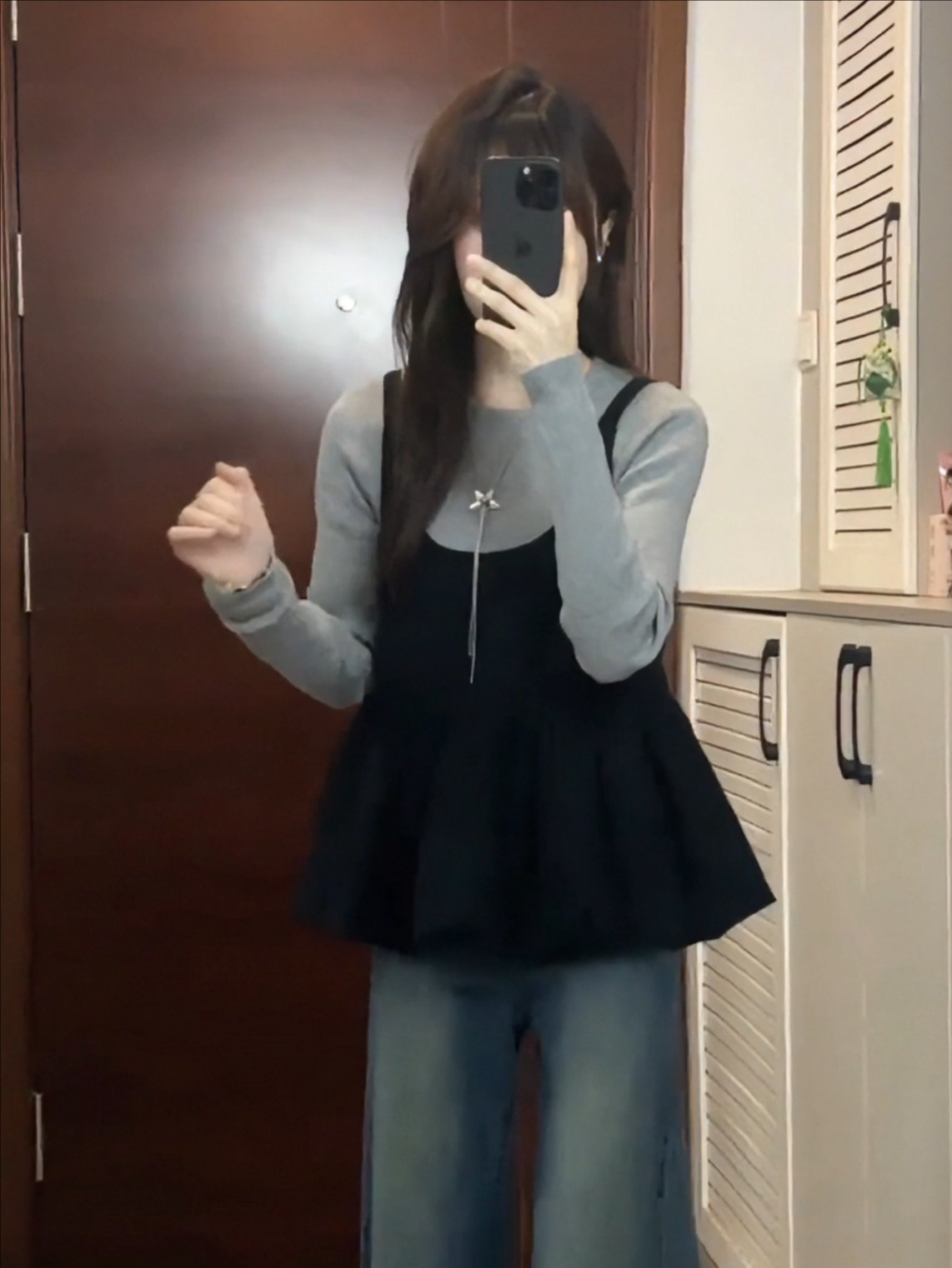大碼胖mm高級感穿搭巨好看針織衫女裝秋冬韓系吊帶曡穿兩件套上衣