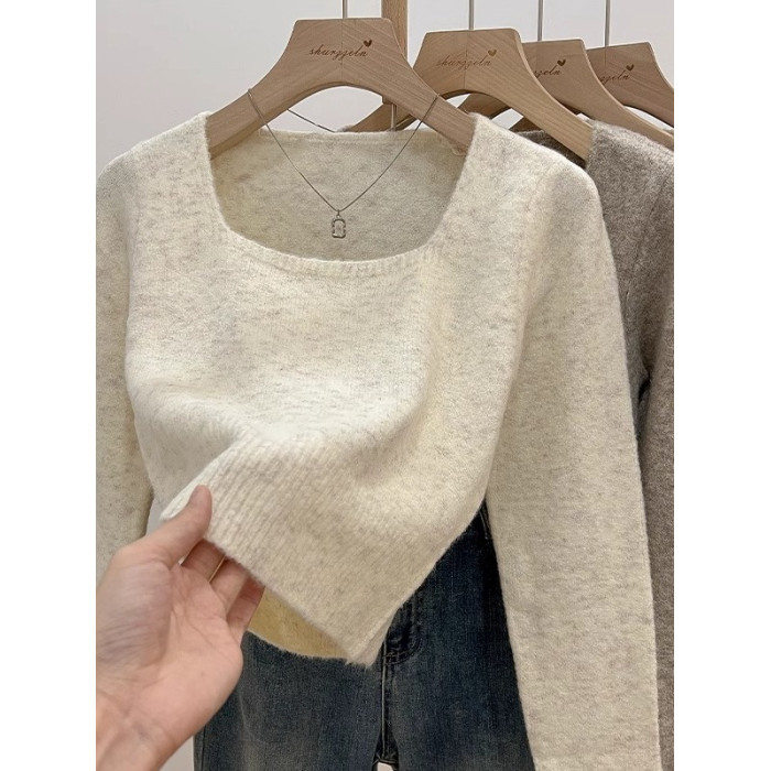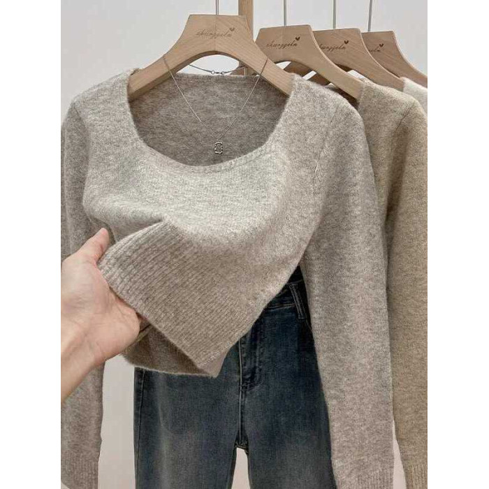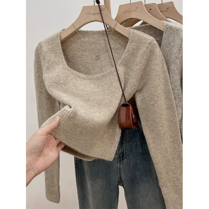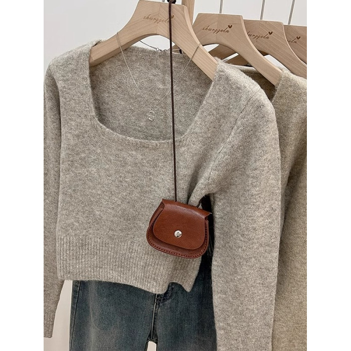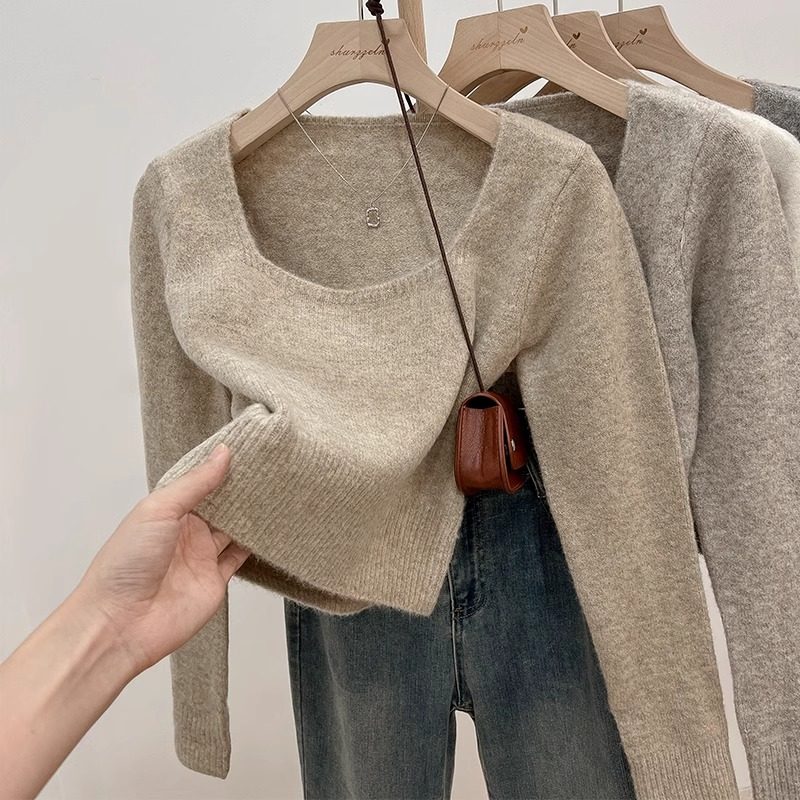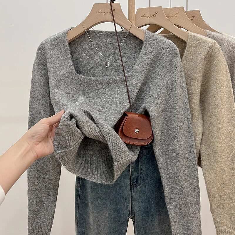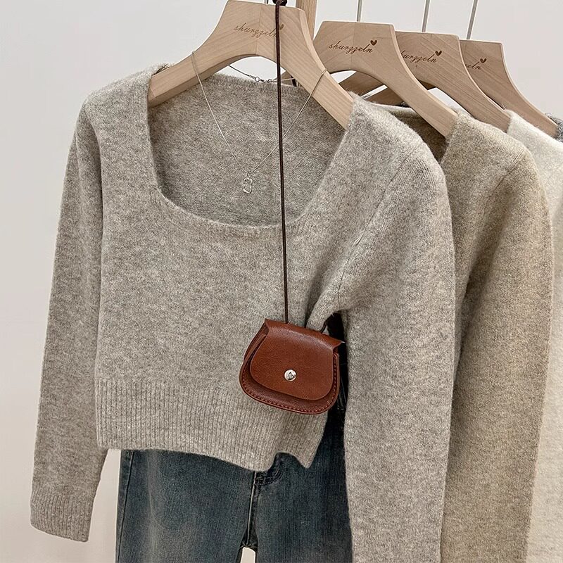 韓系方領穿搭短款軟糯針織衫女上衣秋冬新款長袖毛衣內搭打底上衣