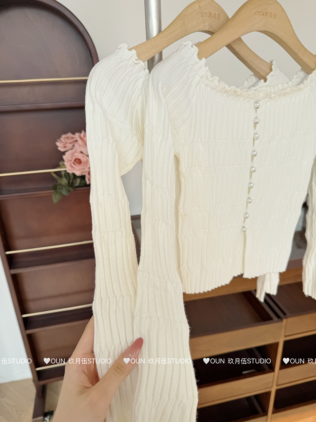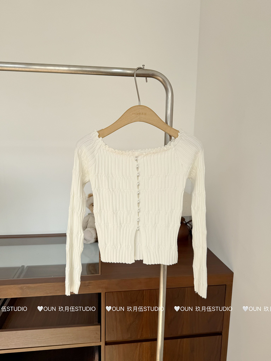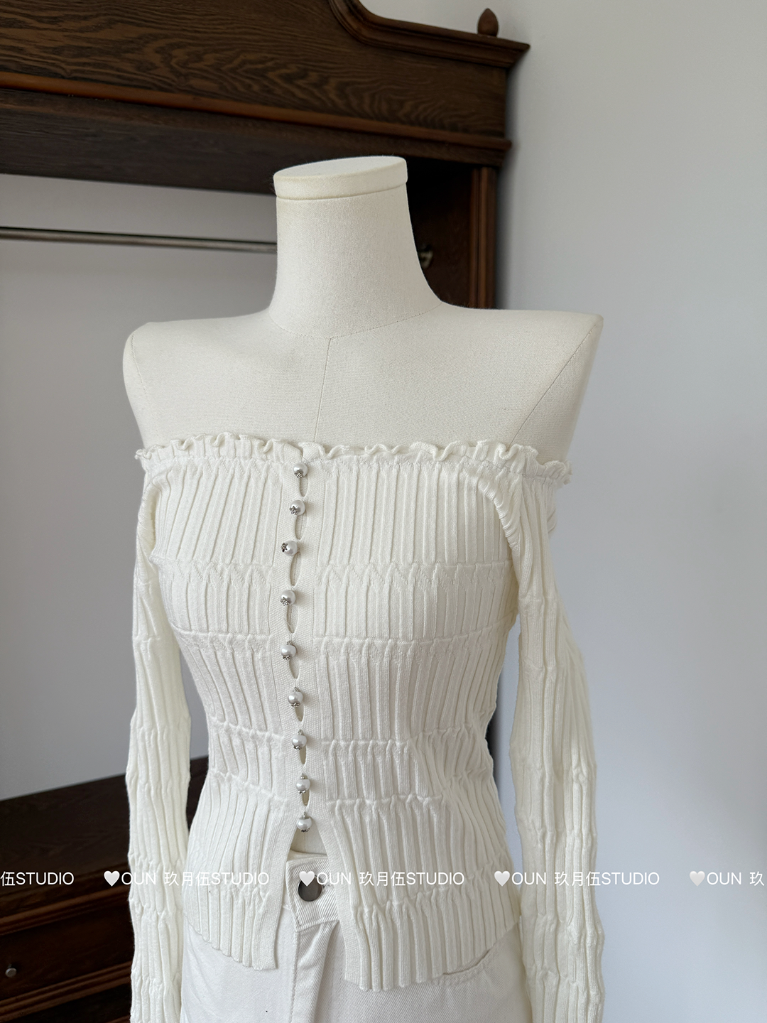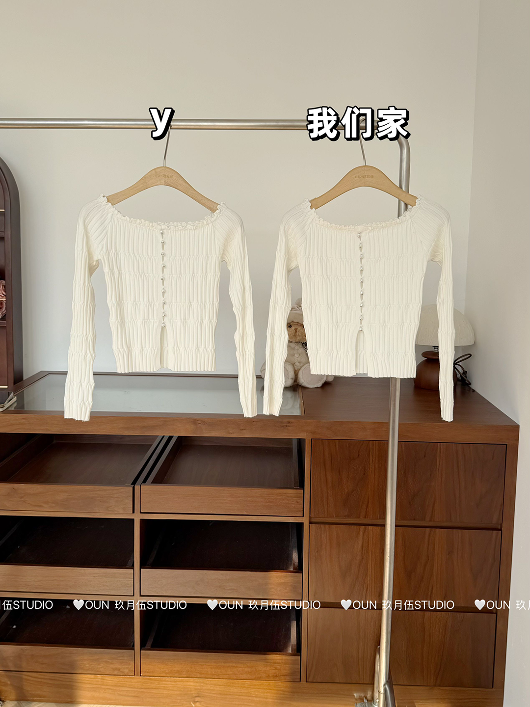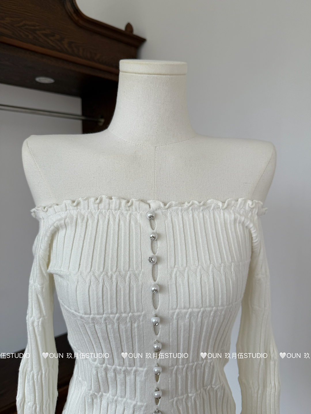 玖月伍【純欲小心機】趙露思同款一字肩針織衫珍珠釦氣質上衣