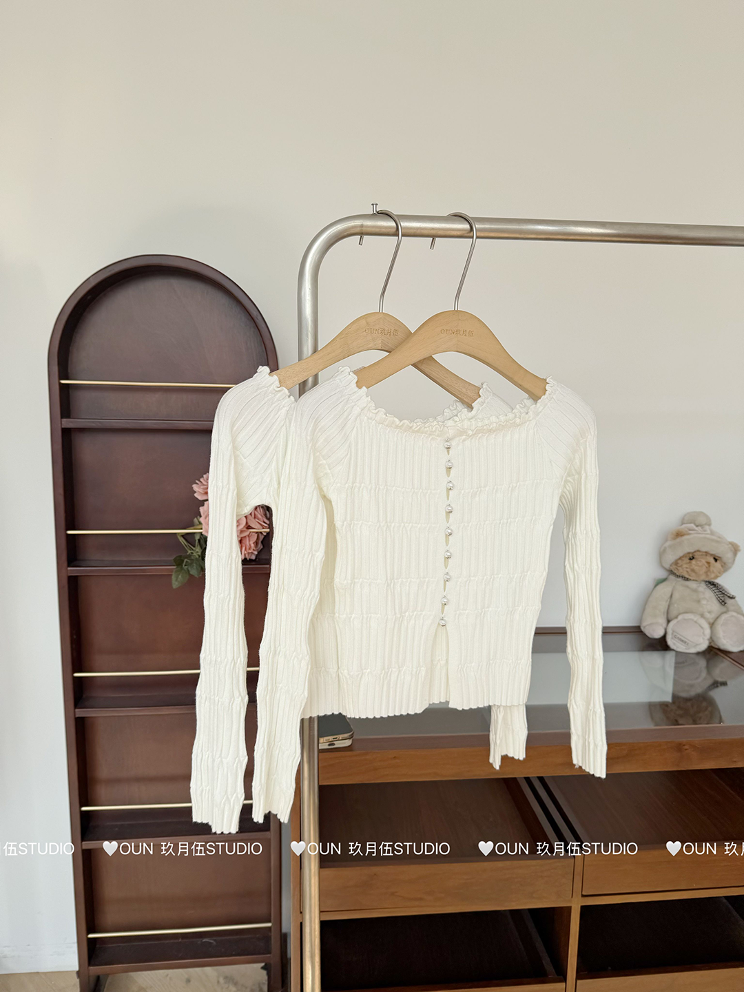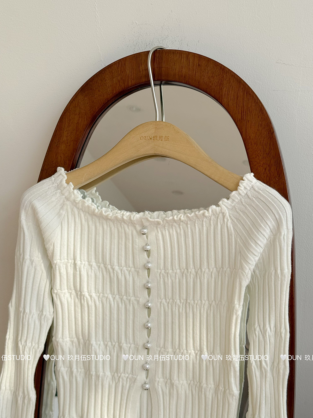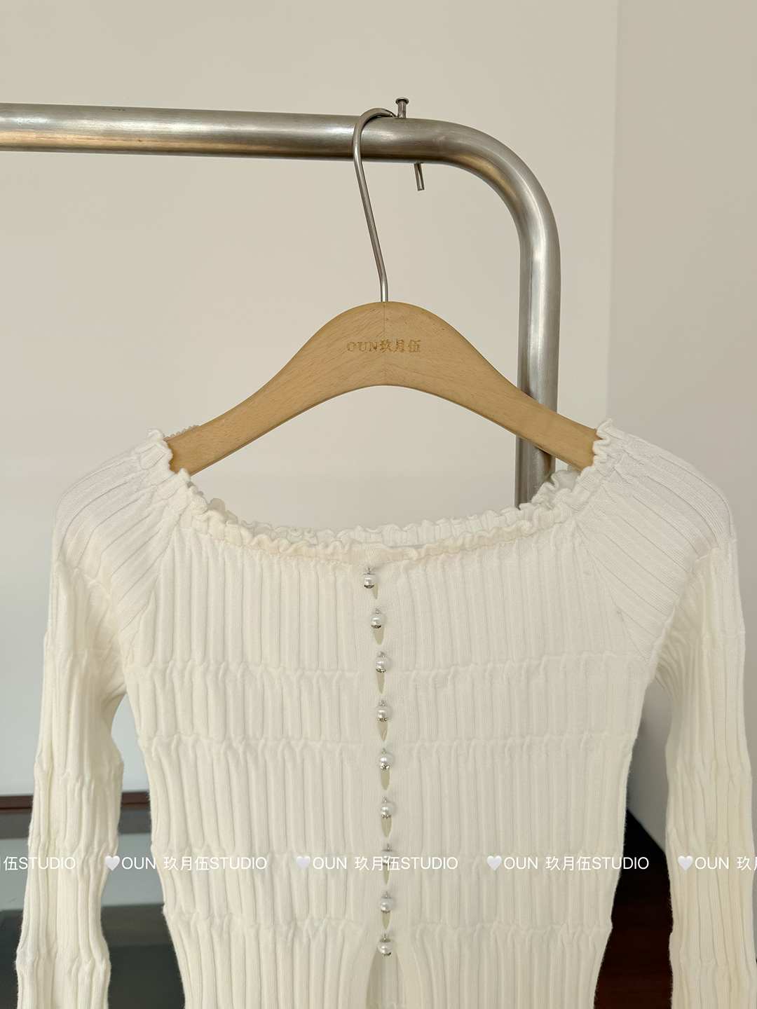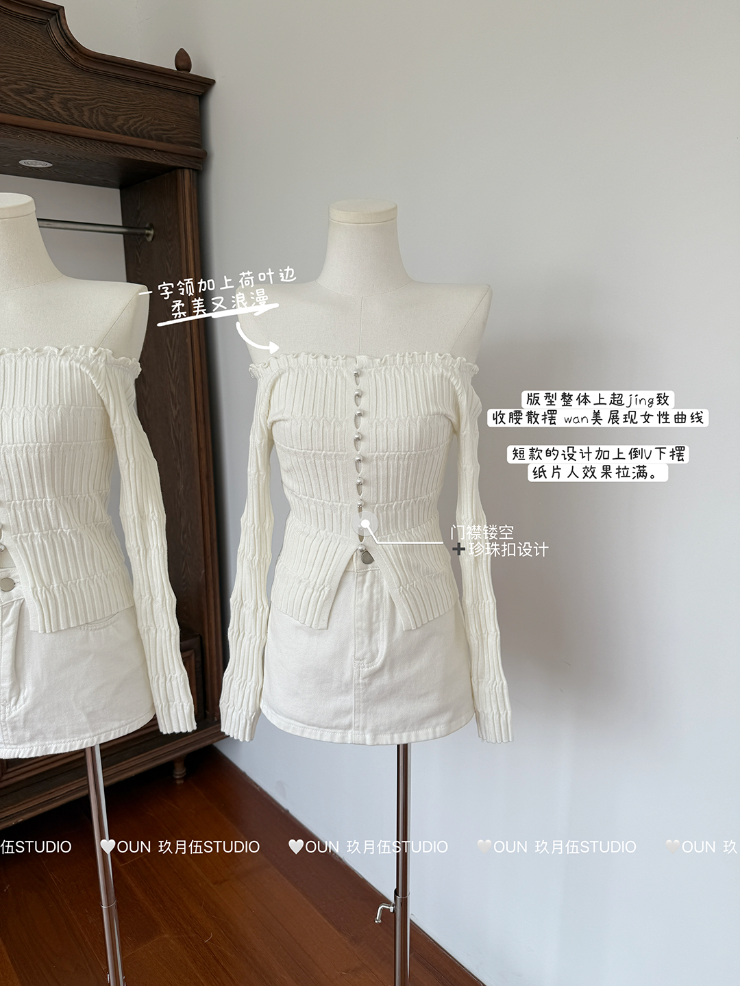 玖月伍【純欲小心機】趙露思同款一字肩針織衫珍珠釦氣質上衣