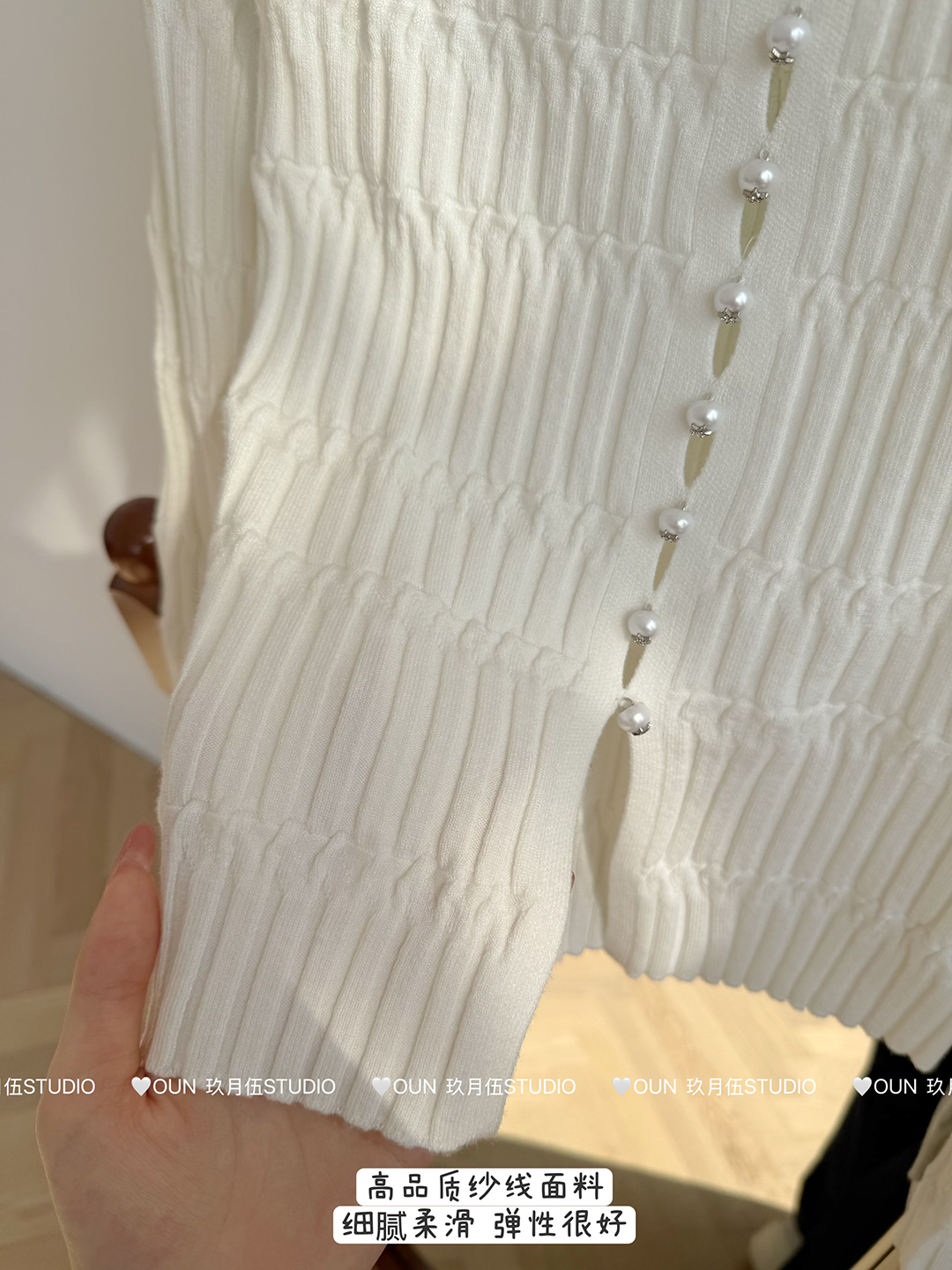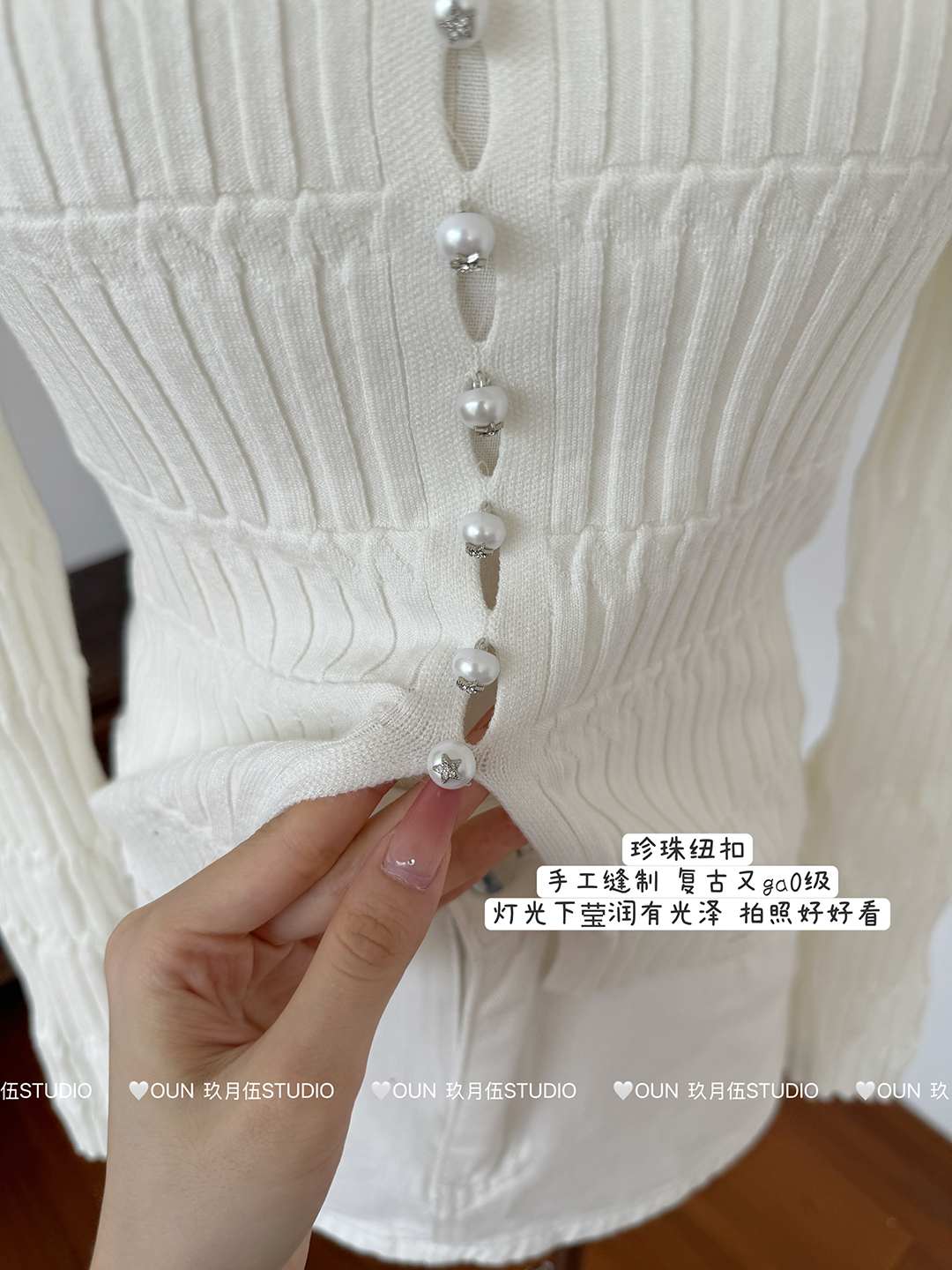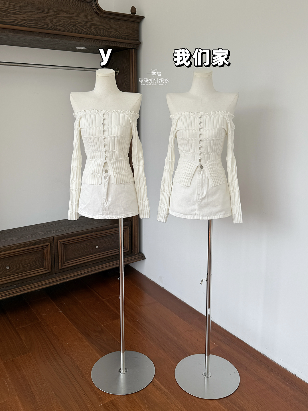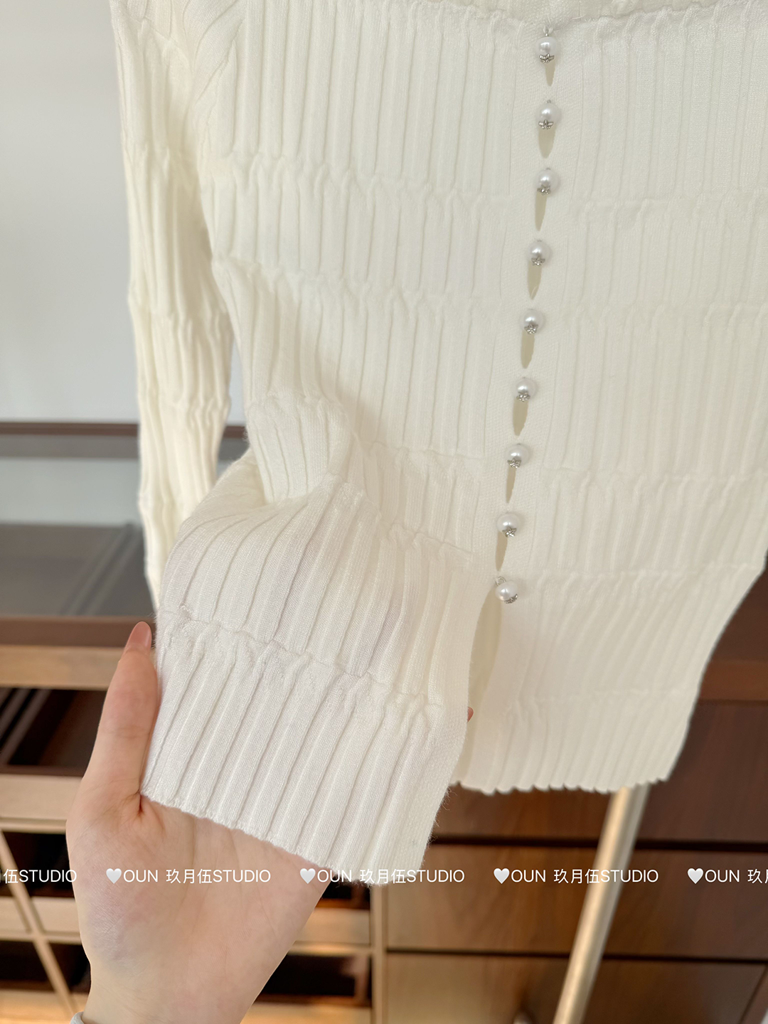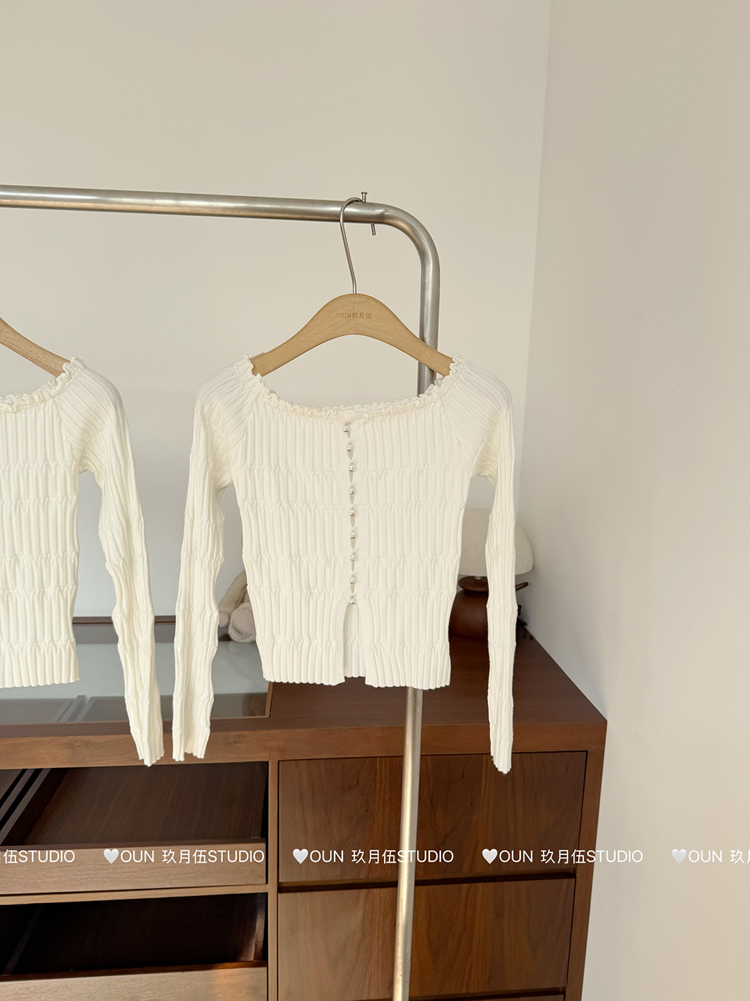 玖月伍【純欲小心機】趙露思同款一字肩針織衫珍珠釦氣質上衣