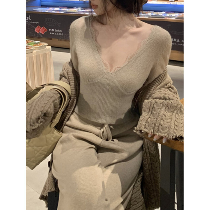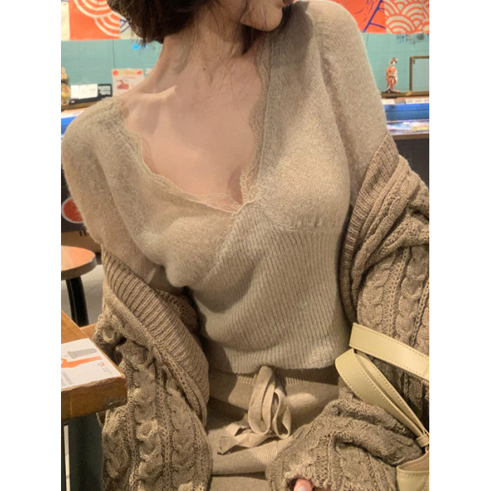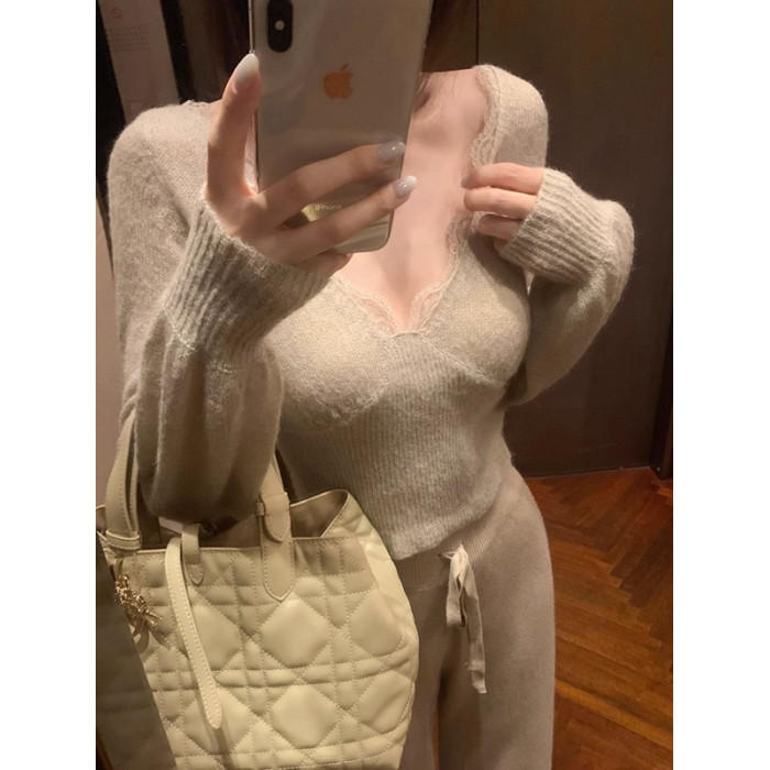 高級感韓系蕾絲針織打底衫女早秋季2025新款純欲v領內搭毛衣上衣
