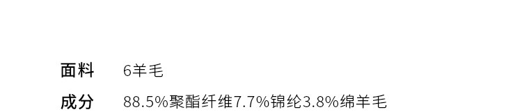 材質成分 聚酯纖維88.5% 聚醯胺纖維(錦綸)7.7% 綿羊毛3.8%